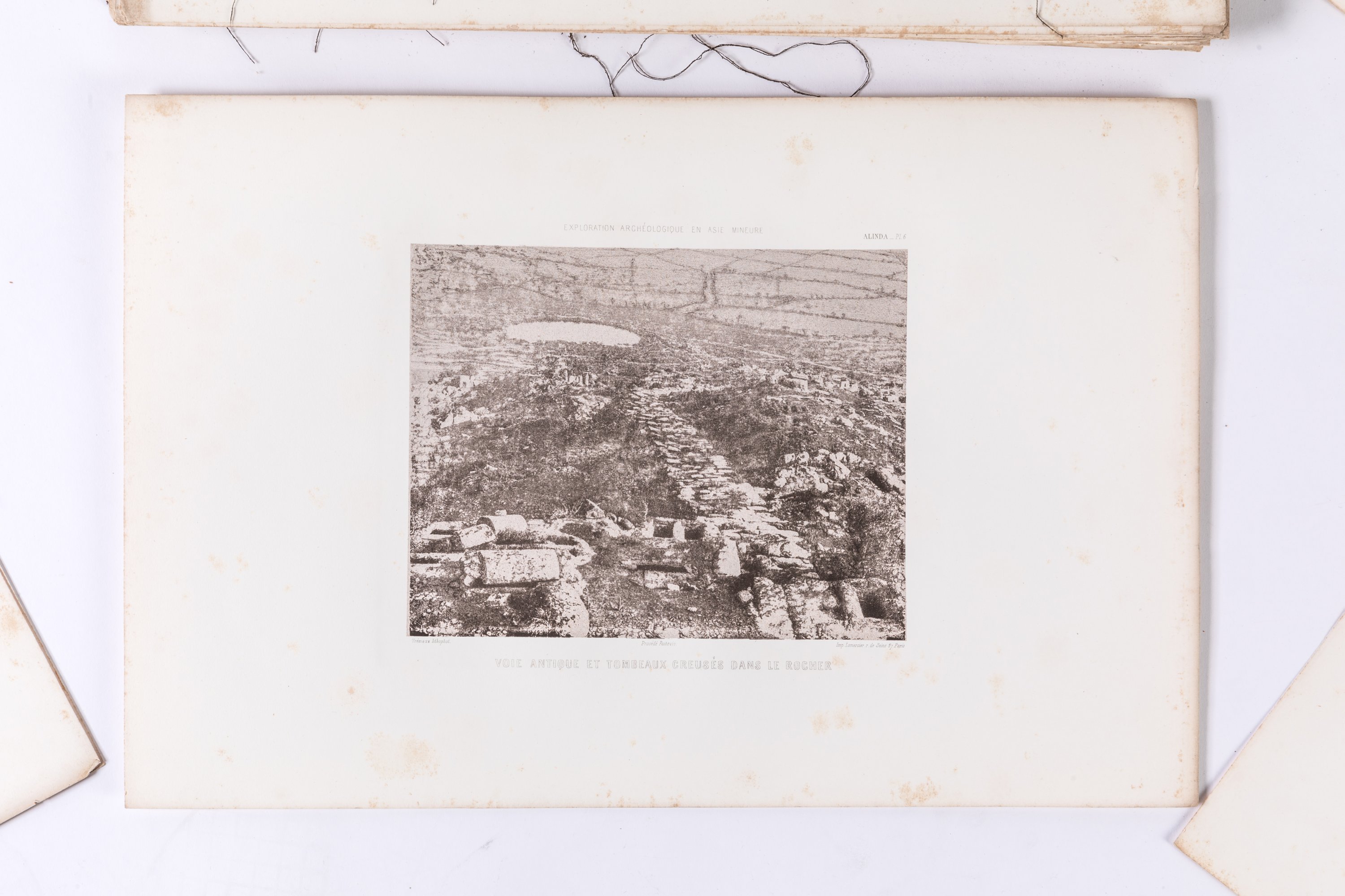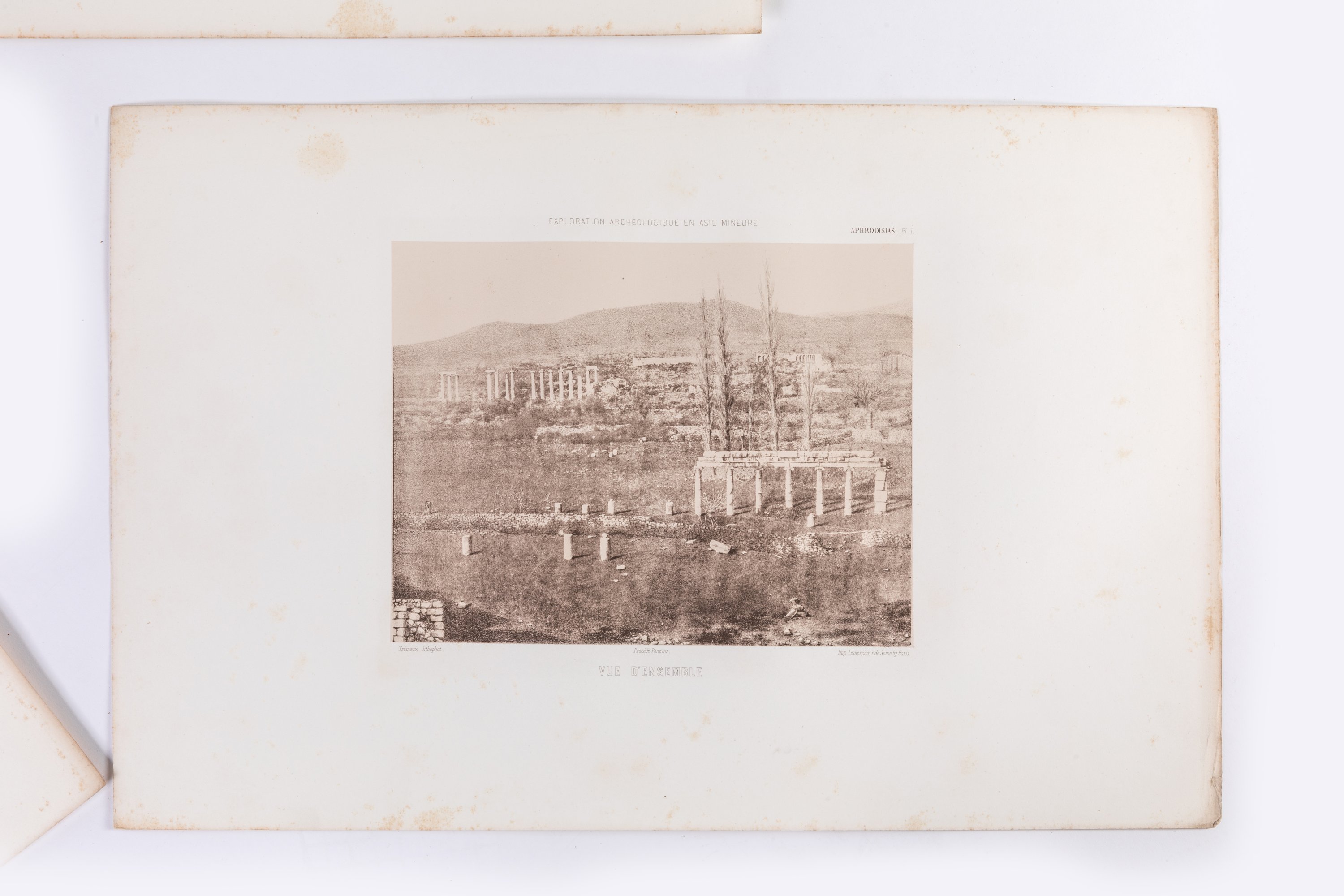 Un volume in-folio oblong, en feuillets sous chemise cartonnée comprenant soixante-treize lithophotographies selon le procédé Poitevin, vingt-quatre plans et quatre feuilles de textes.