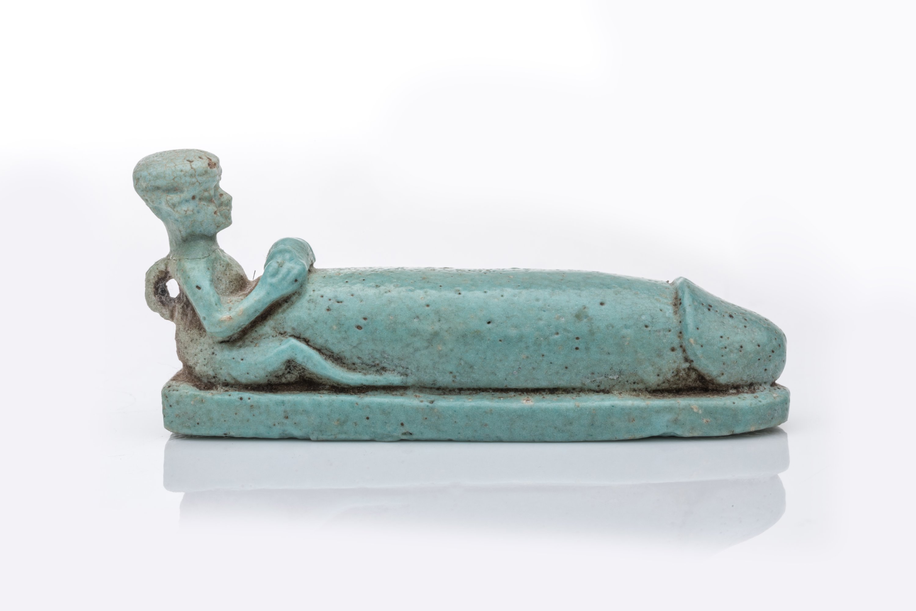 L’amulette, pourvue d’une bélière de suspension dans le dos du personnage, représente une figure masculine de petite taille, aux proportions particulières : ses bras trop longs, ses jambes courtes et la forme du crâne sont parmi les traits physiques d’un nain qui ont impressionné les artistes égyptiens. Selon une croyance populaire dans l’Antiquité, le nain est pourvu d’un pénis surdimensionné, trois à quatre fois plus imposant que le reste de l’amulette. Les détails anatomiques sont reproduits avec une grande précision et une belle maîtrise, aussi bien pour le pénis, qui est clairement circoncis, que pour le rendu du visage, des mains, des pieds et du dos. Le personnage, qui porte un bonnet plat, est assis sur une longue base plate aux bords arrondis. De ses mains, il est en train de jouer des cymbales, un instrument à percussion représenté ici comme un cylindre. Les amulettes de ce type étaient censées améliorer la puissance sexuelle et générer le désir érotique pour favoriser la procréation. Elles sont parfois en relation avec certaines divinités très populaires, en particulier Ptah-Patèque.