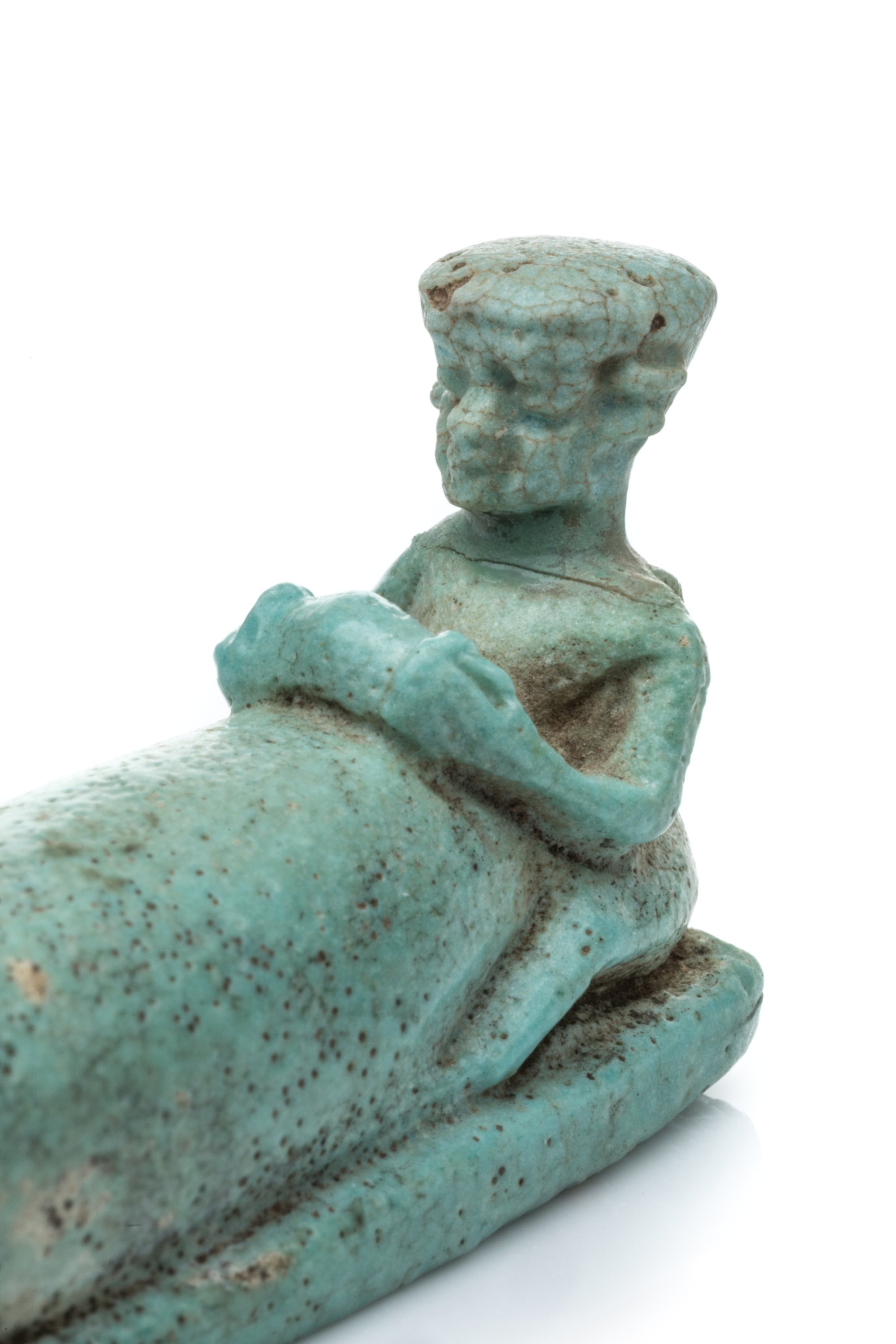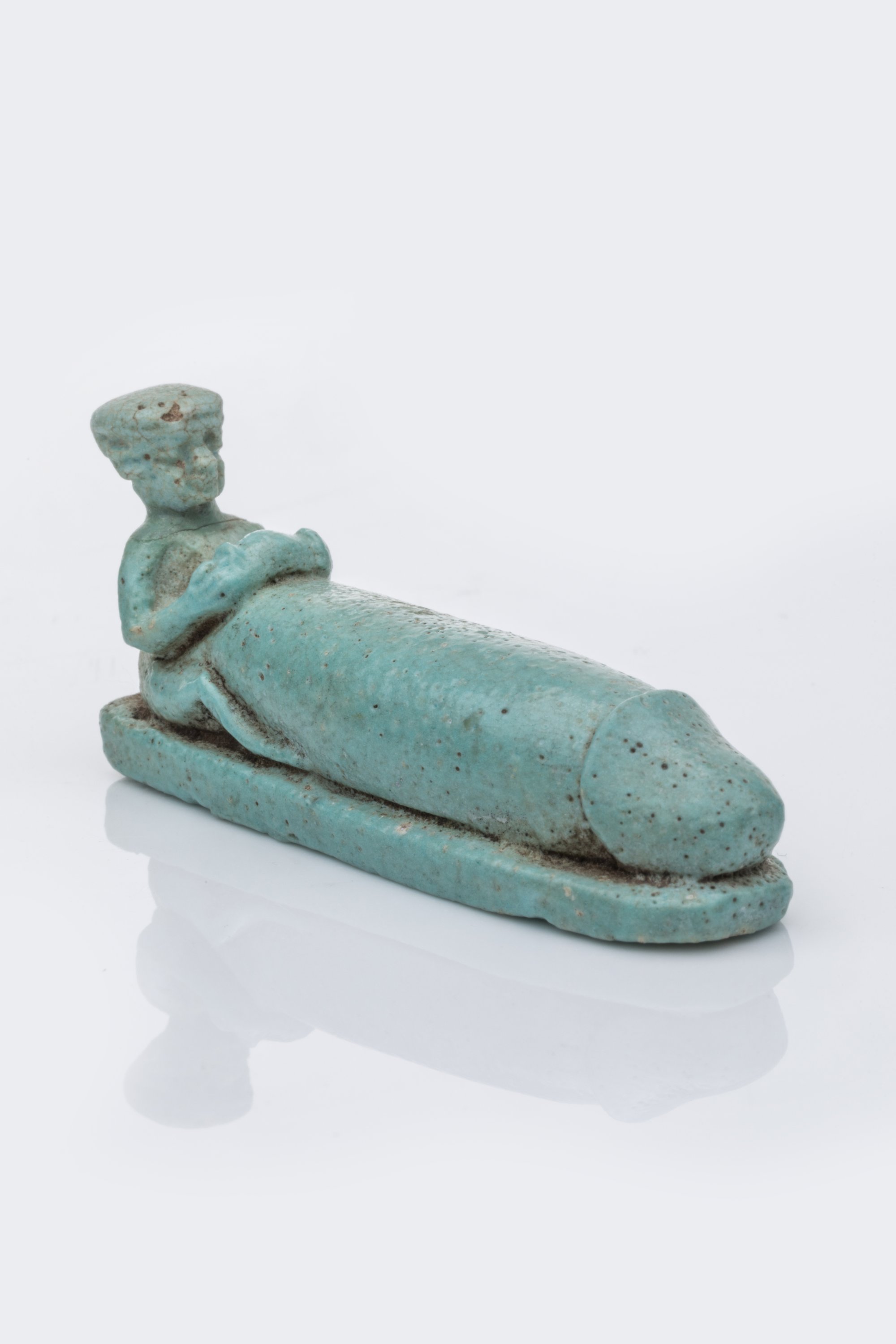 An Egyptian Late Period to Ptolemaic Period faience amulet representing an ithyphallic dwarf.