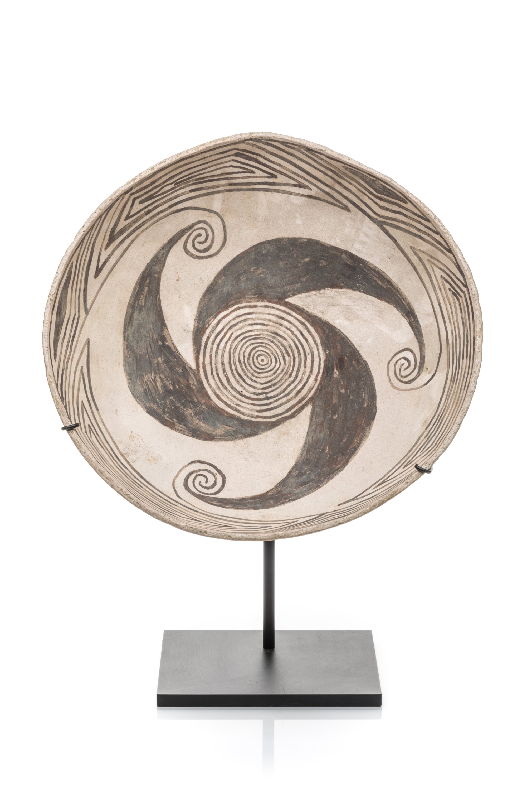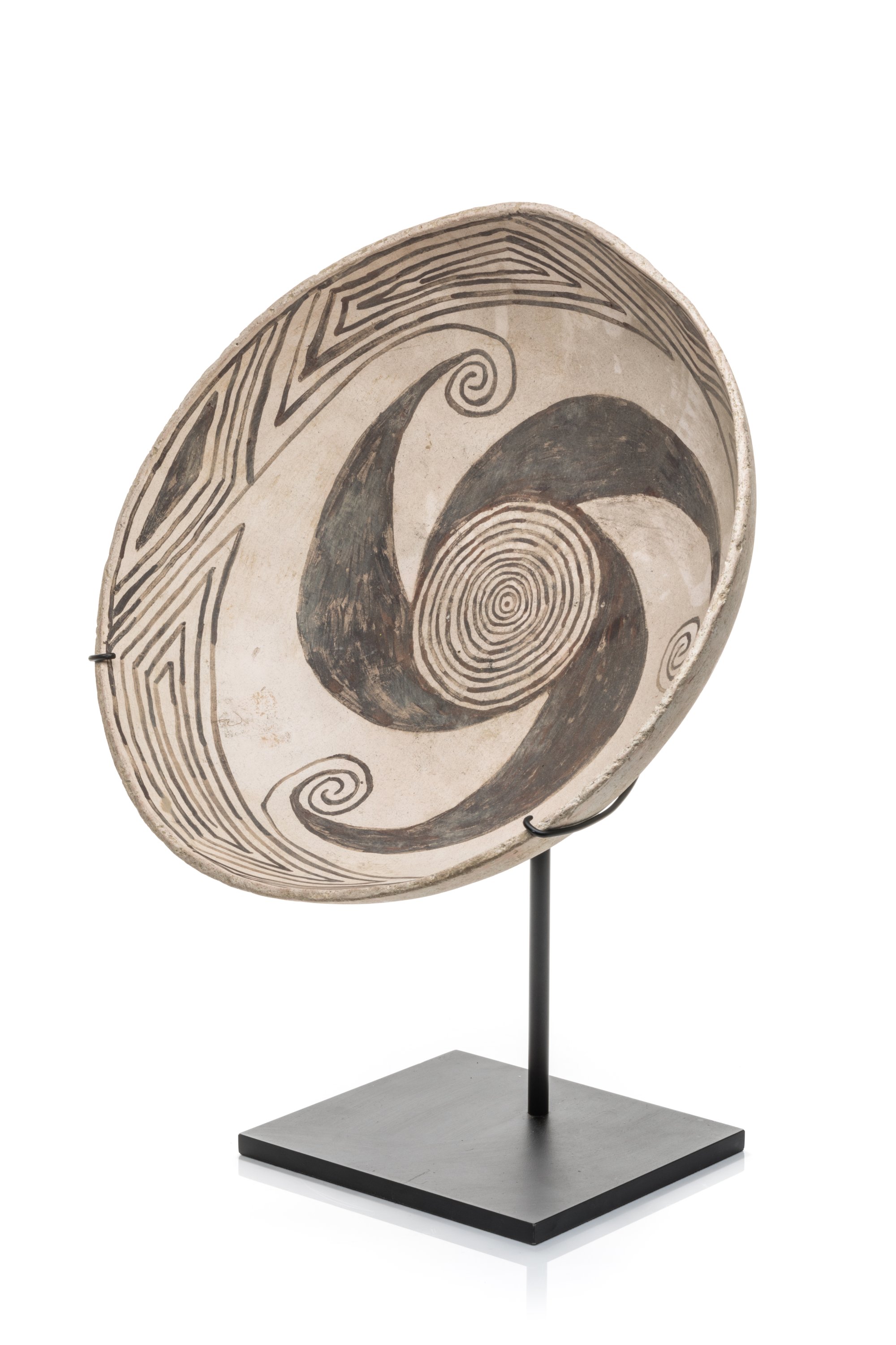 en terre cuite blanche à décor géométrique de spirales peint en noir.