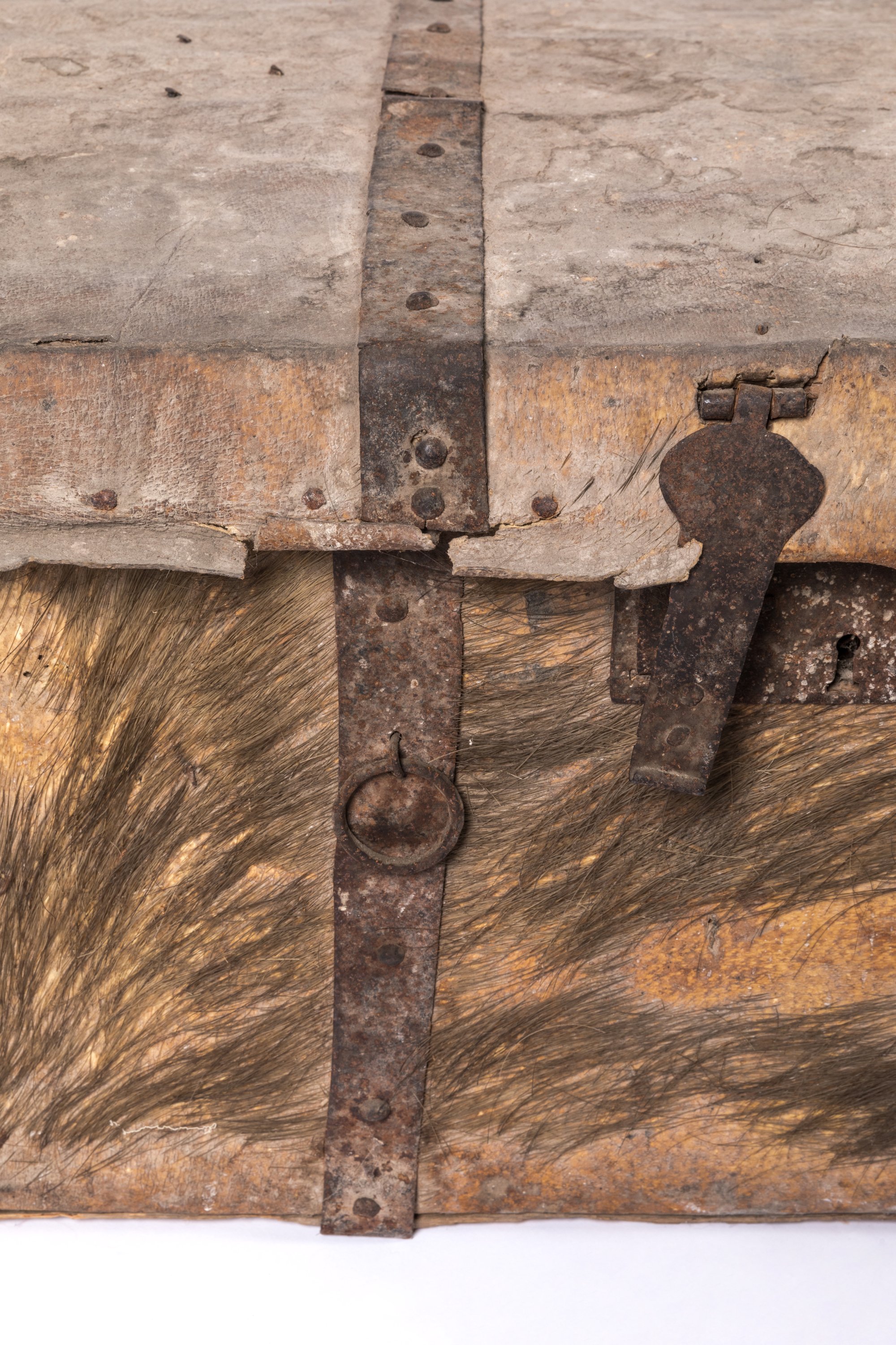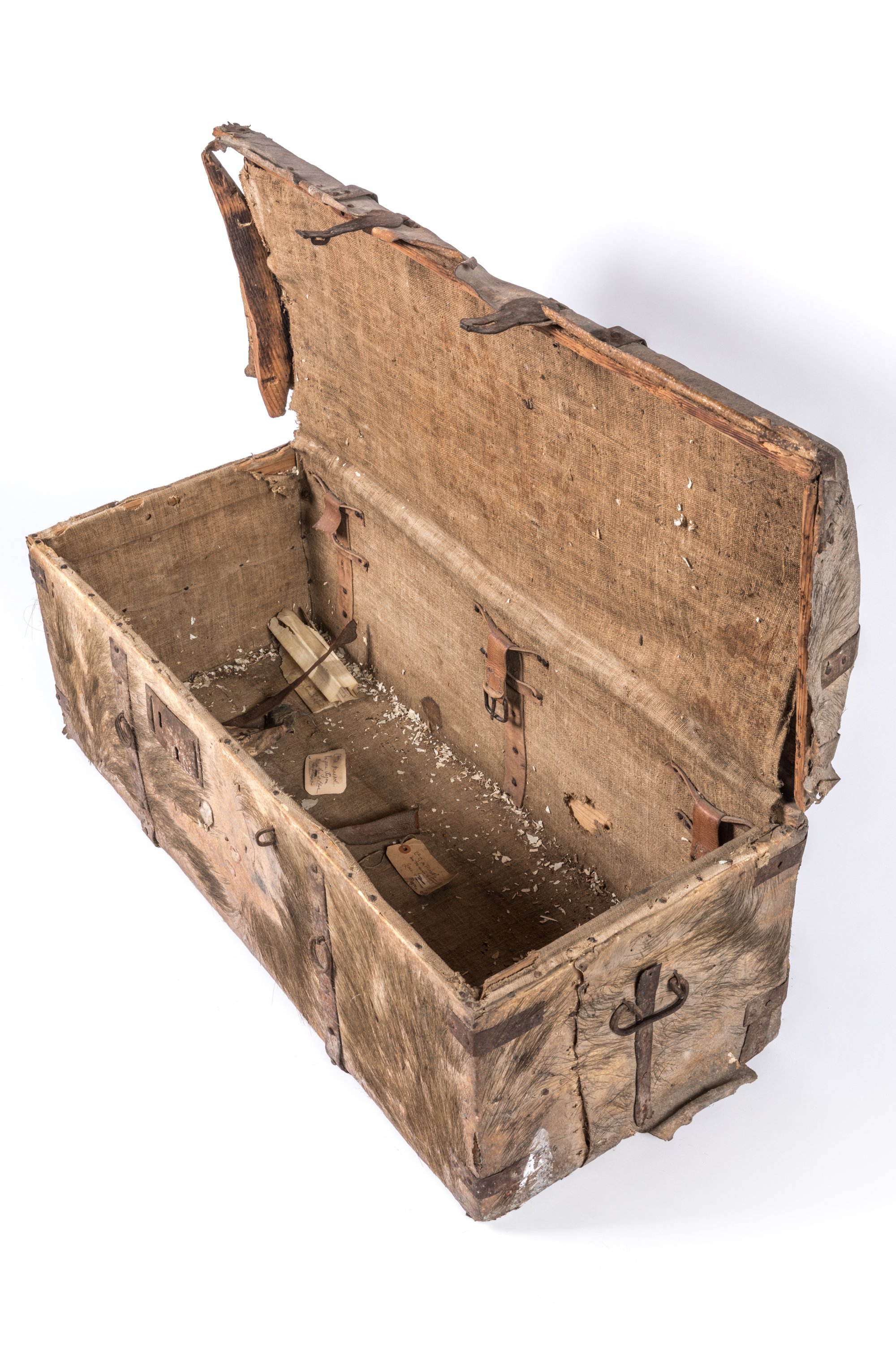 de forme rectangulaire au couvercle légèrement bombé en bois recouvert de peau de bête sauvage (loup ? reste éléments de fourrure). L'intérieur en toile de jute avec sangles de cuir. Renforts et bardages métalliques rivetées. Poignée latérale, serrure double et anneaux.