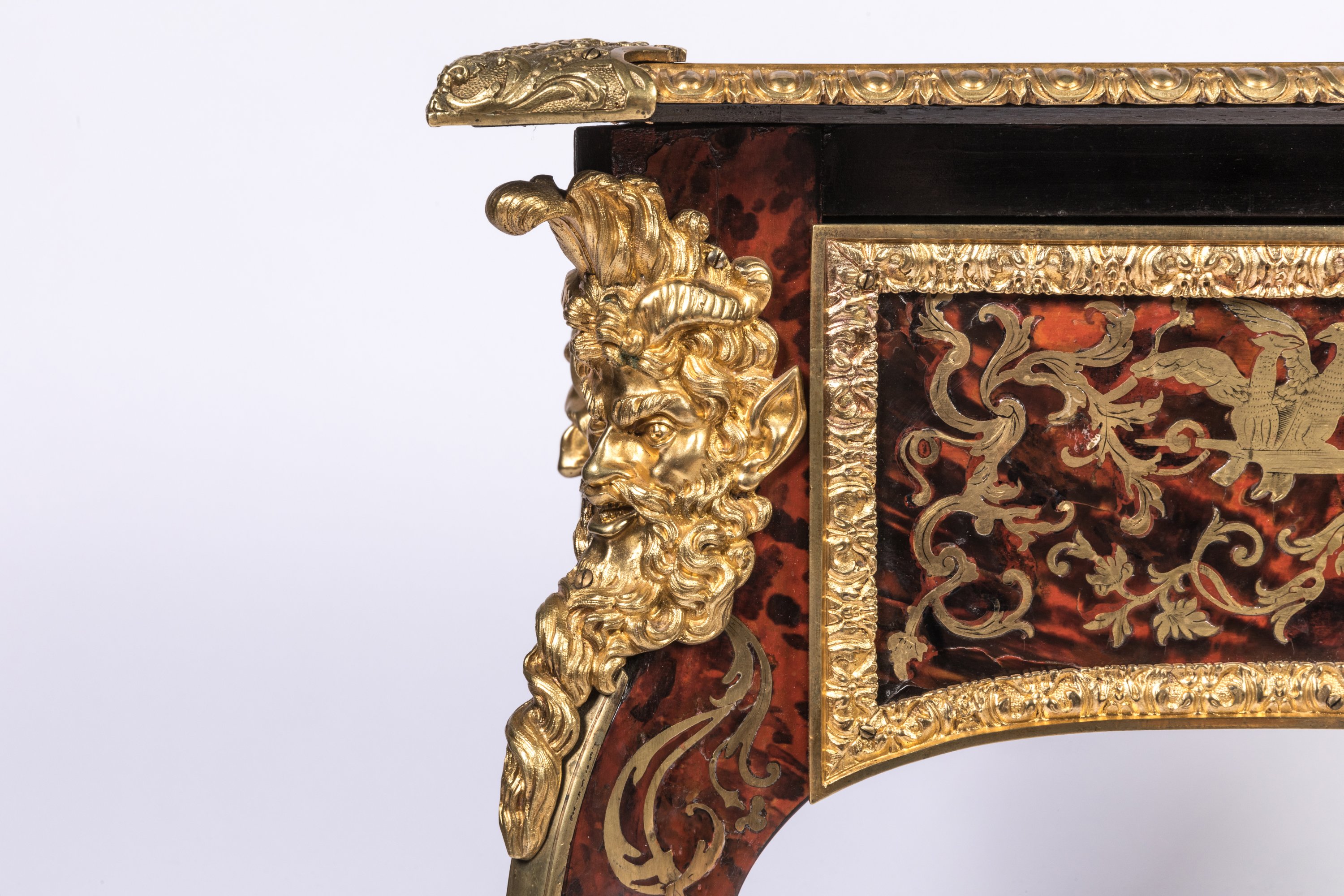 Riche ornementation en bronze doré, au centre d'écusson et de draperies, sur les côtés de masques de faune feuillagé, sur les angles de chutes de faunes, et les sabots feuillagés.