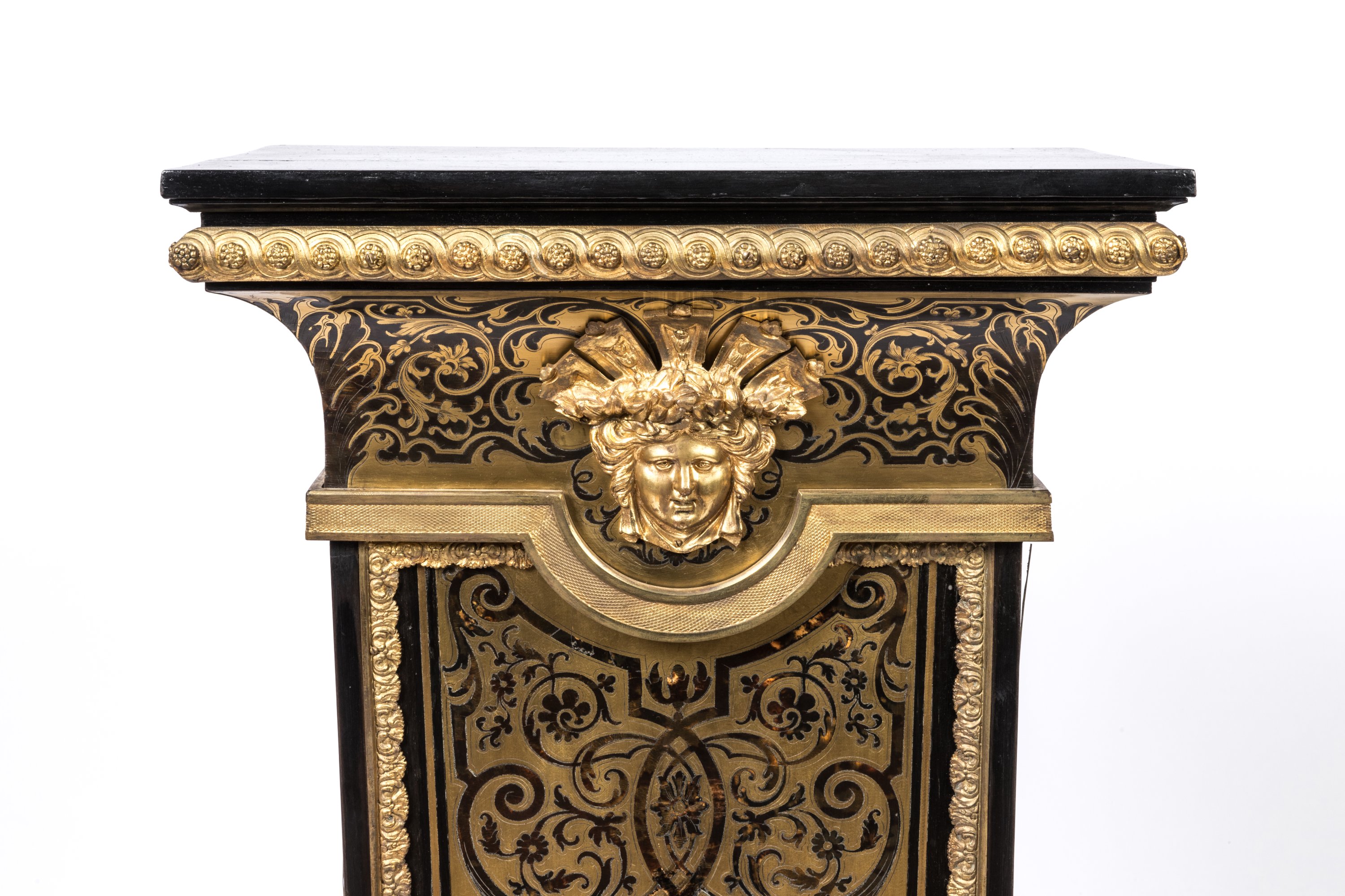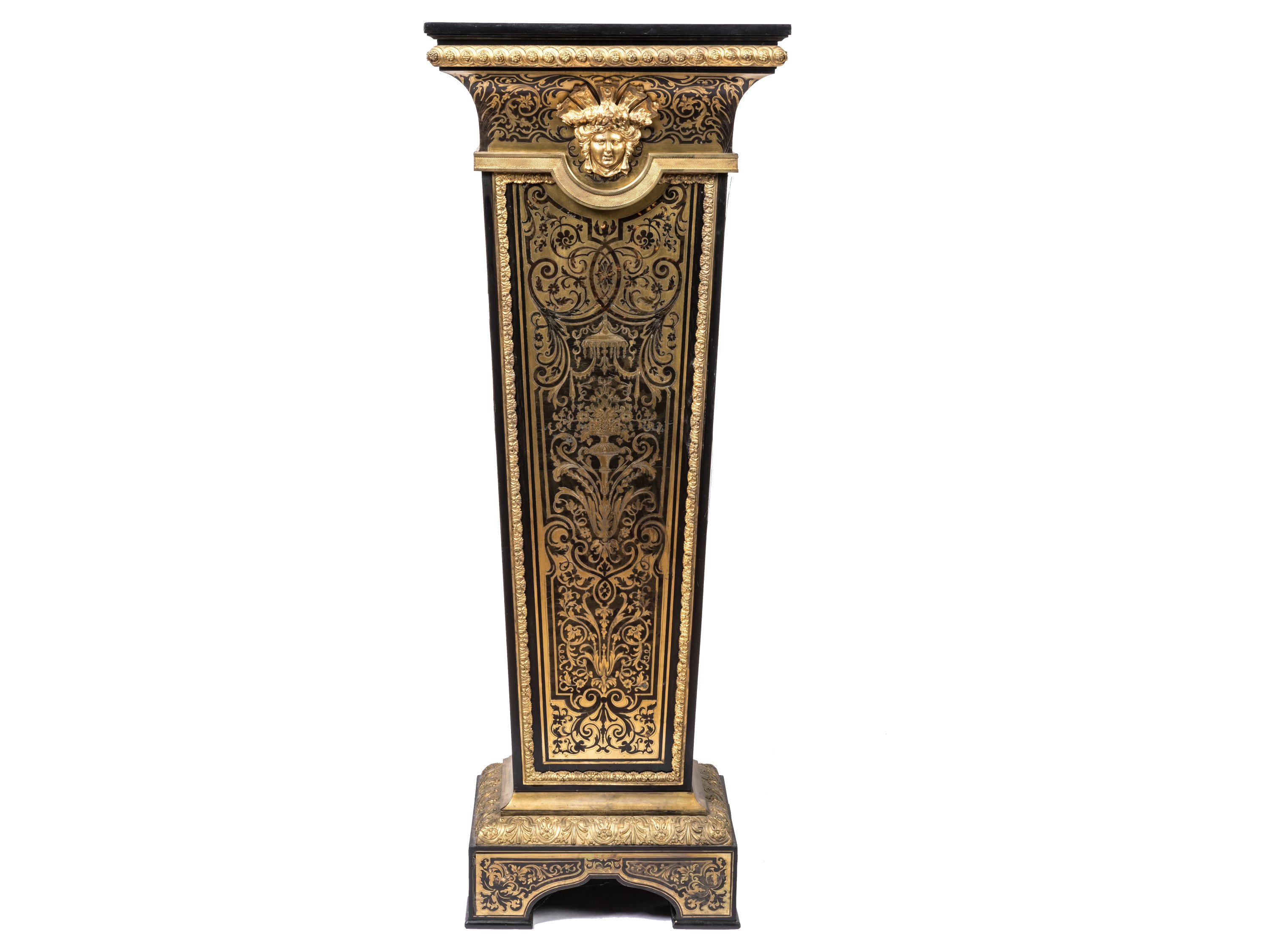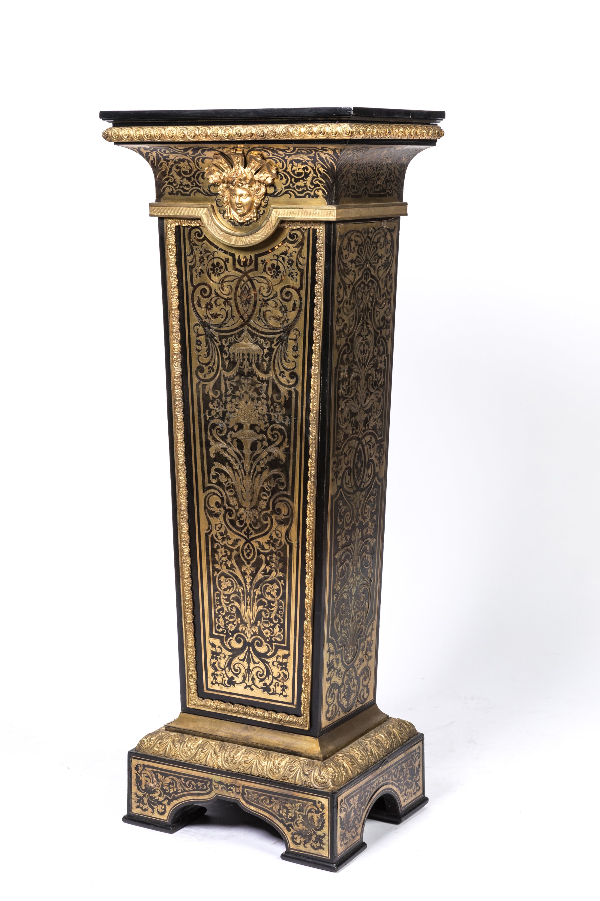 A Napoleon III period "Boulle" marquetry pedestal made of tortoise shell and brass on an ebony background. Louis XIV style.