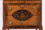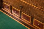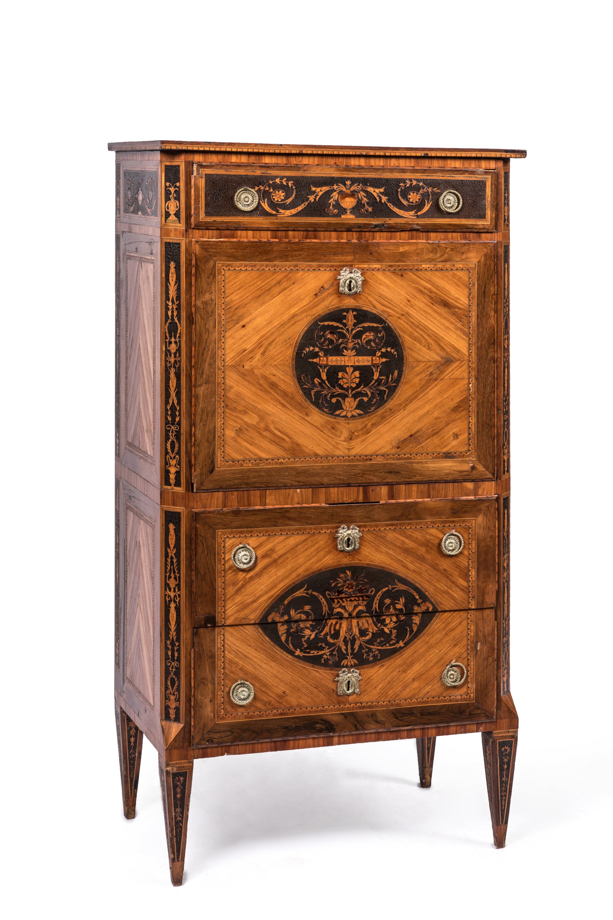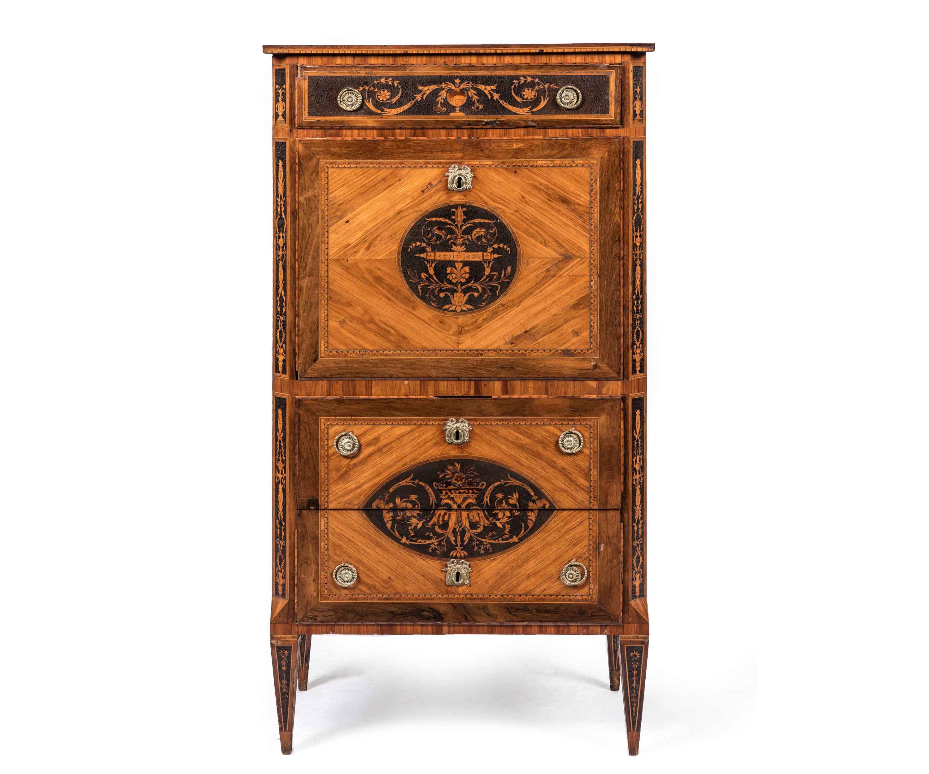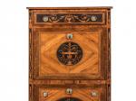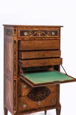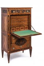 À pans coupés et pieds pyramidaux - il ouvre à un tiroir, un abattant dissimulant de nombreux petits tiroirs - et dans la partie inférieure par deux tiroirs sans traverse.