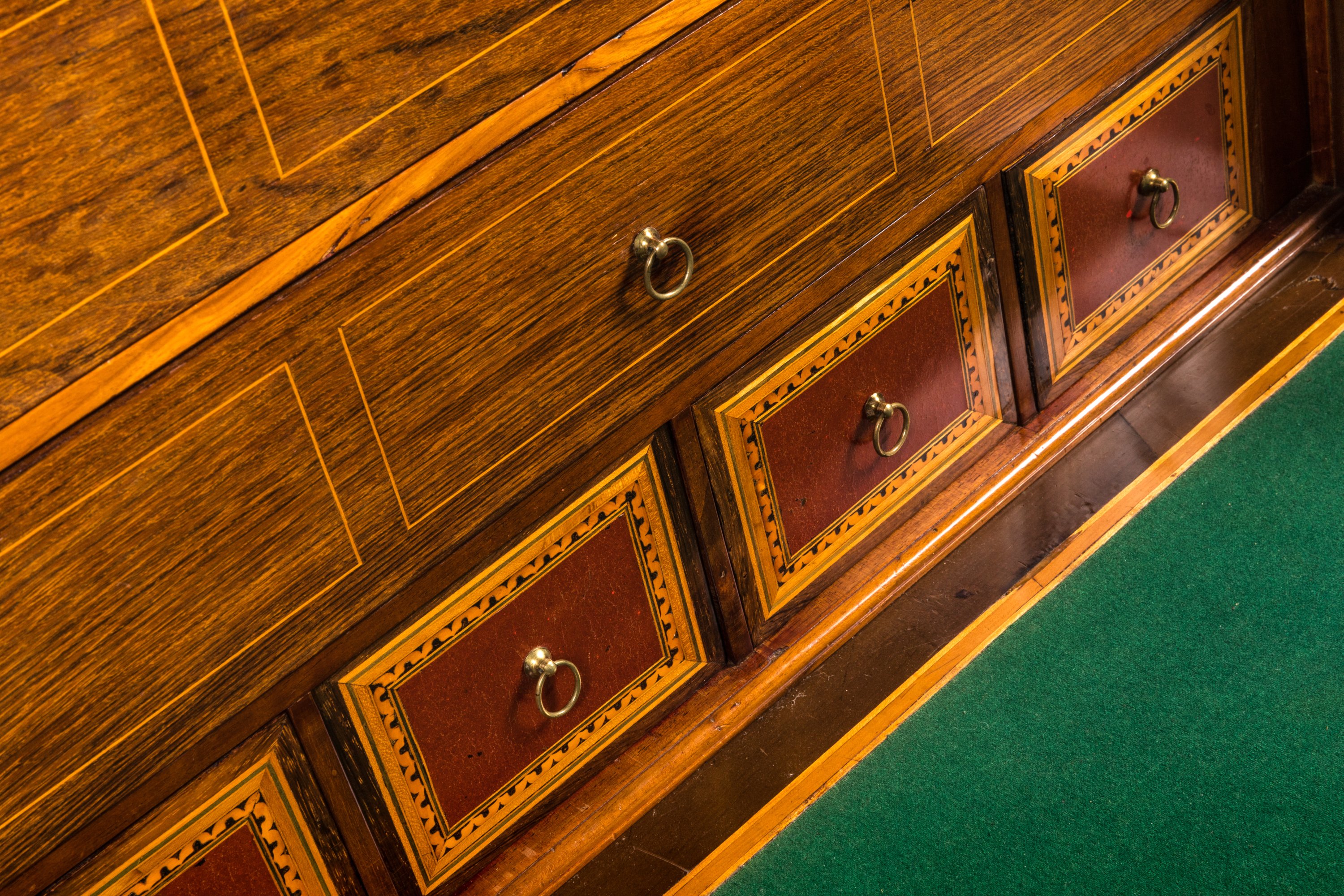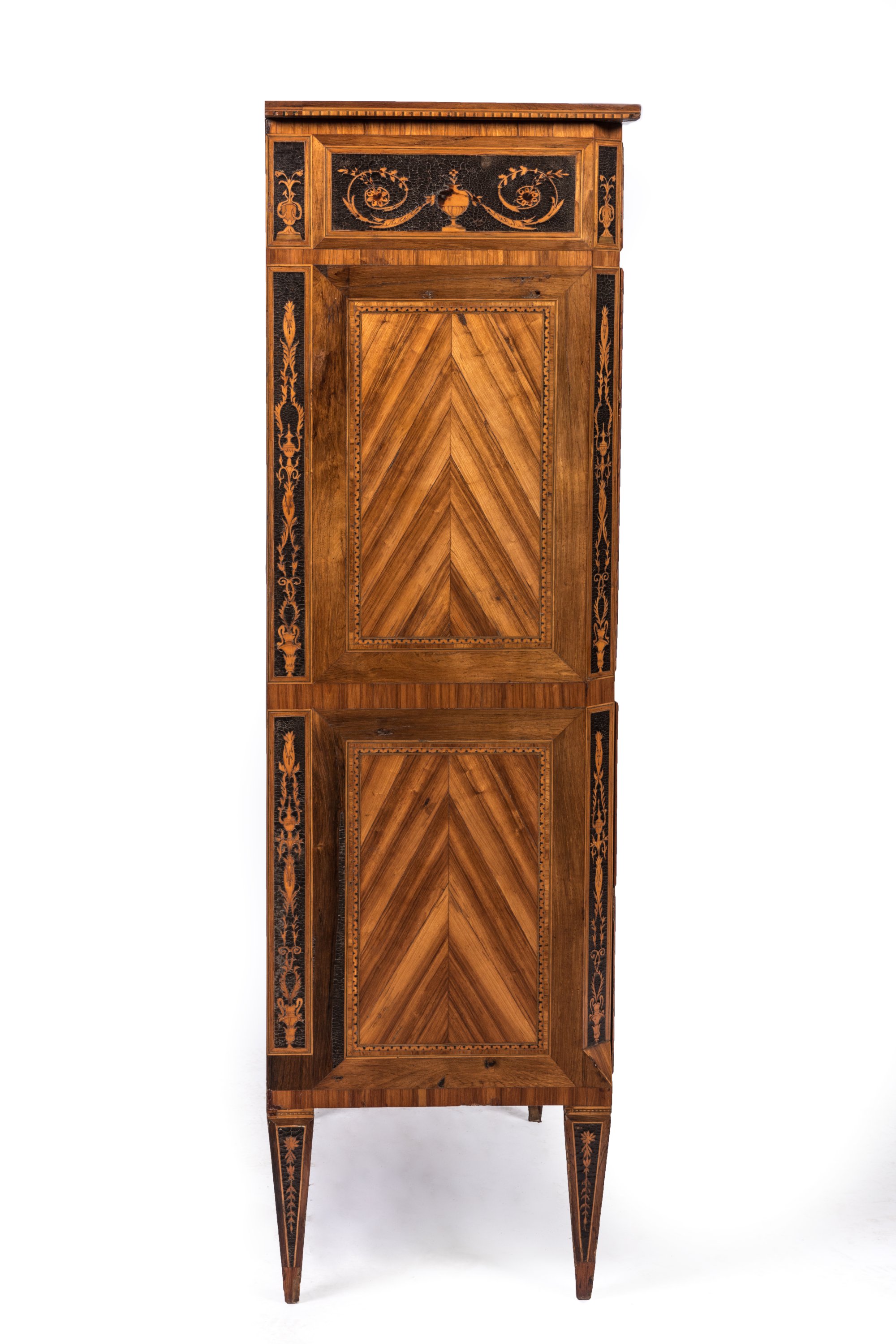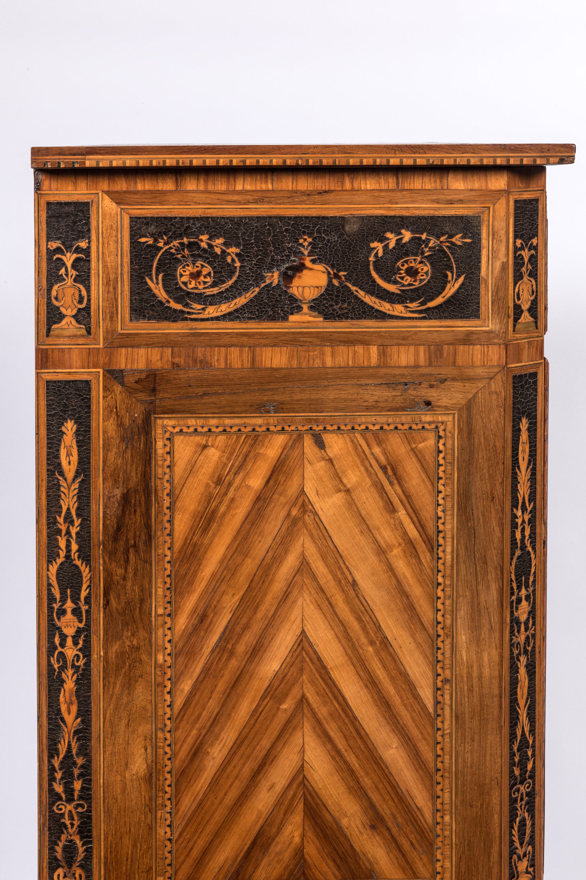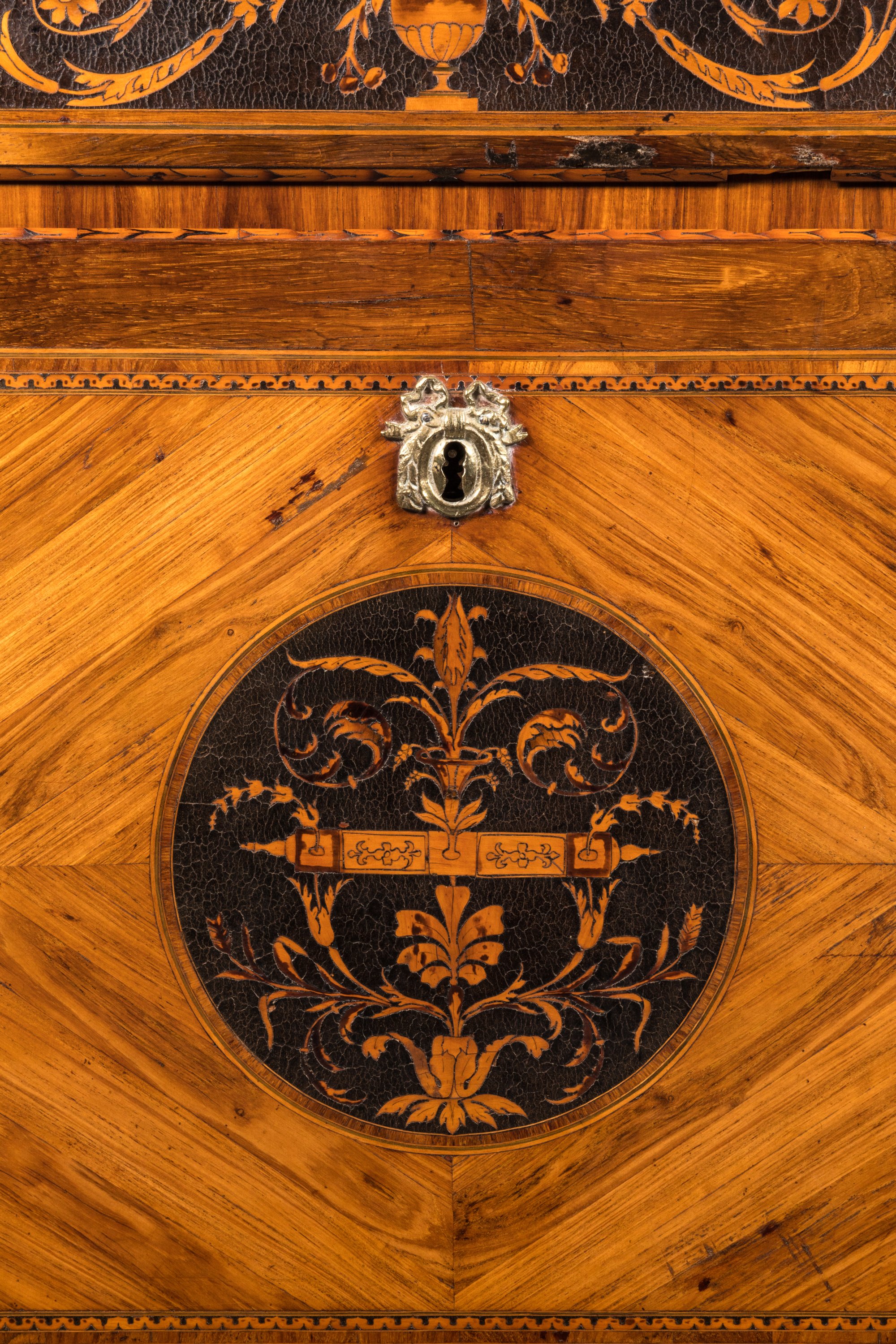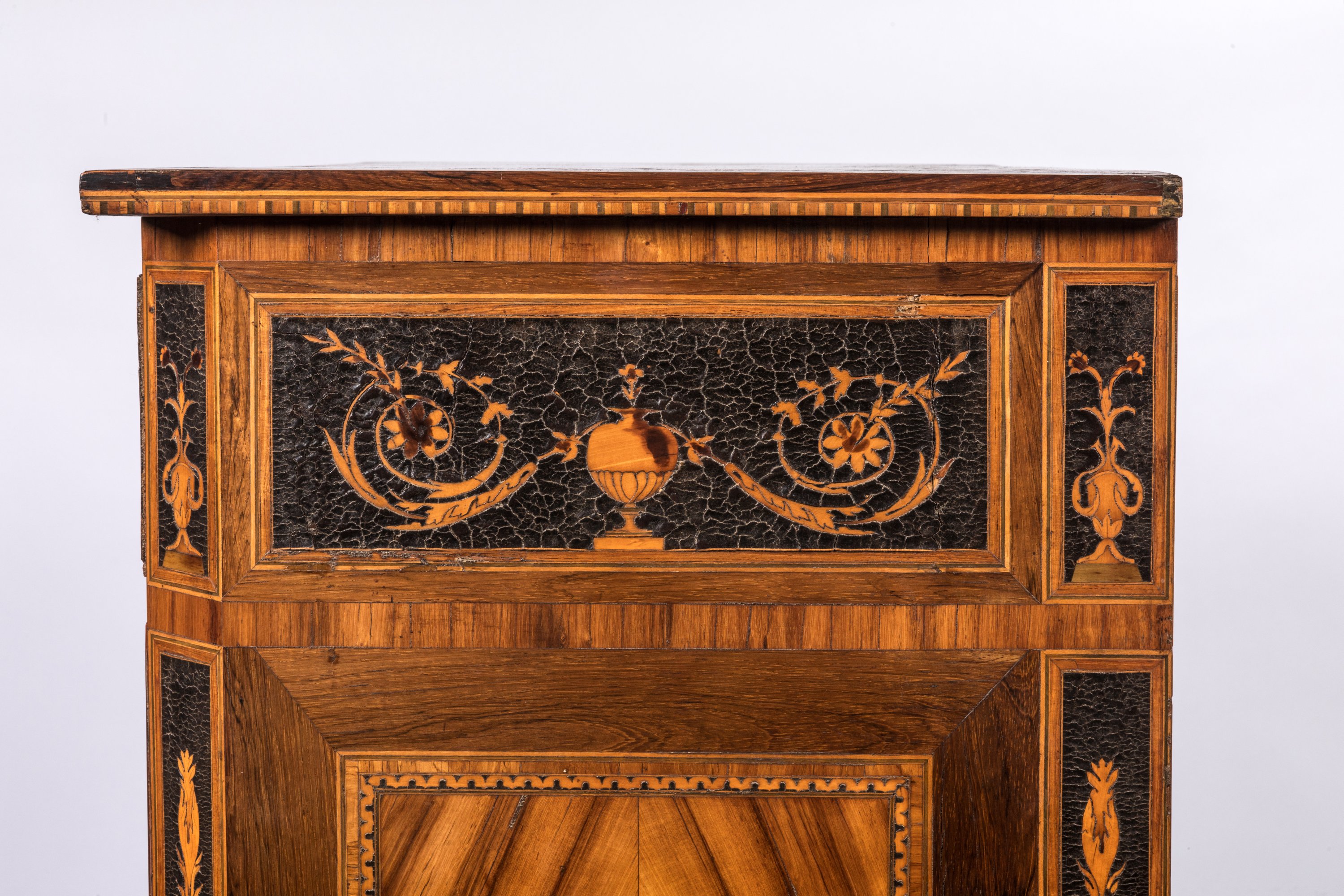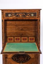 en bois de placage et marqueterie de bois divers, avec applications de cuir. Riche ornementation de vases sur piédouche d'où s'échappent fleurs et entrelacs.