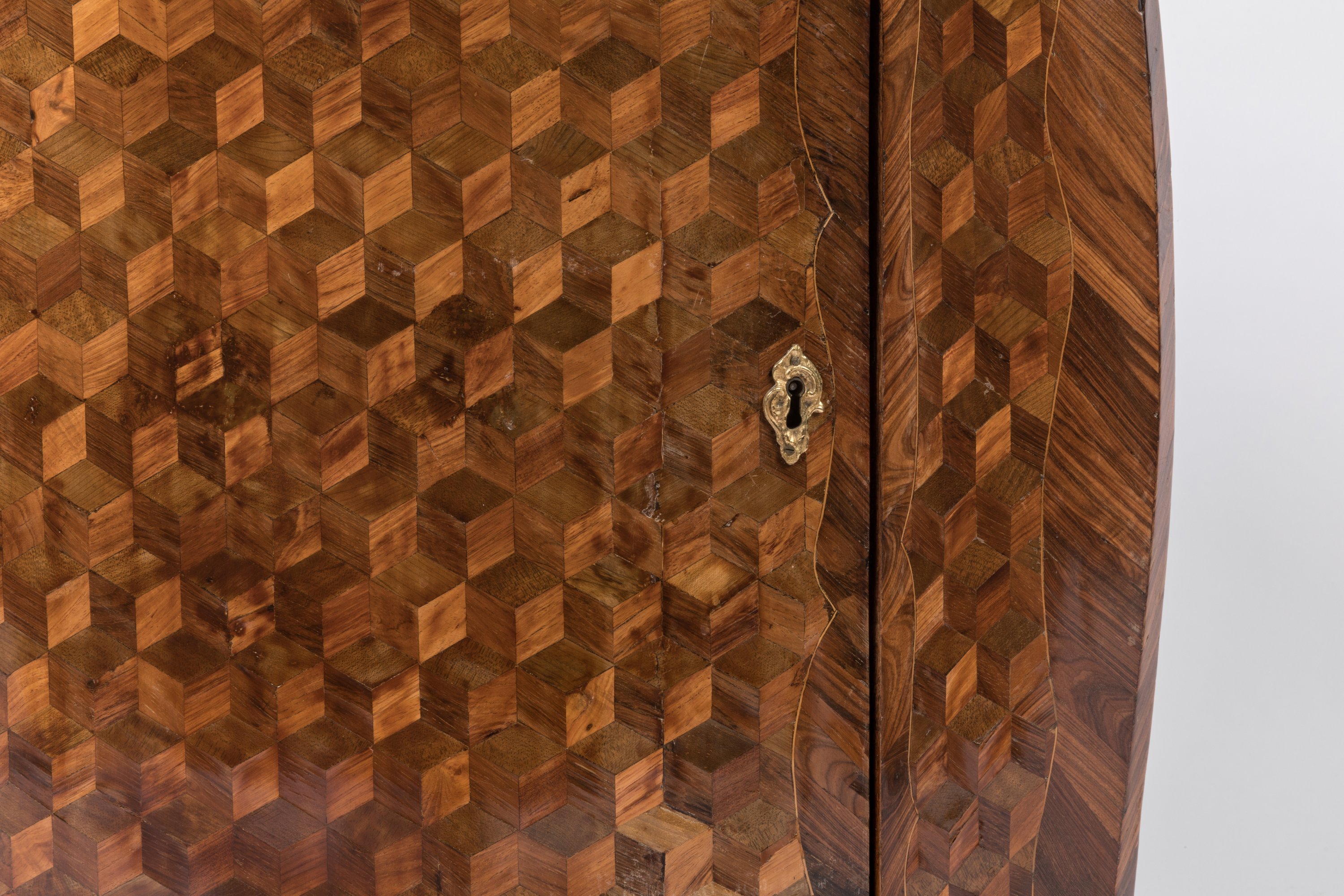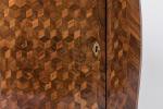 en bois de placage, ornée d'une marqueterie en cubes. Larges montants en doucine, reposant sur un piétement légèrement cambré.