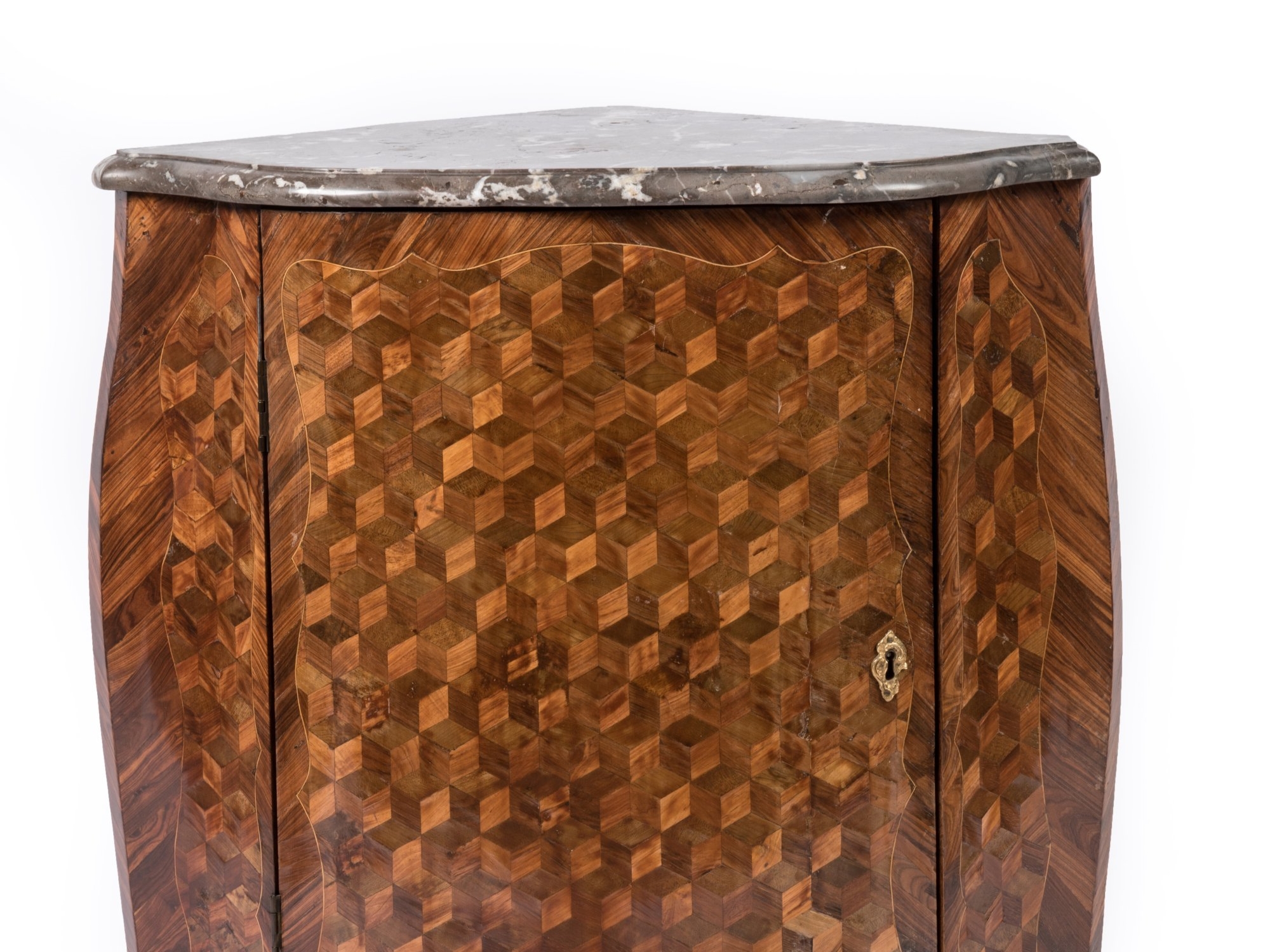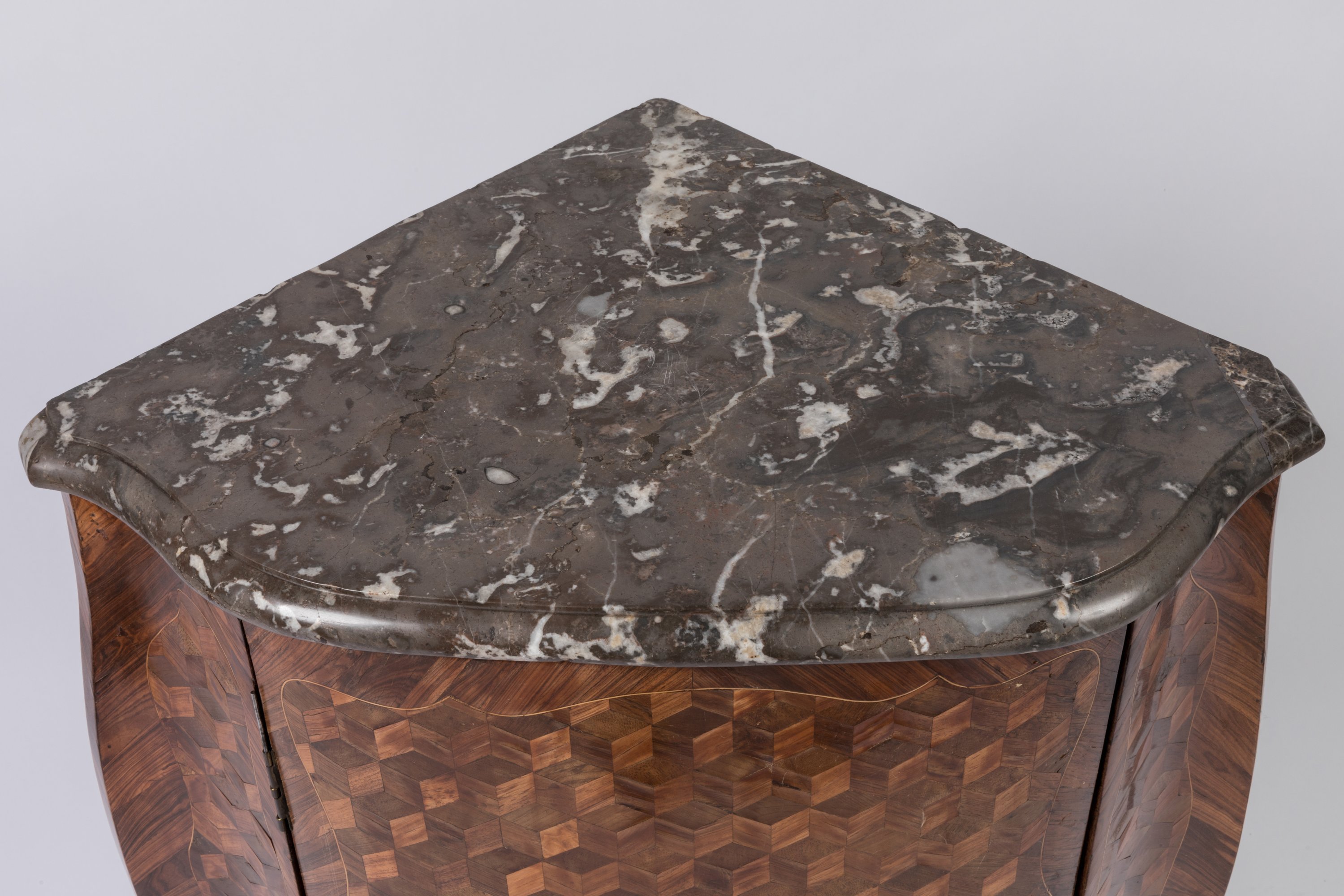 A Louis XVI period veneer and marquetry encoignure by Léonard Boudin. With a grey marble top.