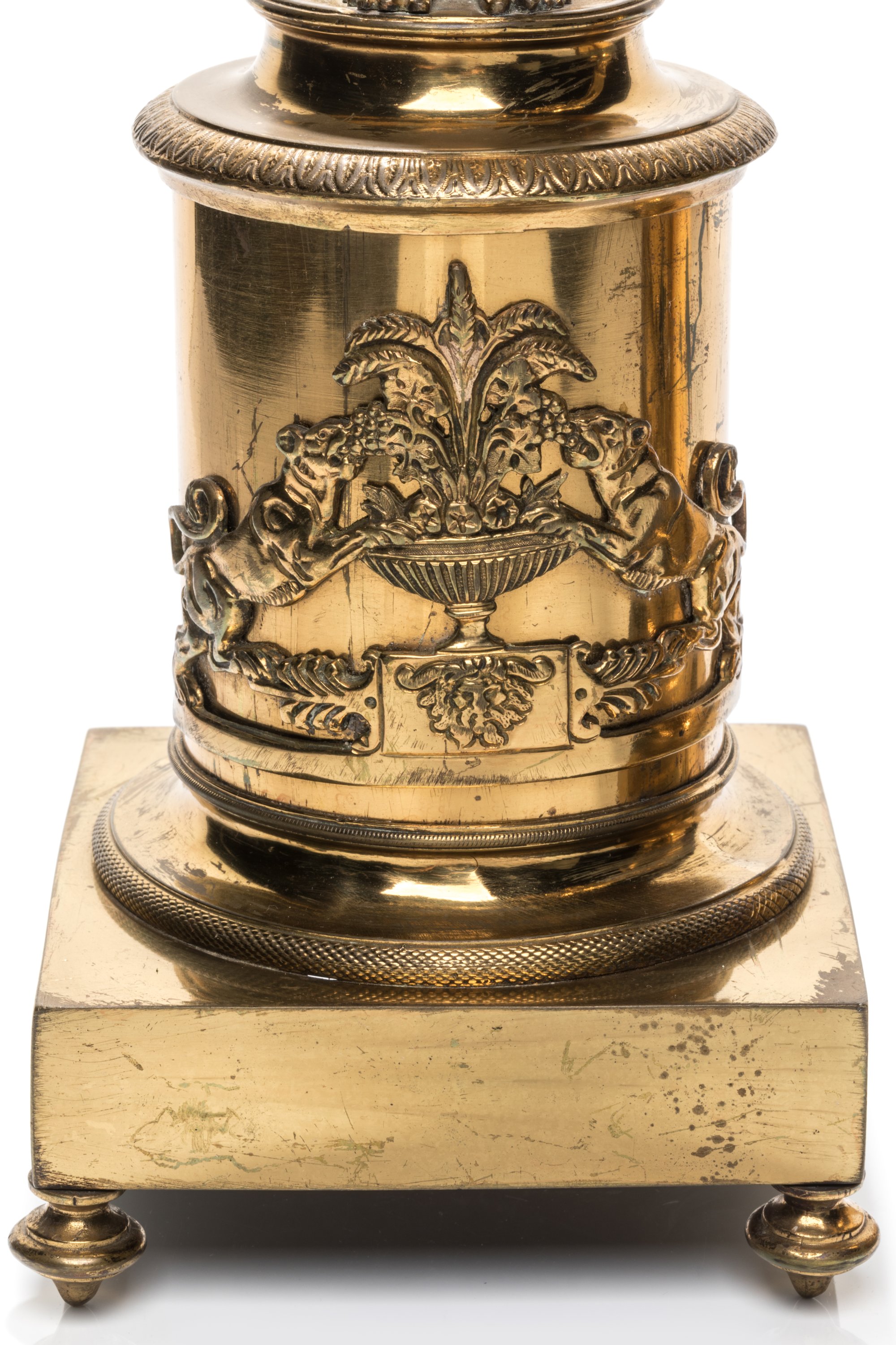 en bronze doré. Chaque personnage porte deux cornes d'abondance illuminées tandis qu'une troisième lumière est posée sur sa tête. Les jambes forment une gaine ornée du thyrse et de feuilles de vigne terminée par le bas de la robe, les pieds reposent sur un fût cylindrique avec un bas-relief figurant des fauves mangeant les grappes de raisin d'une vigne plantée dans un vase cratère. L'ensemble repose sur une base carrée à pied en toupie.