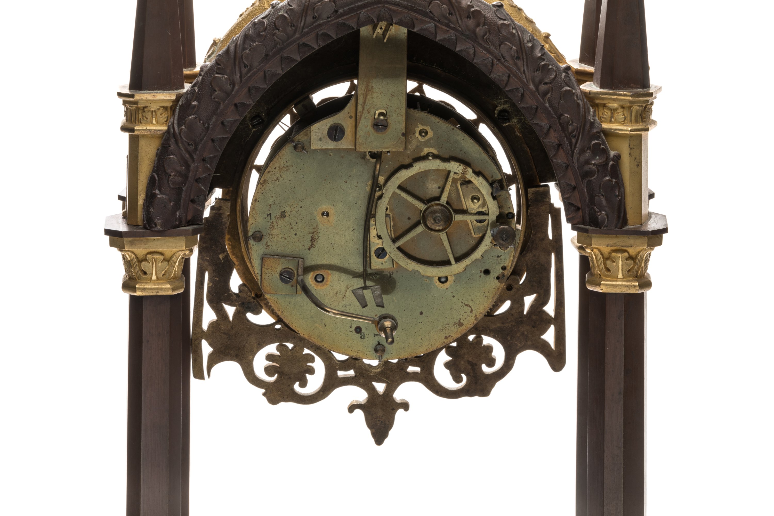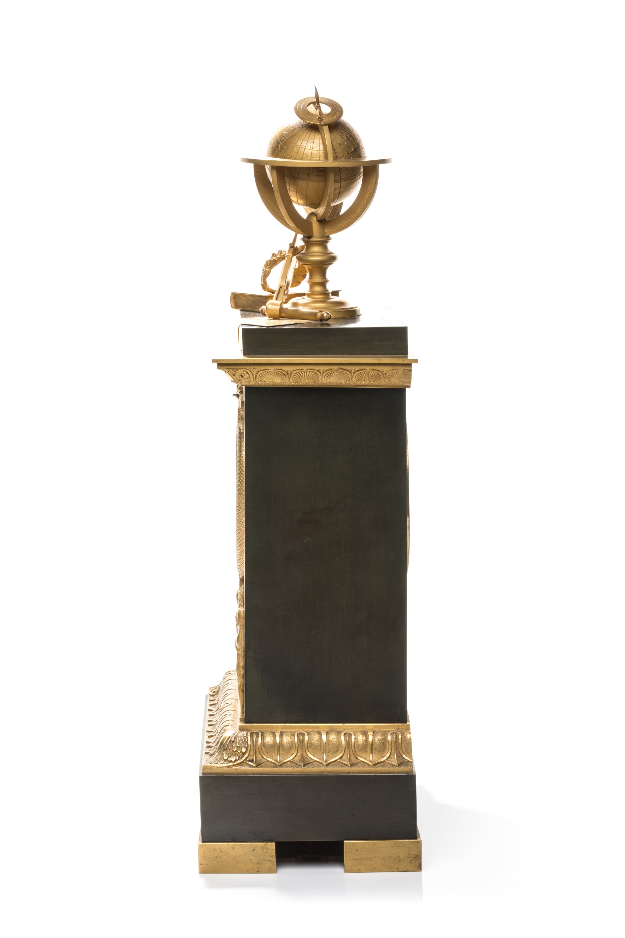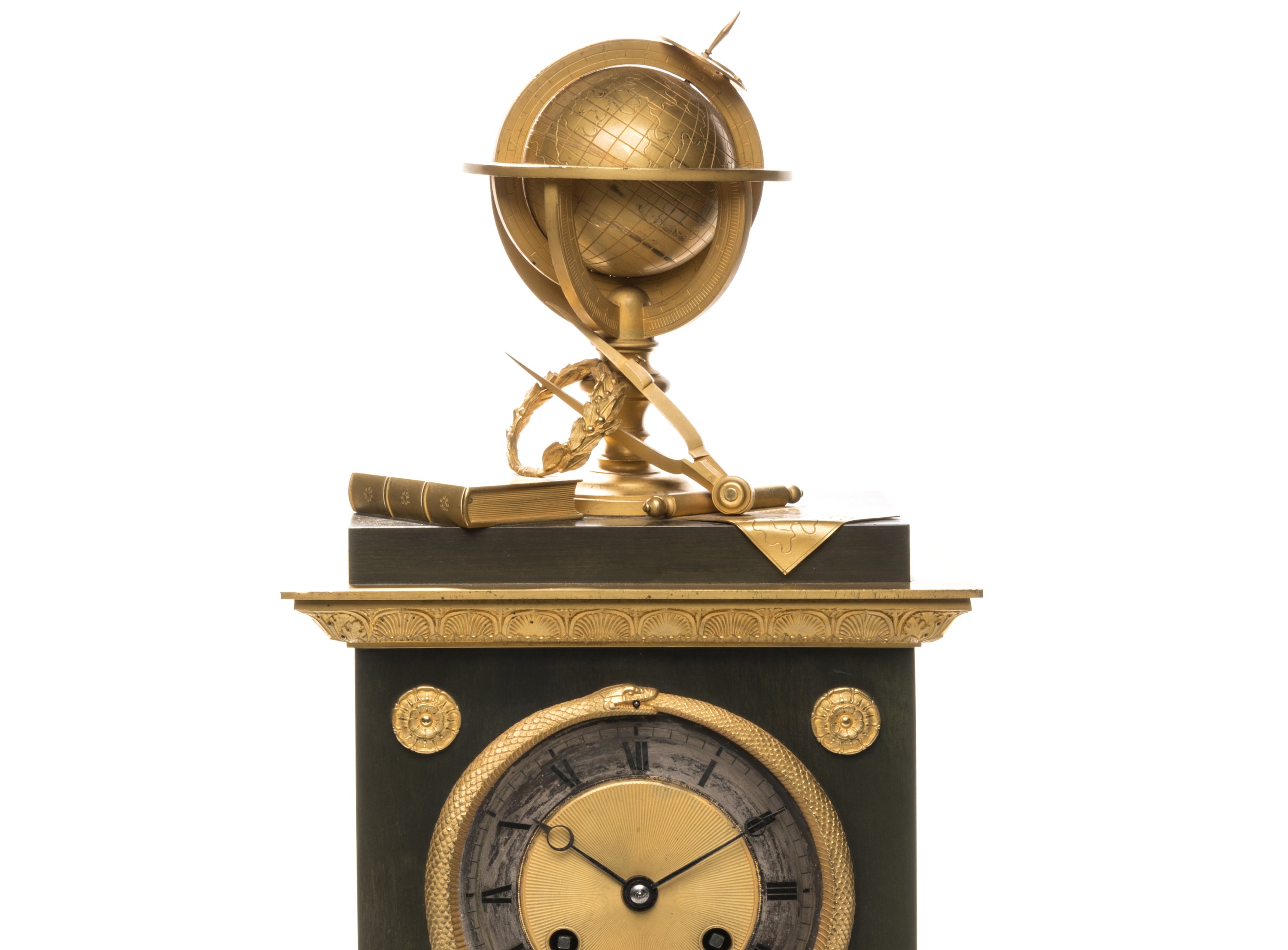 en bronze patiné et doré, surmontée d'un globe, d'une couronne de lauriers et d'instruments scientifiques. Le cadran doré rayonnant à chiffres romains et chemin de fer est ceint d'une figure d'Ouroboros en bronze doré. Les trois faces sont ornées de rosaces et corniches en bronze doré et finement ciselé de guirlandes de palmettes, oves stylisés et alternés de feuillage. Elle repose sur une base rectangulaire en bronze patiné ornée et d'un bas-relief à trois personnages à l'antique, aux quatre patins dorés.