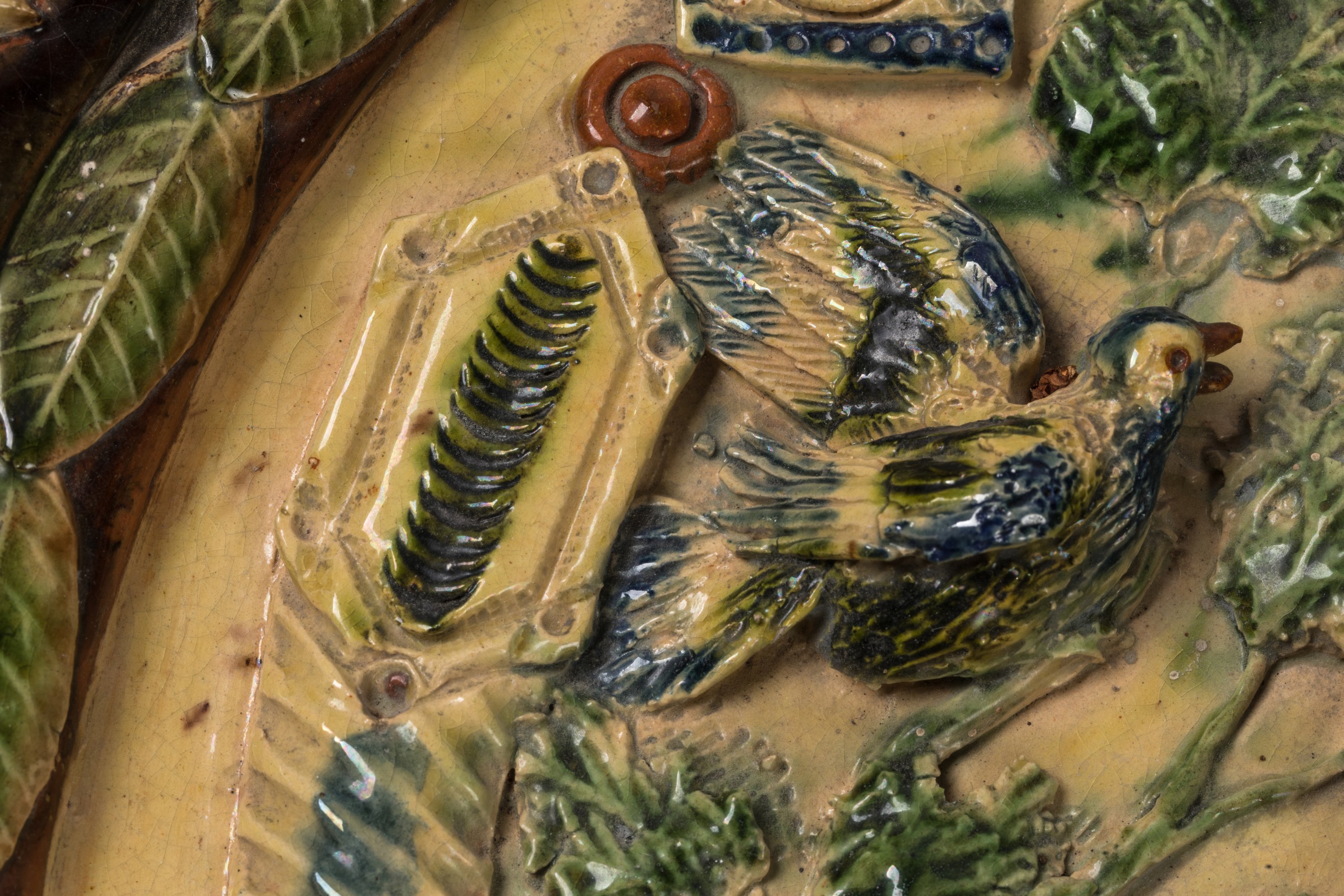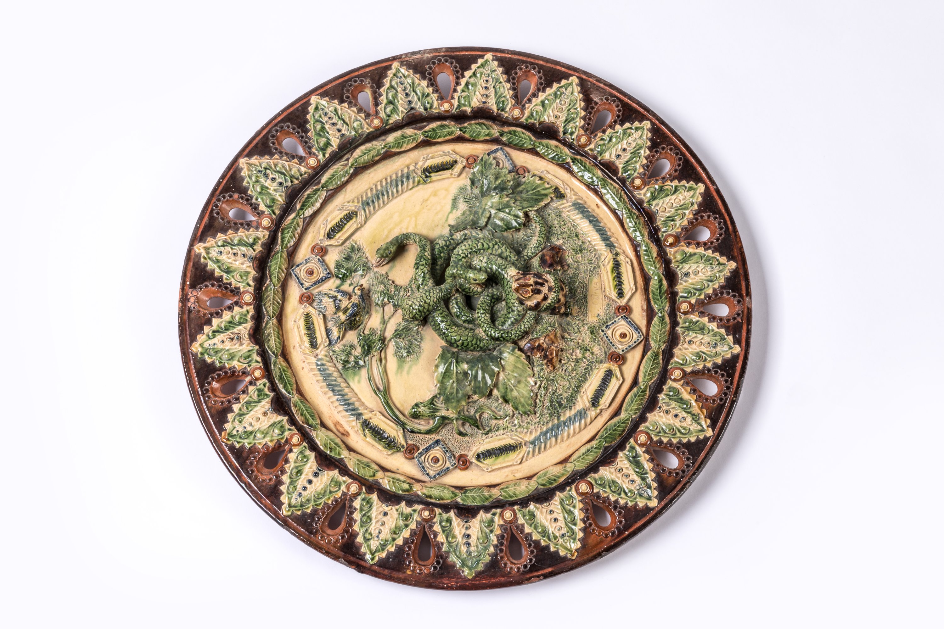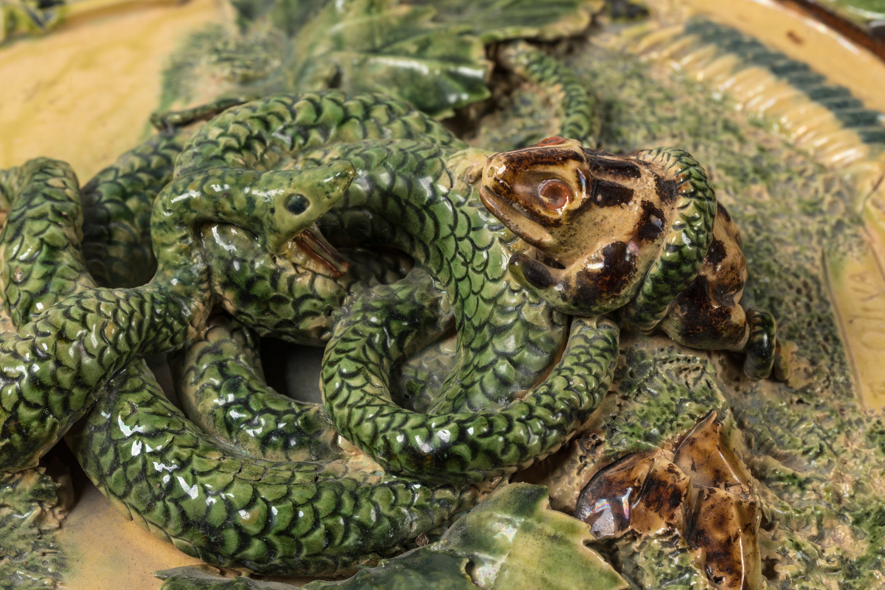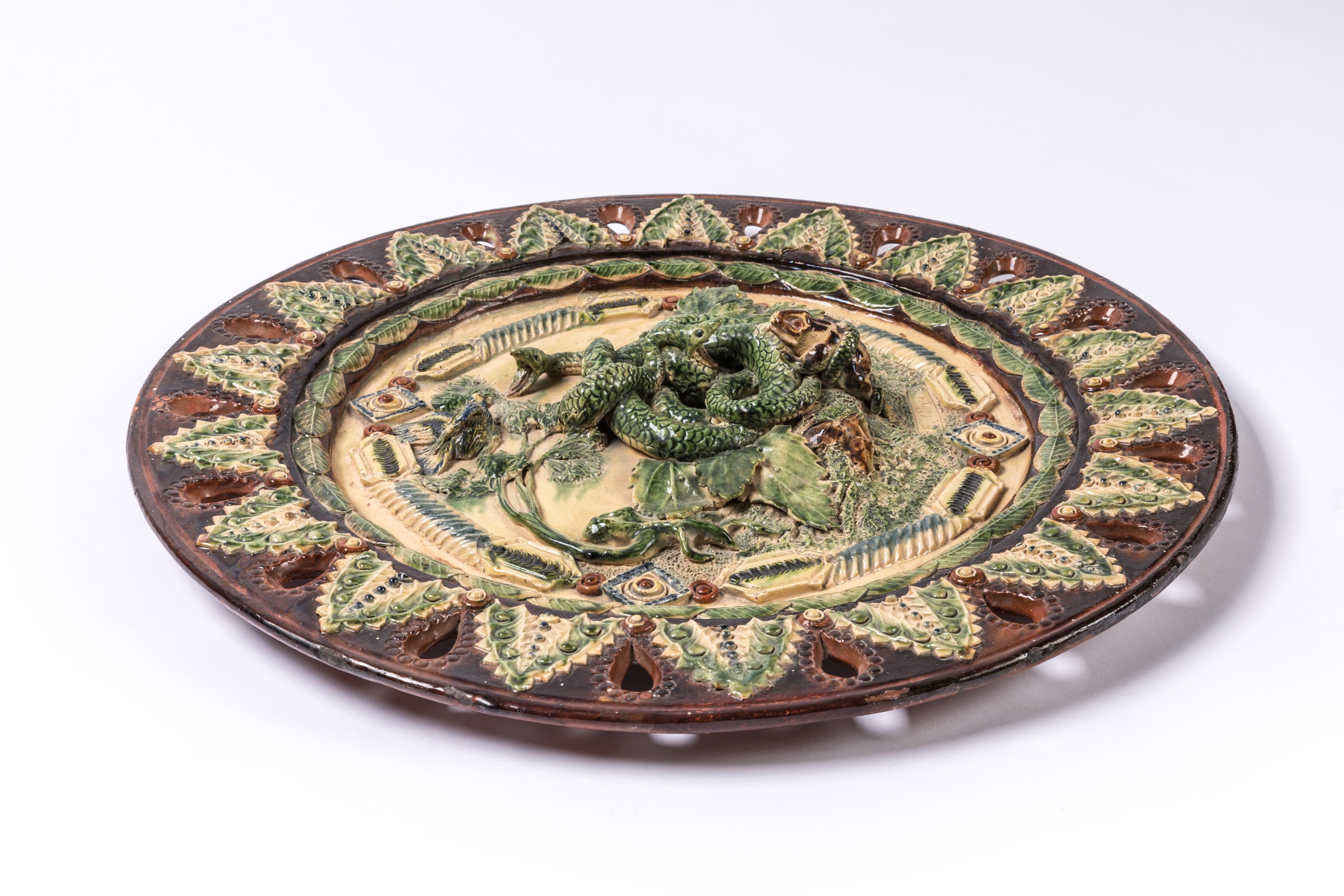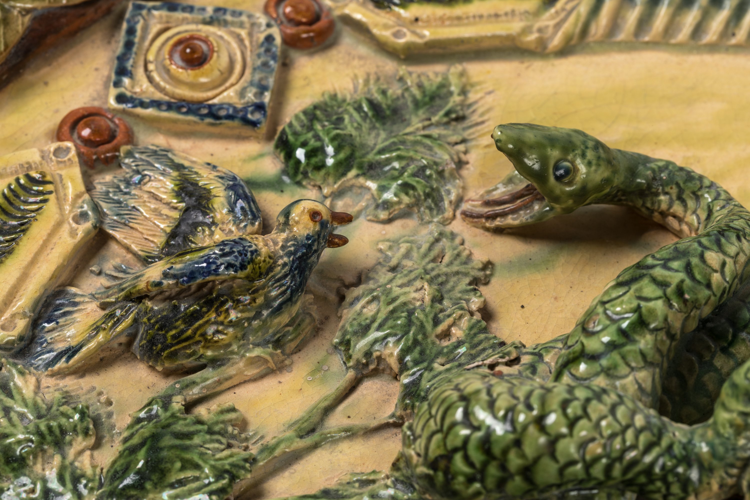 A glazed ceramic platter adorned with snakes, frog and bird by Étienne Oliva. Signed.