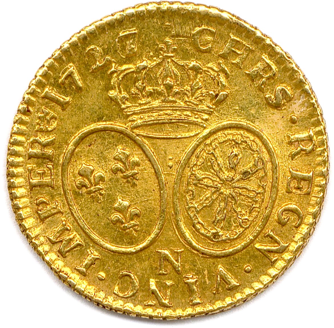 A 1727 "Louis d'or aux lunettes" gold coin.