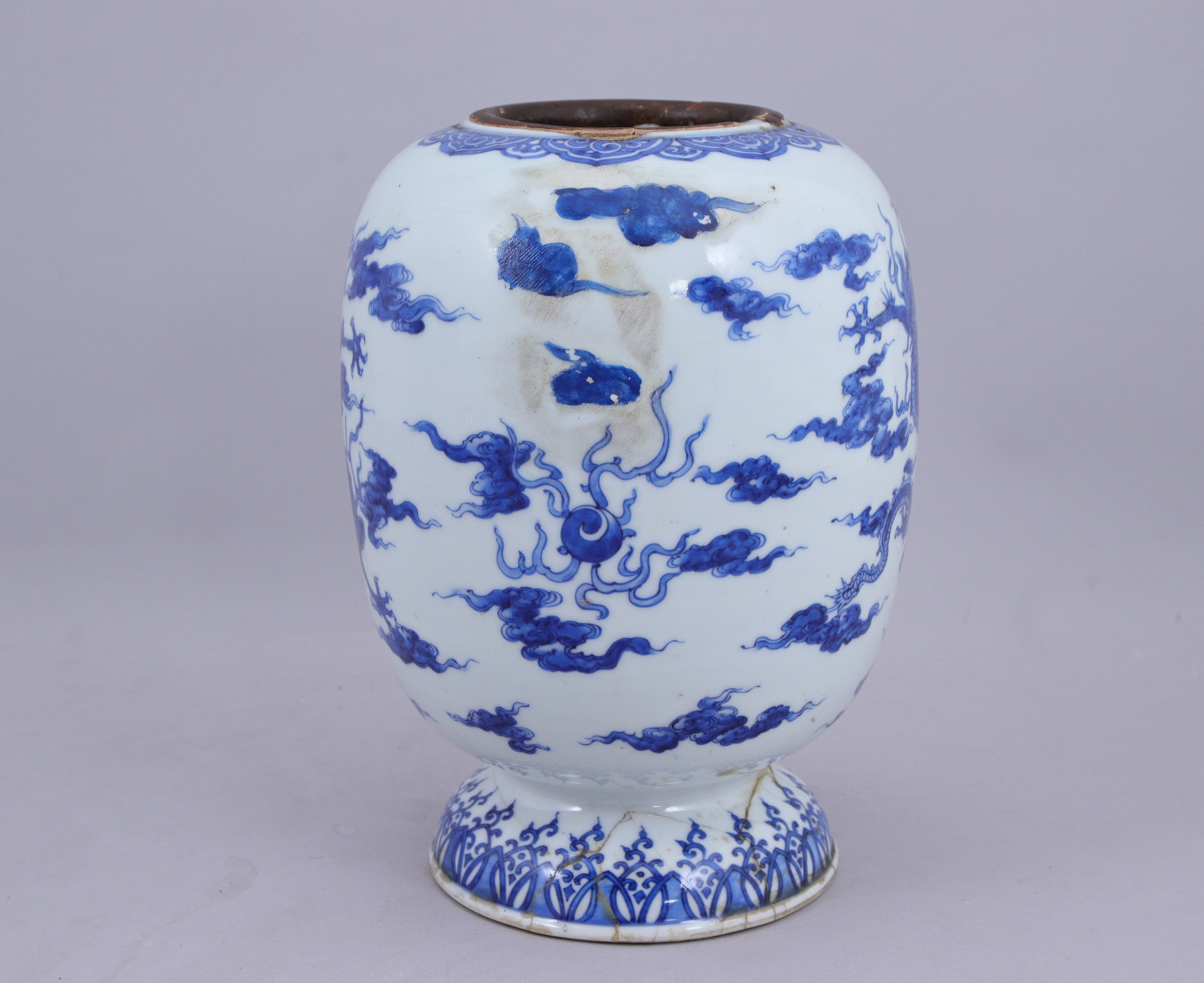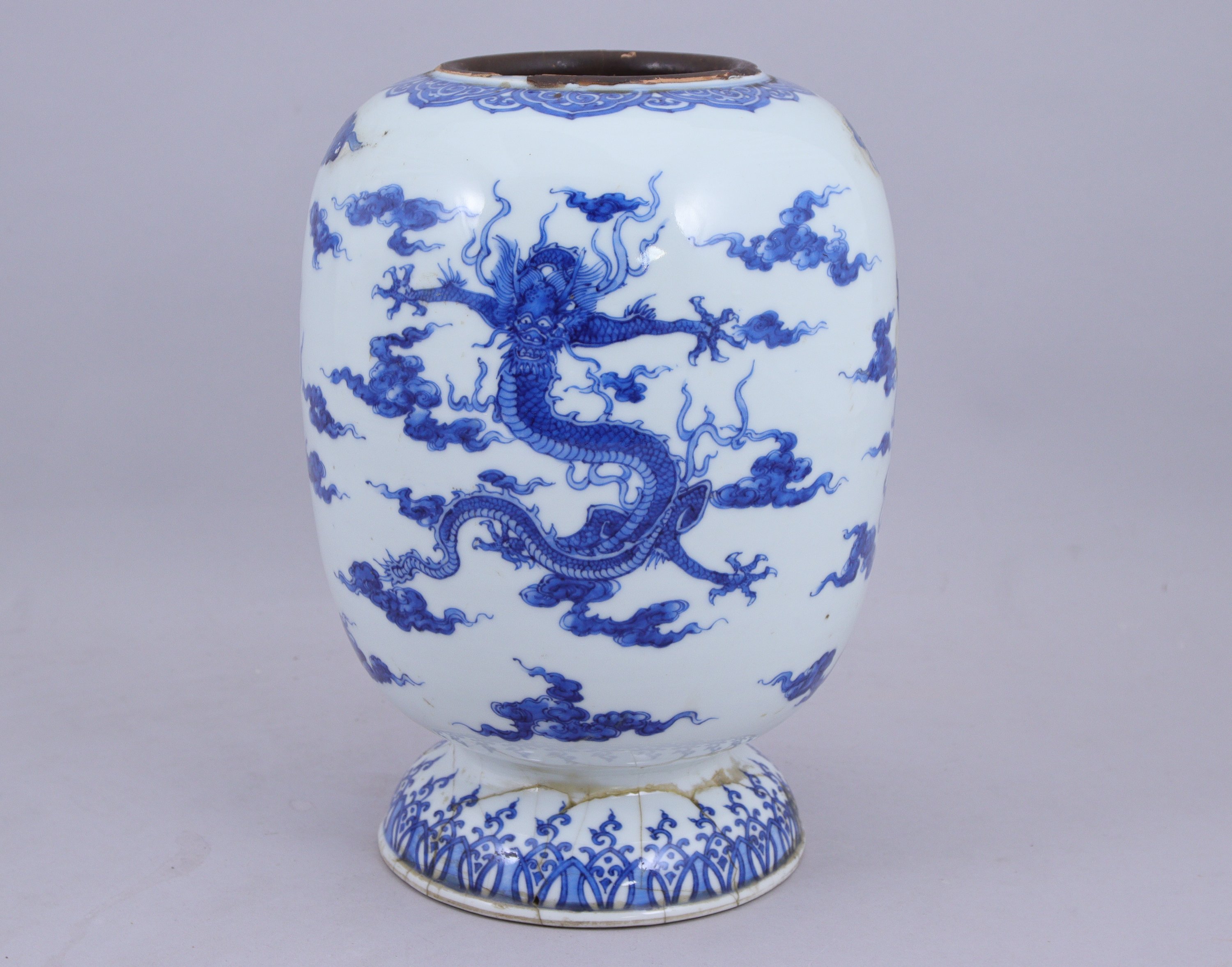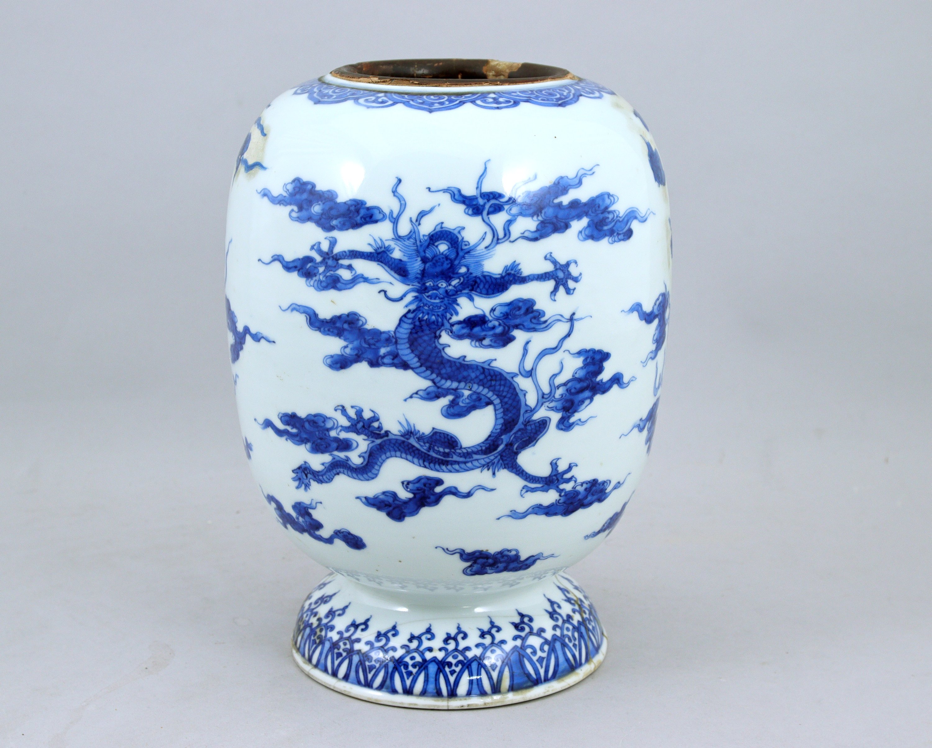 en porcelaine décorée en bleu sous couverte de dragons pourchassant la perle sacrée parmi les nuages.