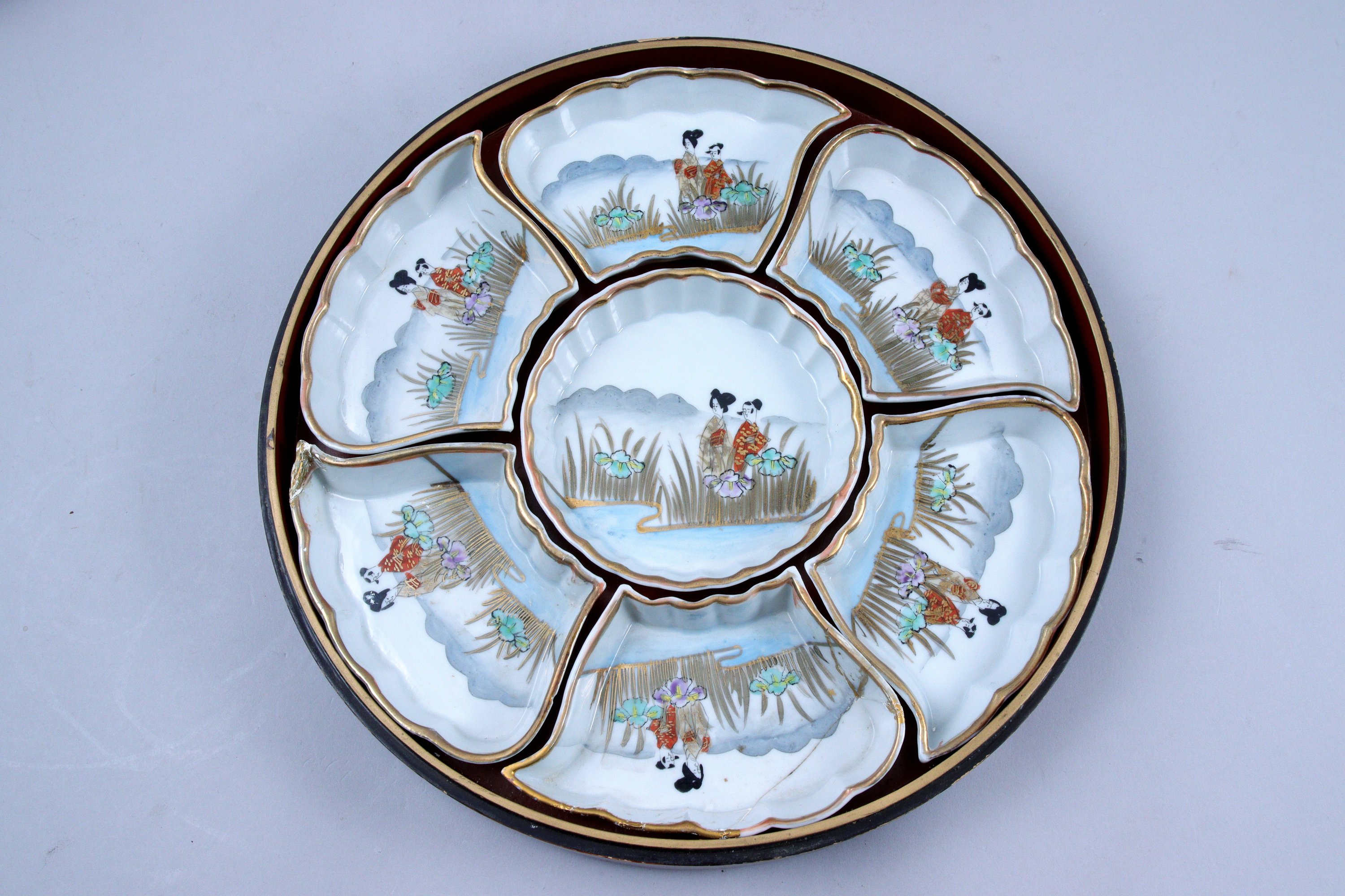 en bois laquée à fond rouge figurant le vol de deux cigognes. La boîte dévoilant sept ramequins en porcelaine.