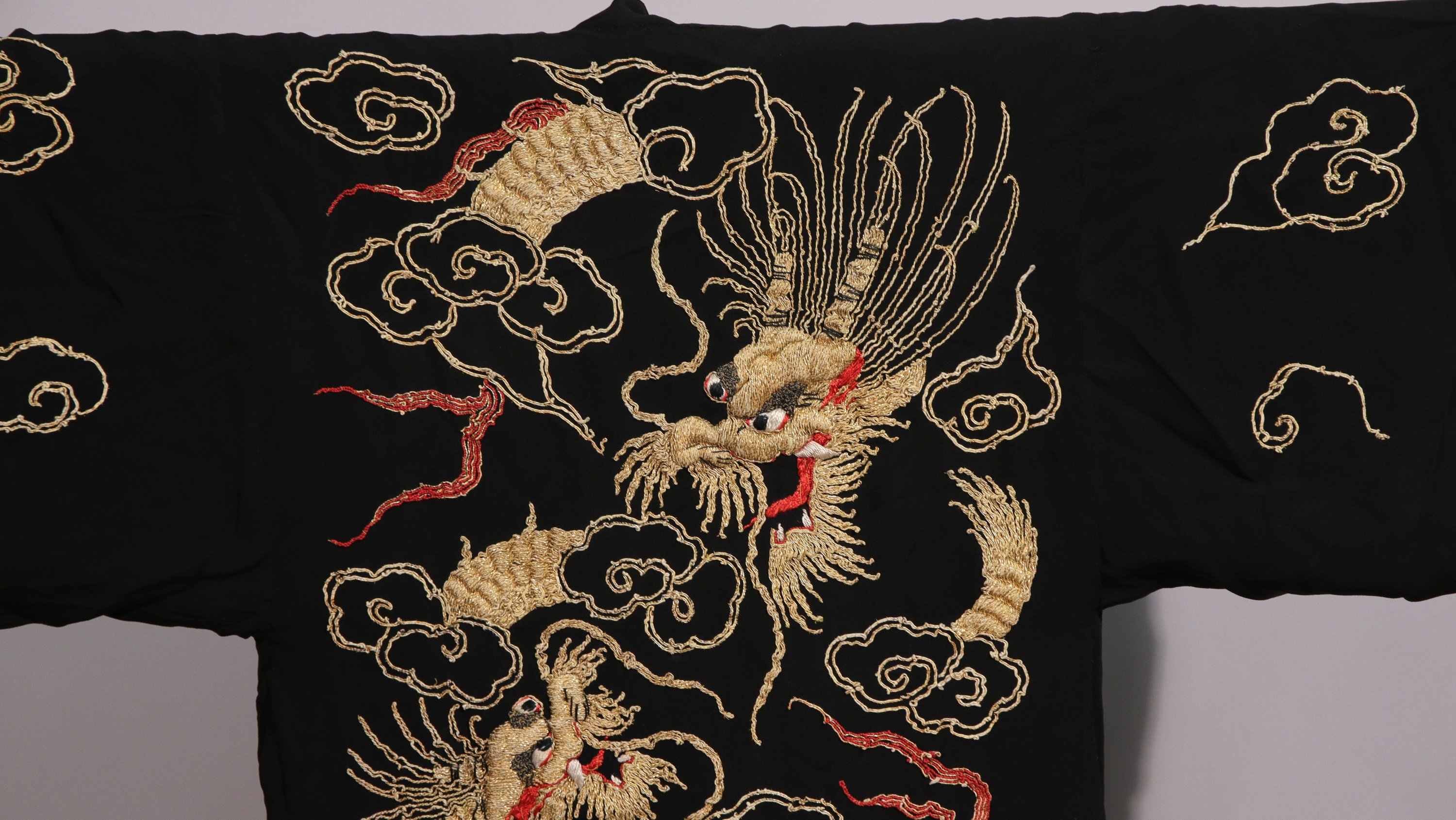 en soie noire brodée aux fils dorés des dragons parmi des nuages.