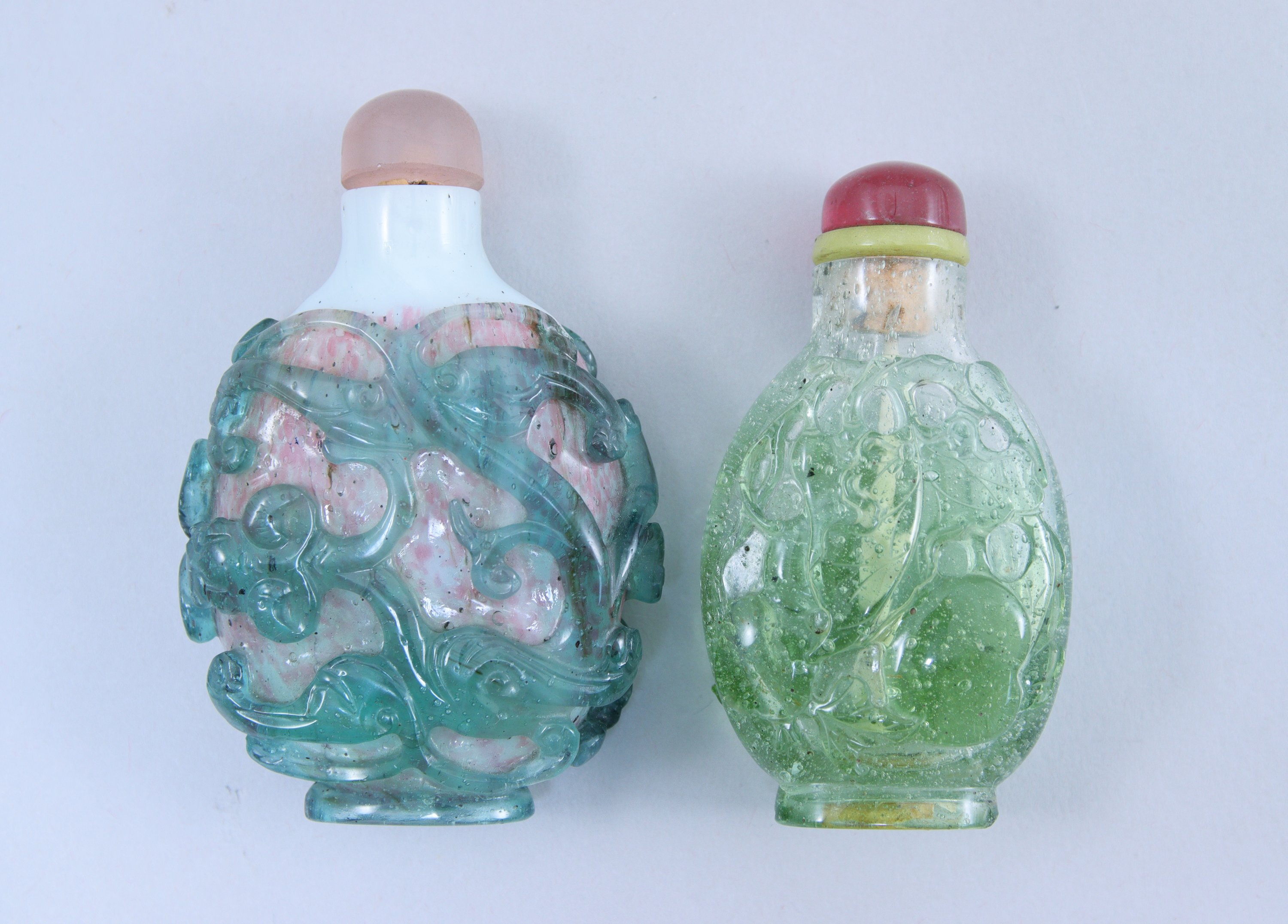 en verre overlay, l'un aplati à col droit, en vert sur fond rose sandwich et blanc à décor de qilong contorsionnés sur chaque face, l'autre en vert sur fond translucide bullé d'une branche de grenades sur une face, d'une branche de haricot sur l'autre face. Bouchon en quartz rose.