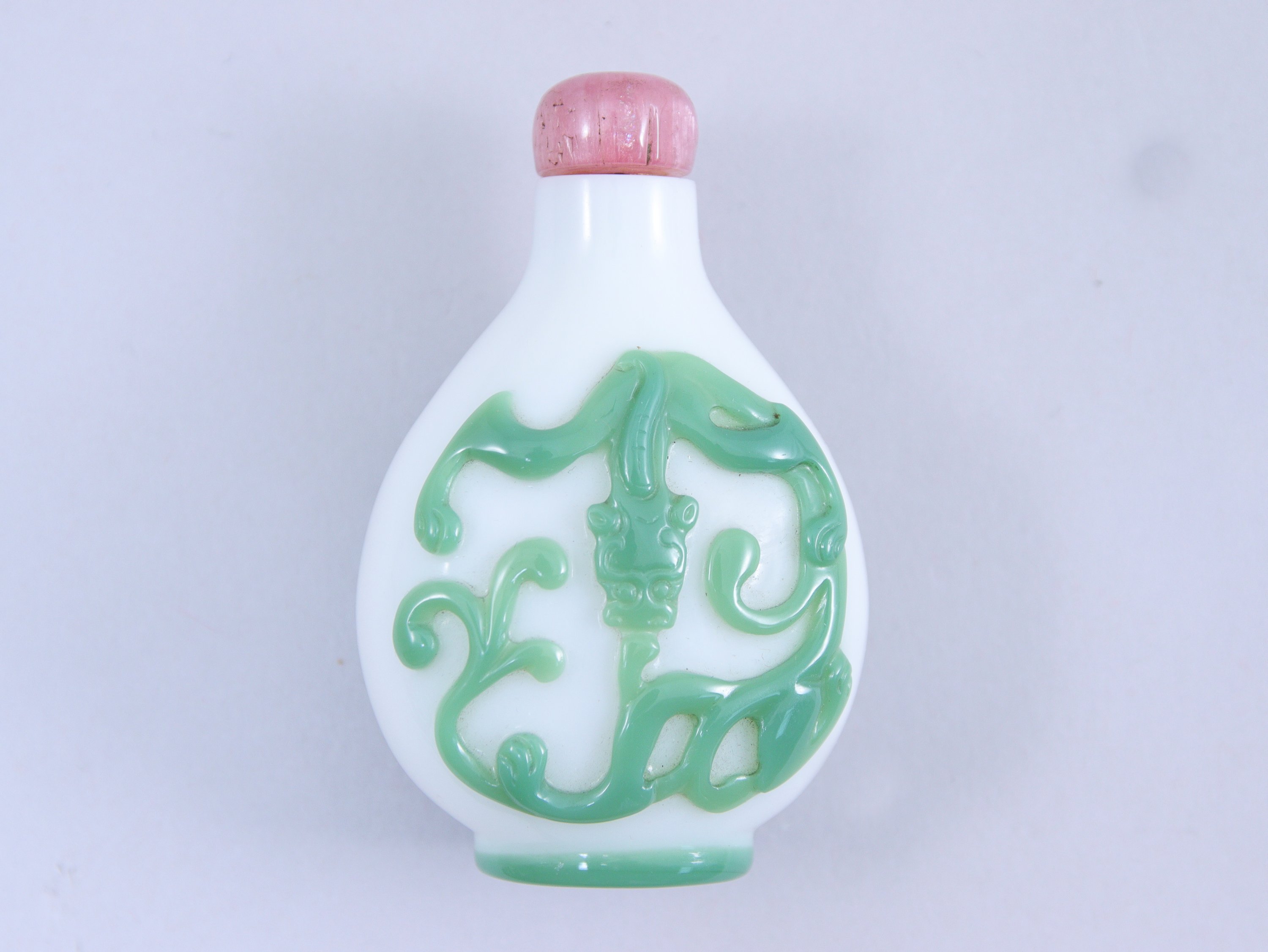 en verre overlay vert sur fond blanc opaque, à décor sur chaque face d'un qilong lové. Bouchon en quartz rose.