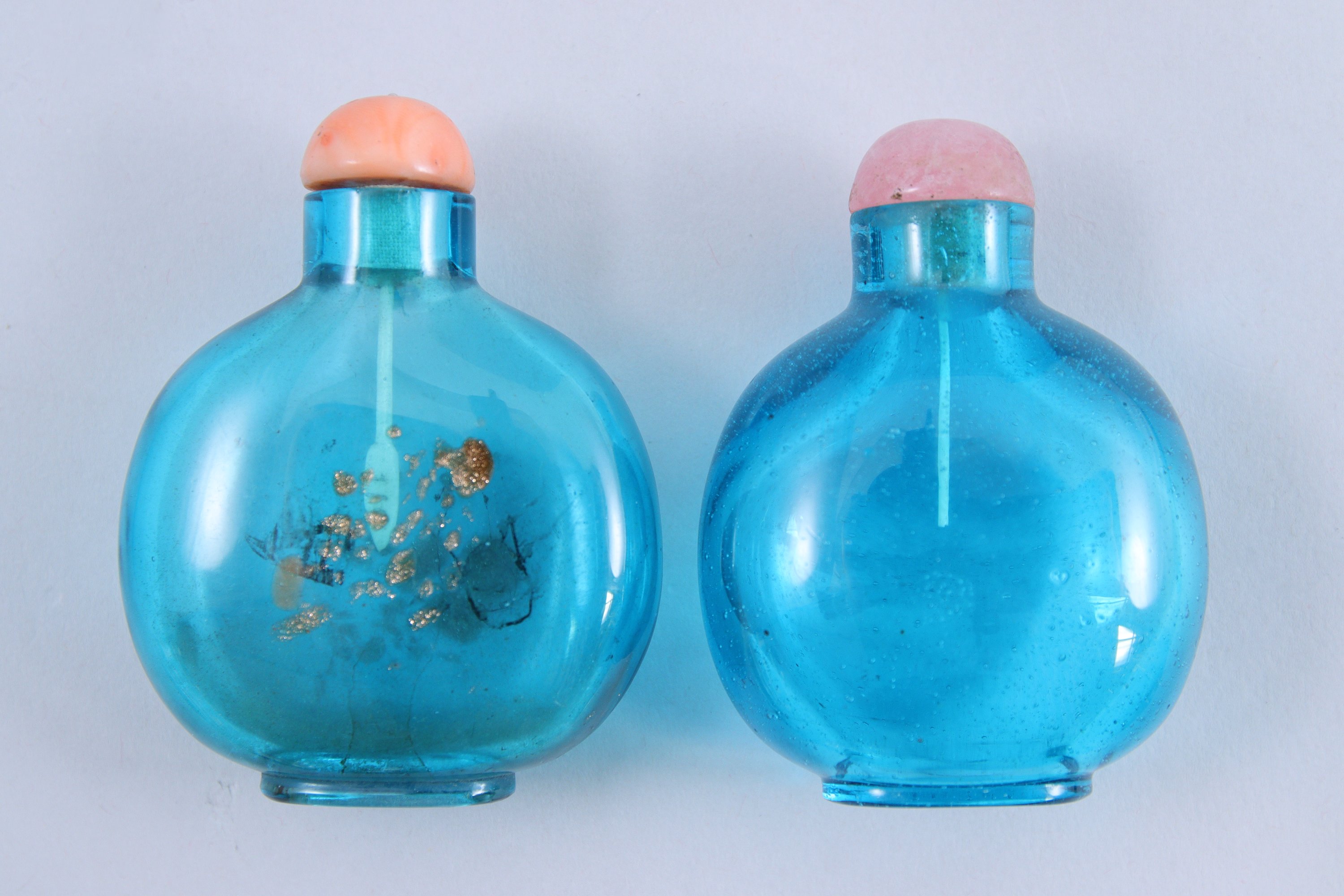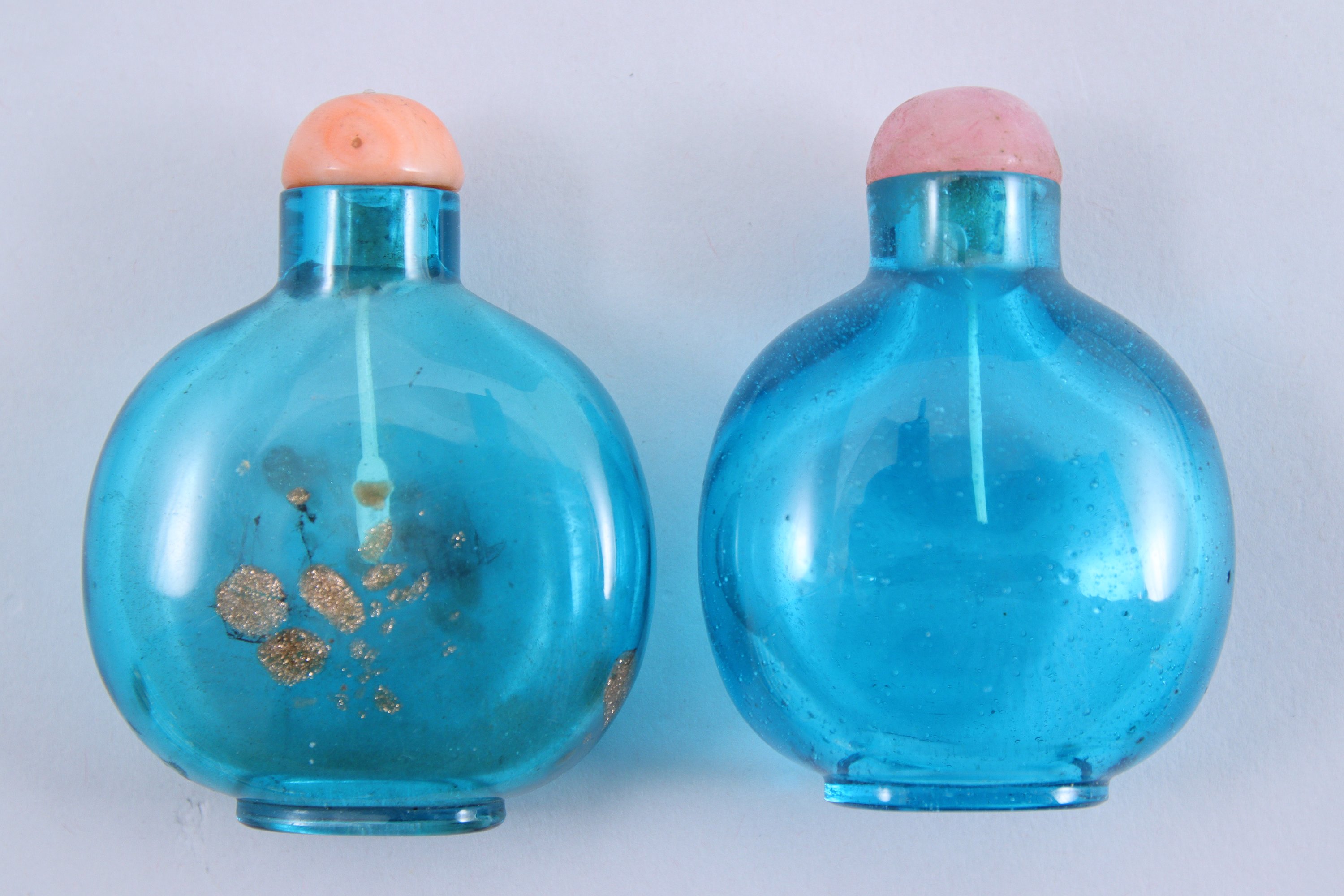 en verre bleu translucide dont l'un à inclusions d'aventurine. (Un avec petite égrenure en bordure de col, l'autre avec petits éclats à la bouche). Bouchons corail et en quartz rose.