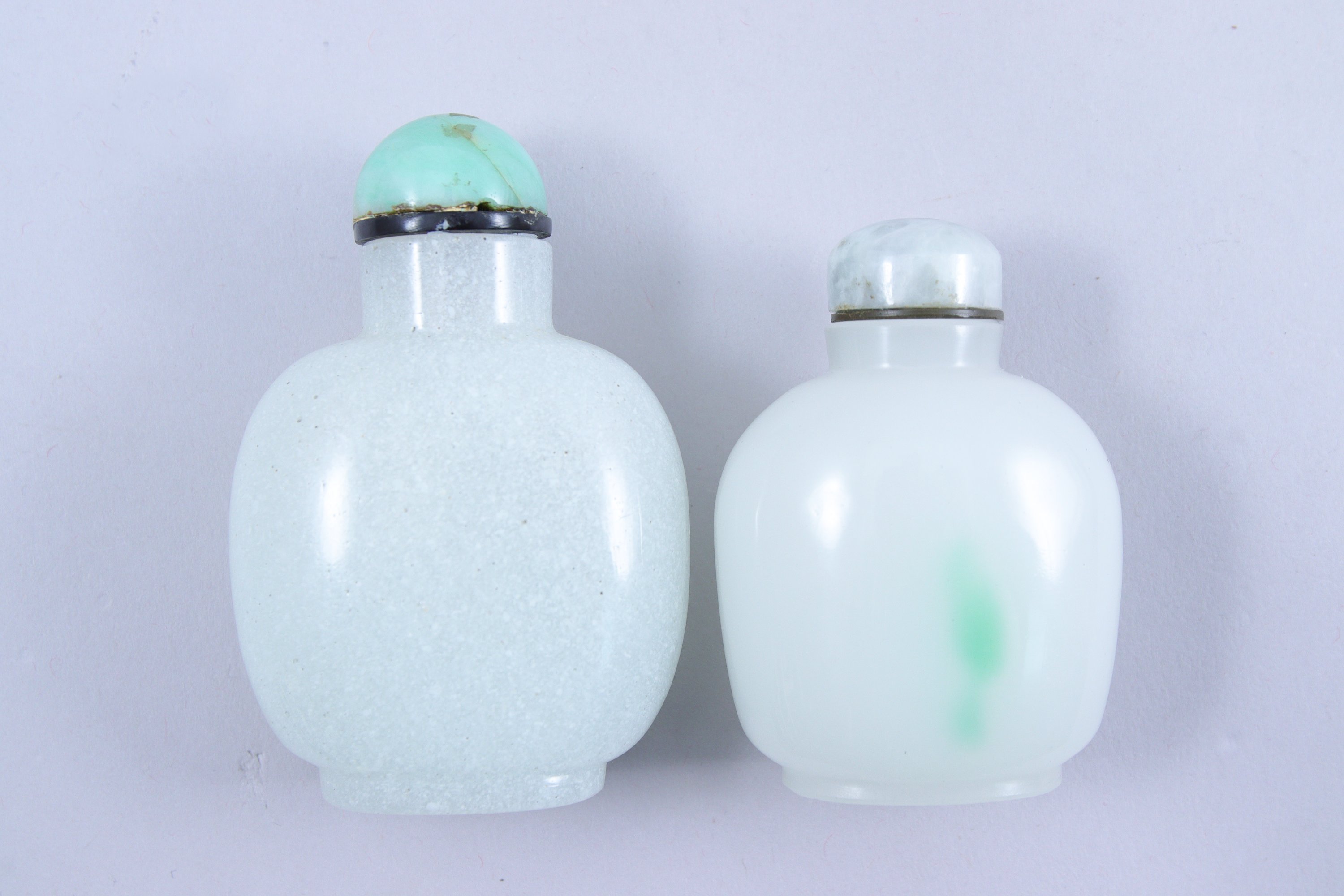 en verre, l'un bullé, l'autre imitant la jadéite blanche à inclusions vertes. Bouchons en jadéite et néphrite cerclés de noir.
