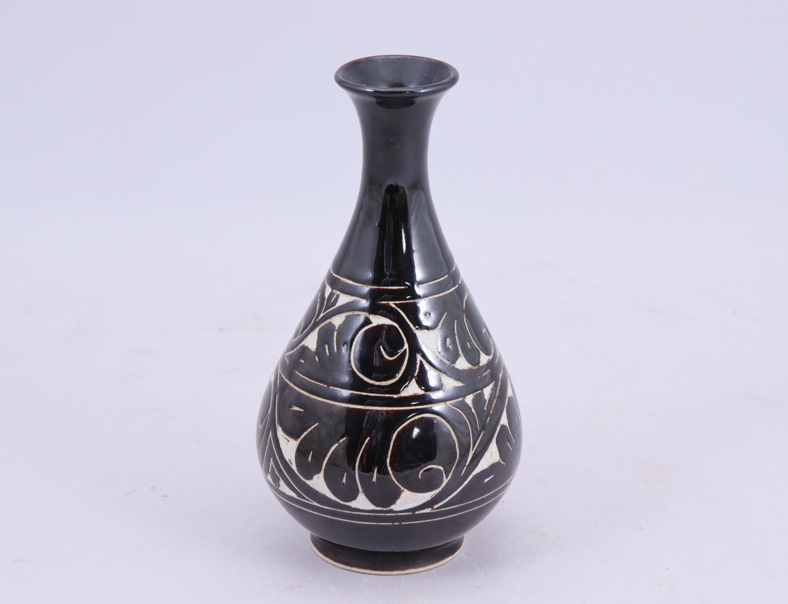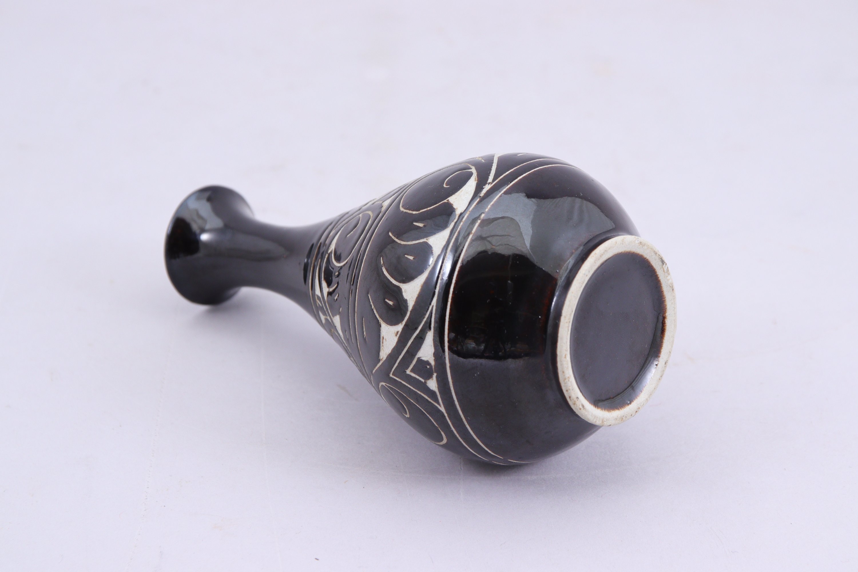 Compare the cut-glaze bottle of this shape carved with related decoration, in the collection of the Saint Louis Art Museum, illustrated by R. Mowry in Hare's Fur, Tortoiseshell, and Partridge Feathers: Chinese Brown- and Black-Glazed Ceramics, 400-1400, Harvard University Art Museums, 1995, pp. 189-90, no. 68, which is dated Xixia Kingdom or Jin to Yuan, 13th-14th century.