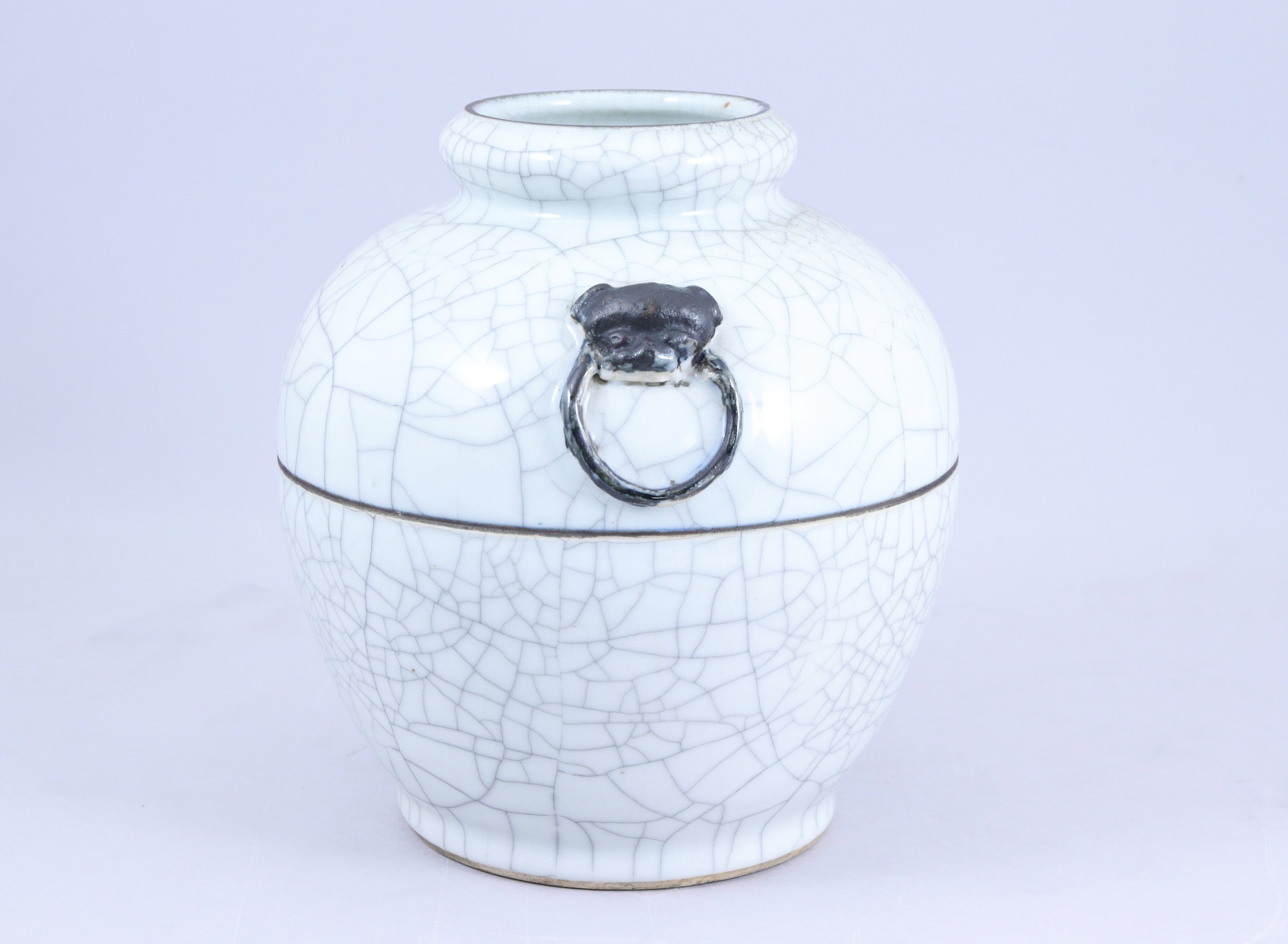 en porcelaine craquelée blanche, les anses à têtes de chimère tenant un anneau dans leur gueule.