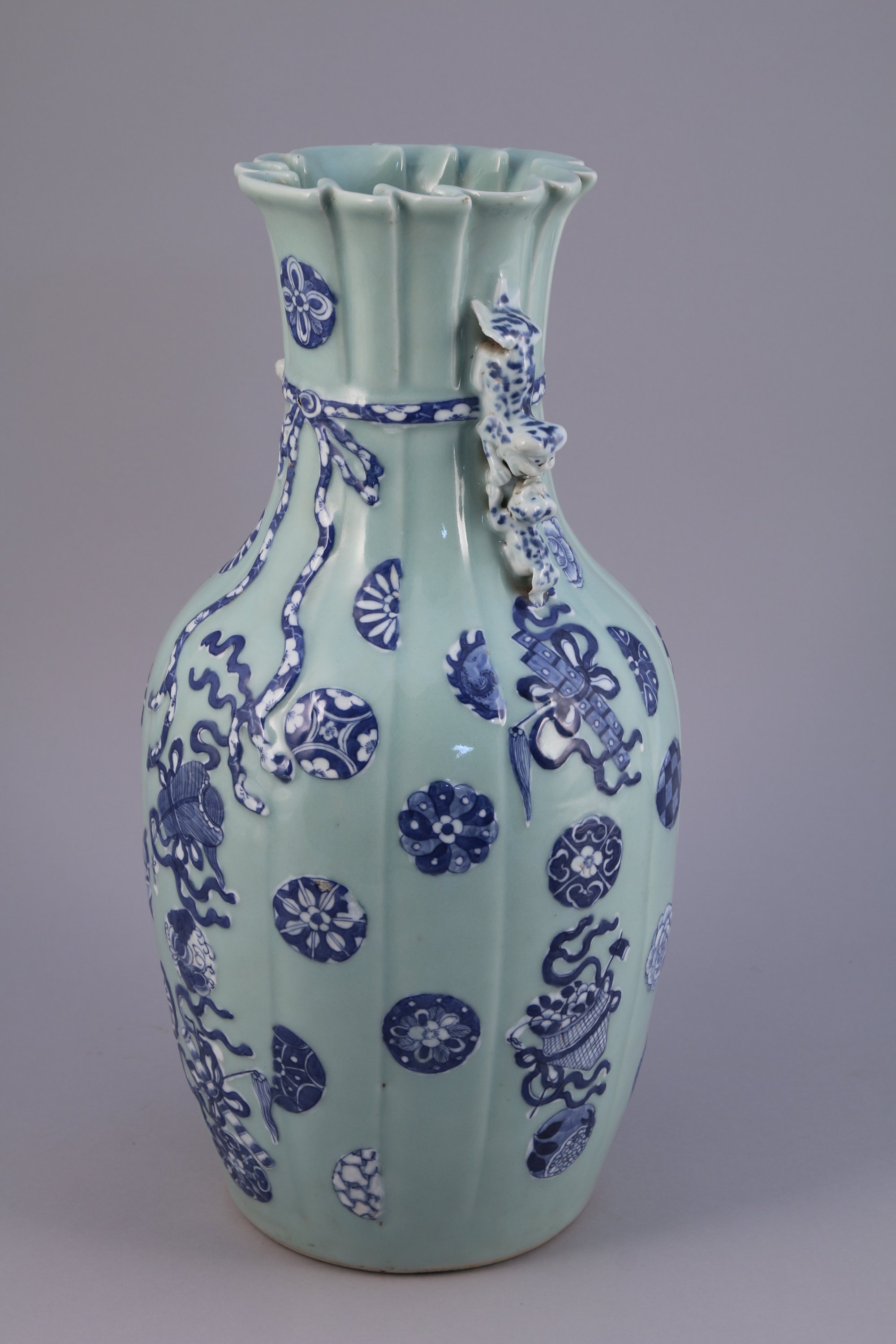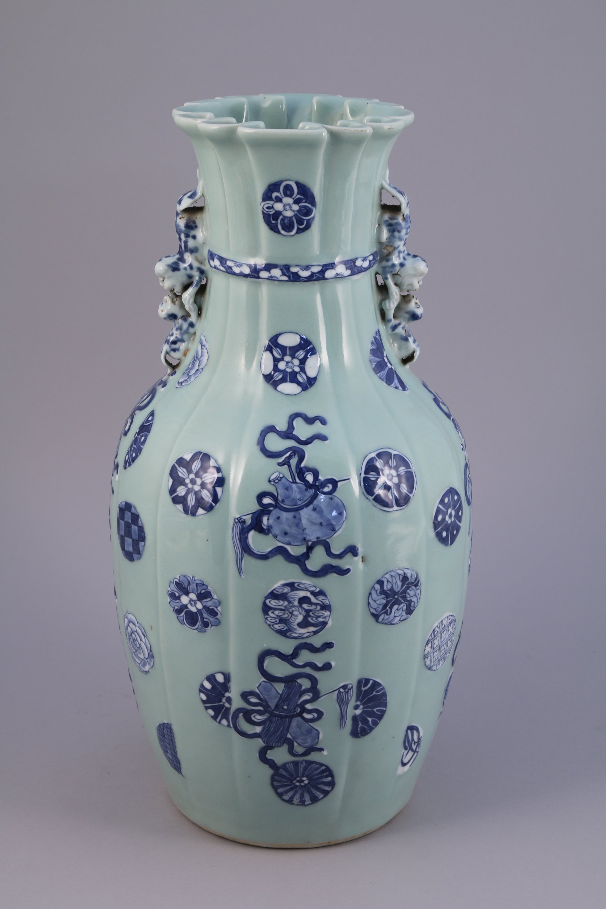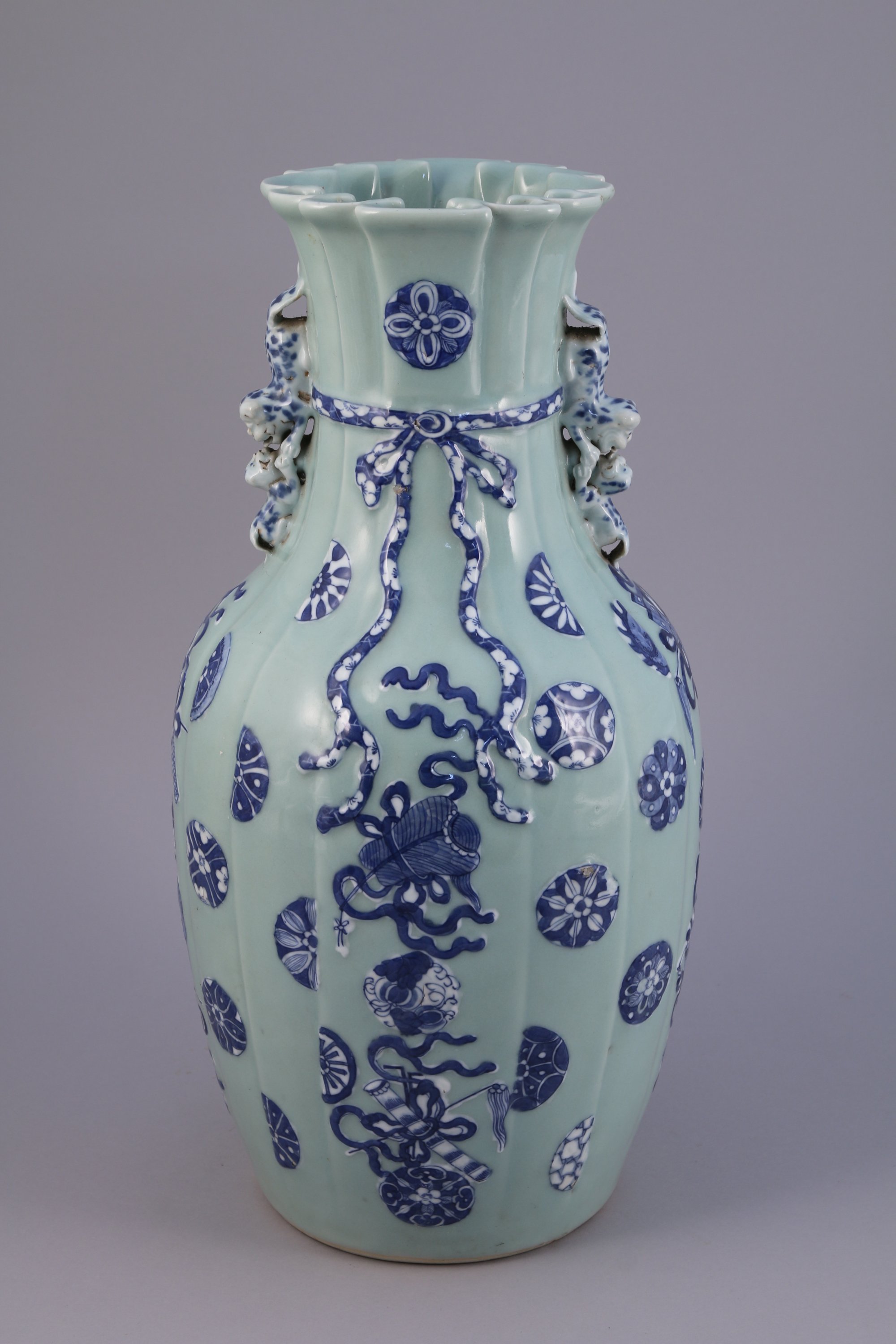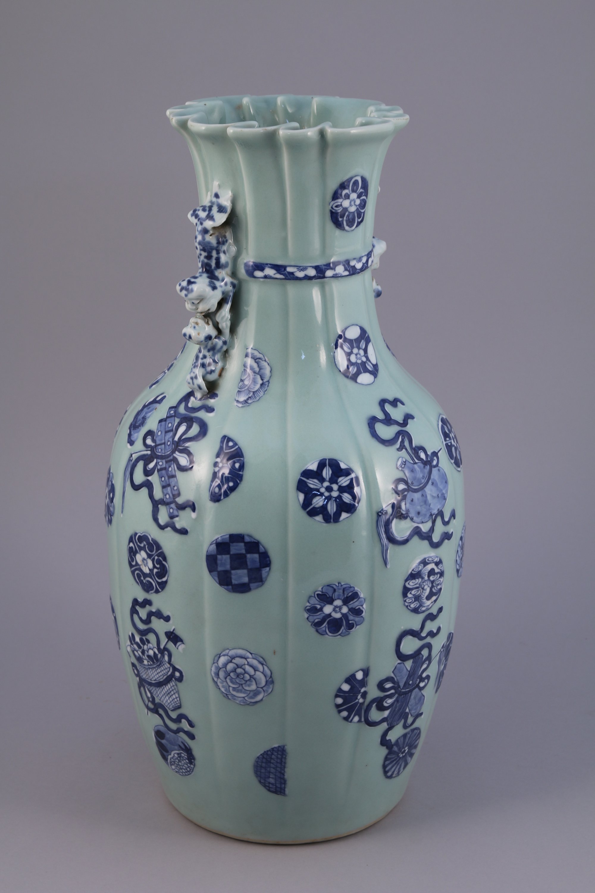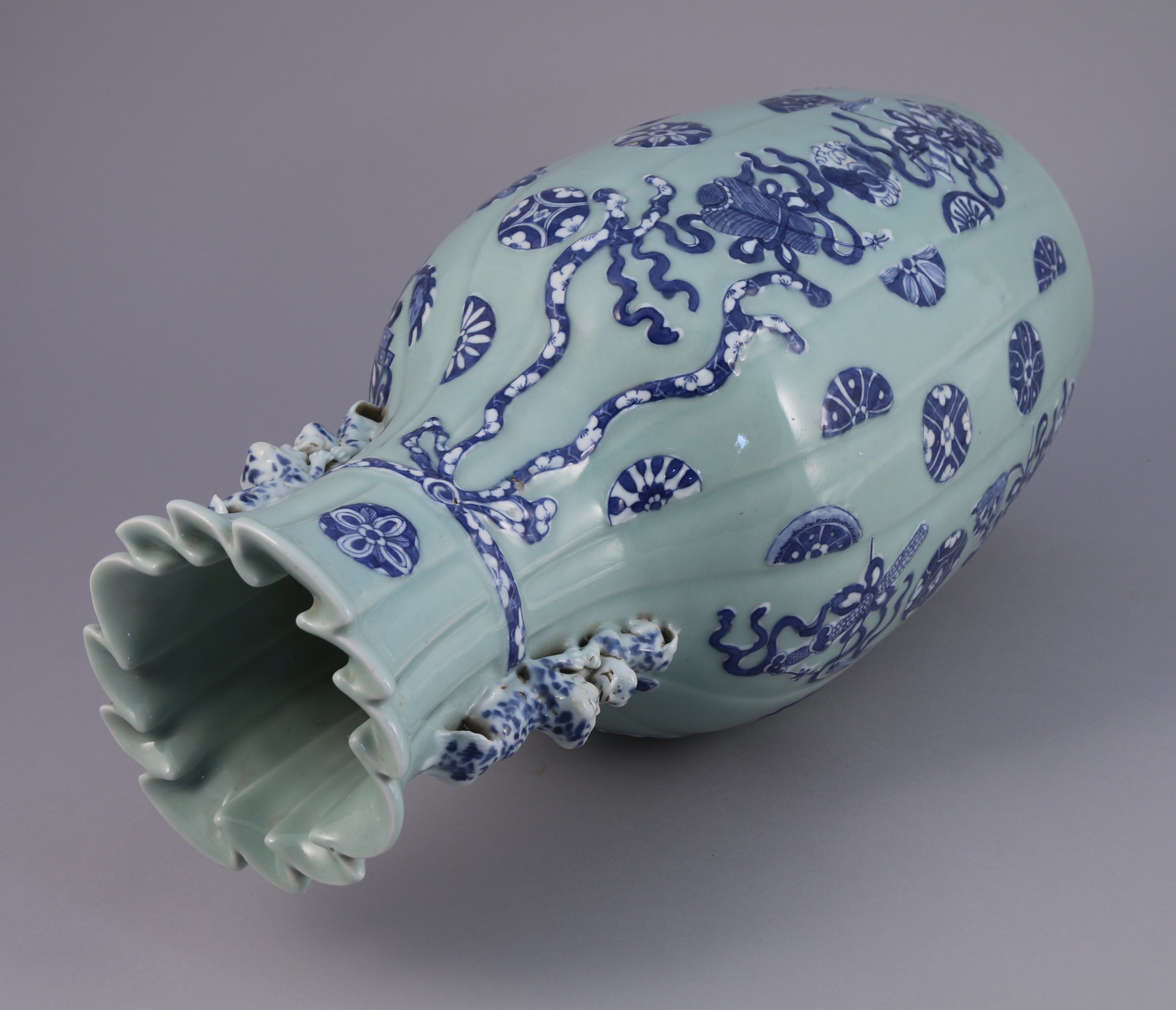 en porcelaine céladon à décor bleu d'objets rubanés et médaillons. Col plissé à anses figurant des chimères affrontées.