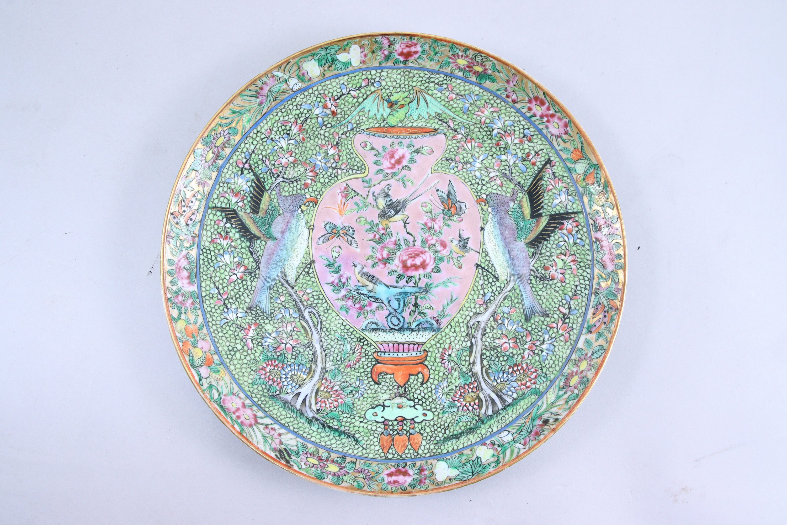 en porcelaine émaillée polychrome à décor d'un vase orné de papillons, oiseaux et fleurs sur fond rose, entouré de deux oiseaux exotiques sur fond vert.