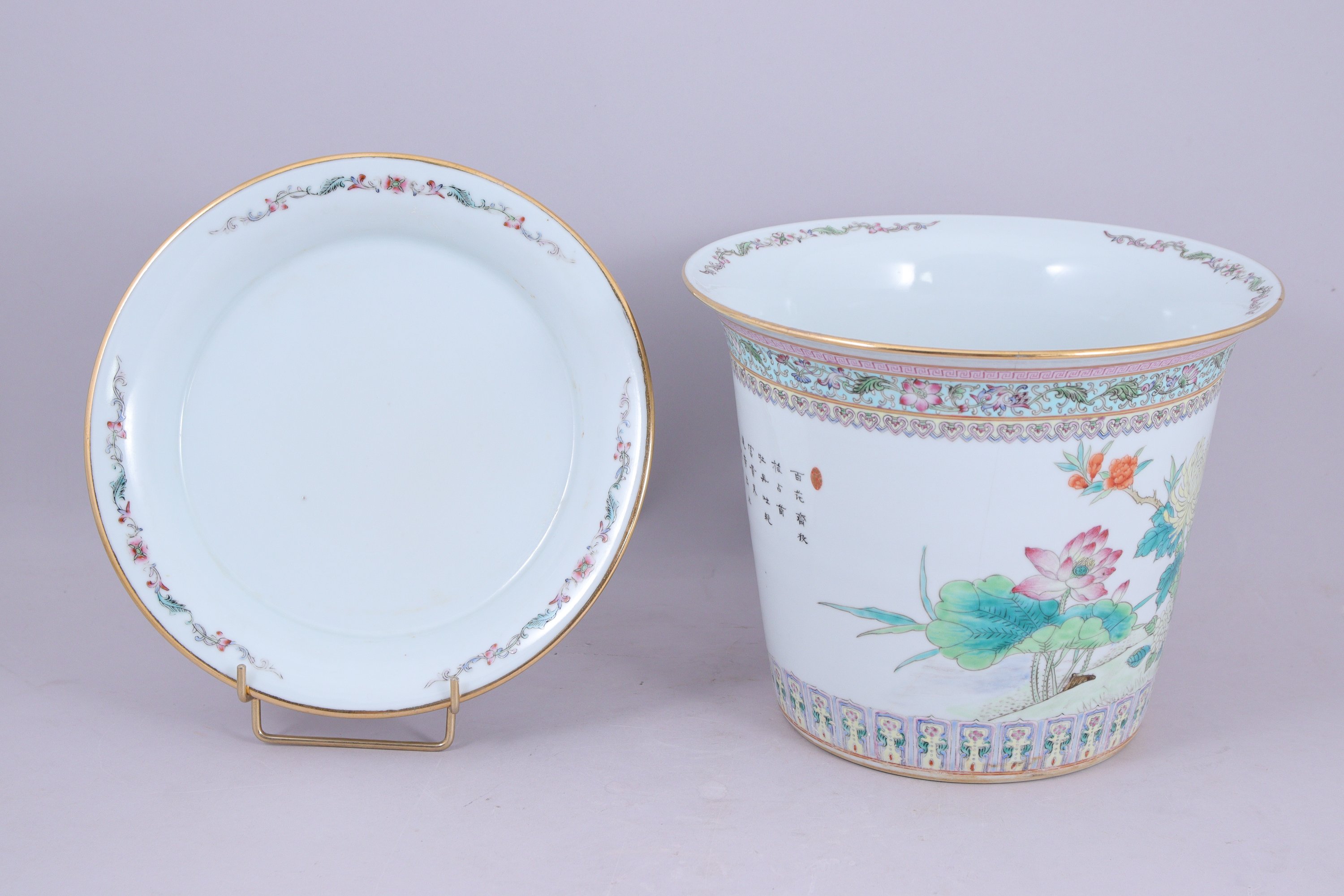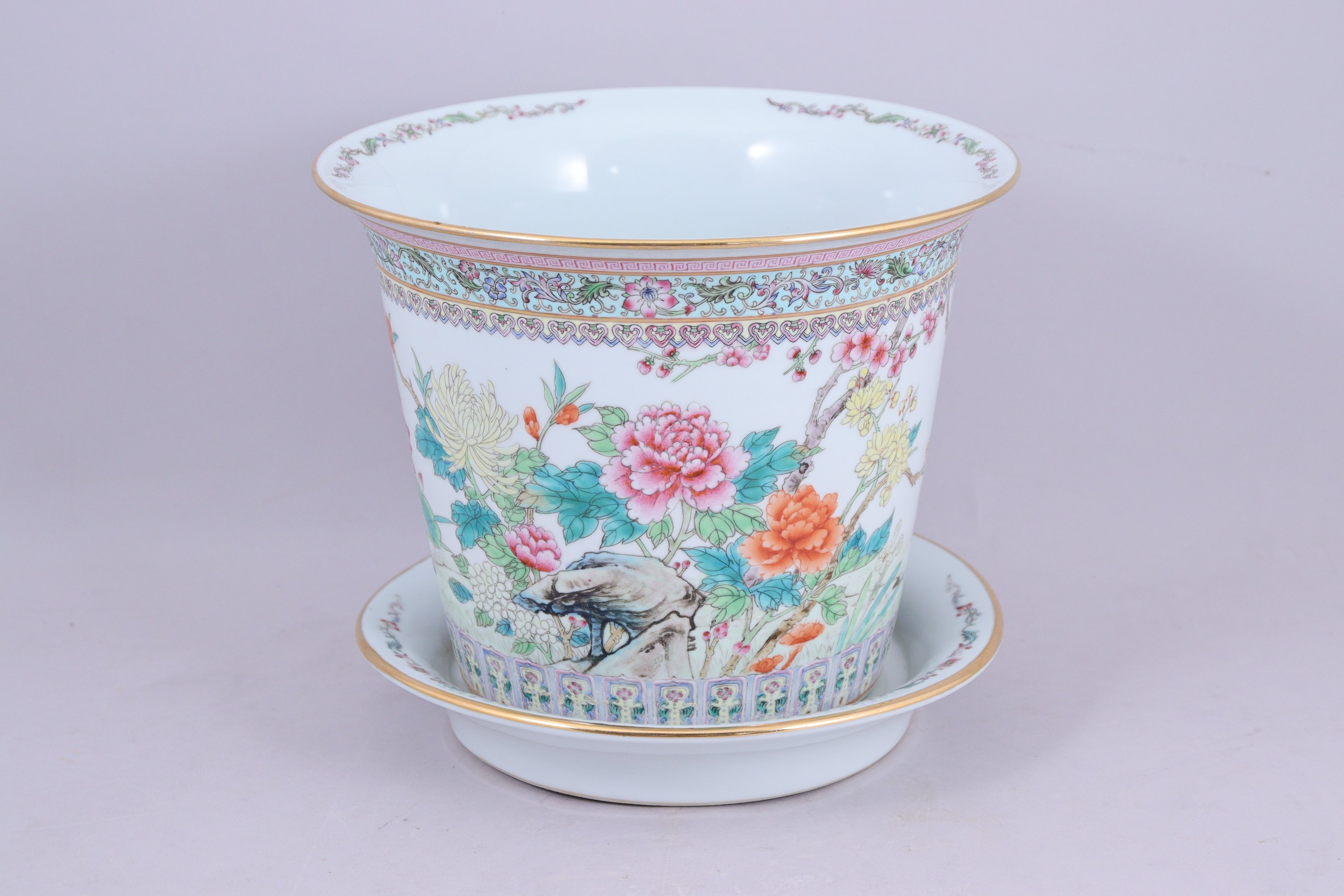 - Jardinière et sa coupelle, en porcelaine blanche, à décor floral polychrome. Tampon rouge (Zhuanshu?). Haut. 22,5 Diam. 26 cm. (Fissure, restauration).