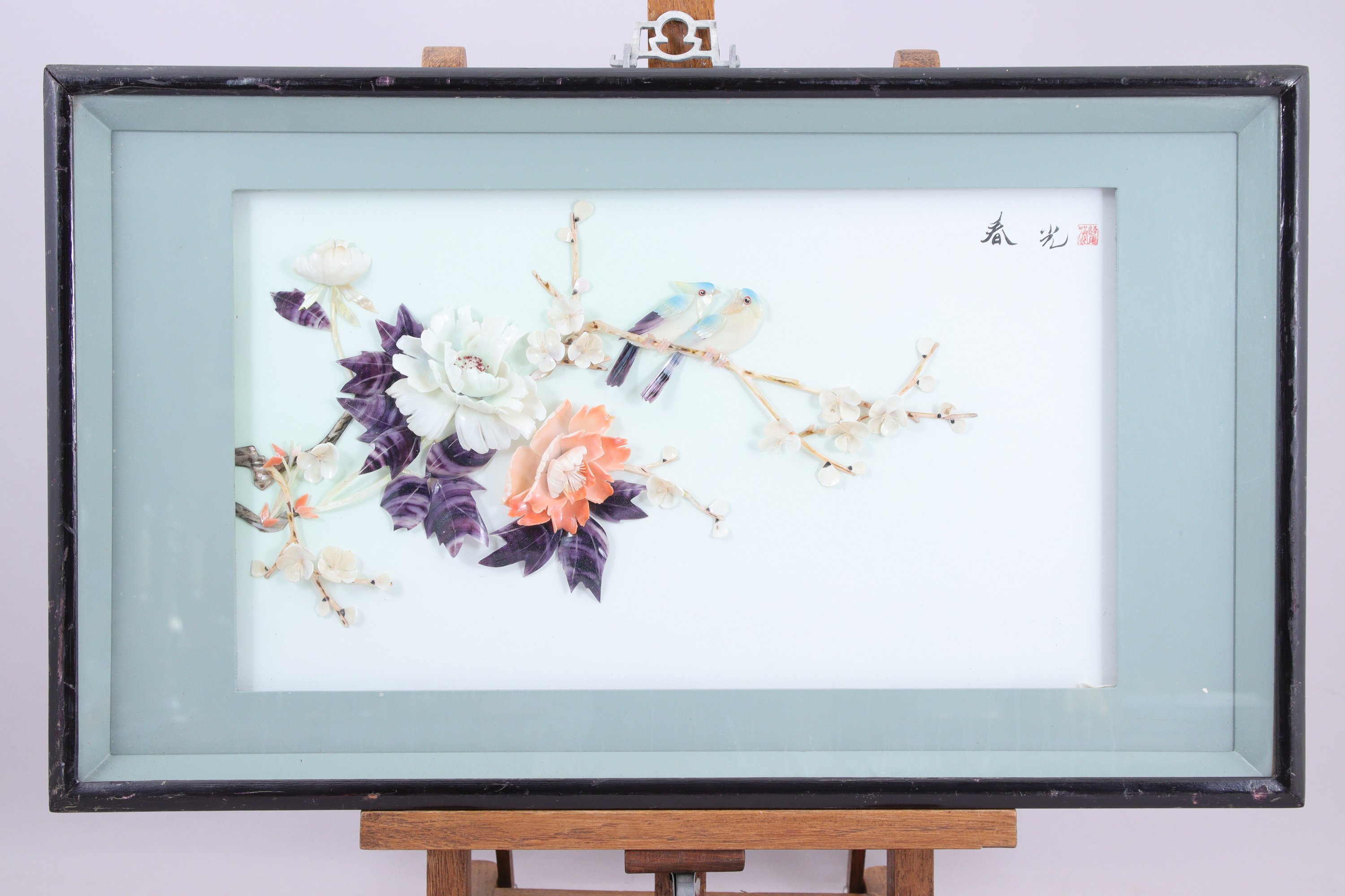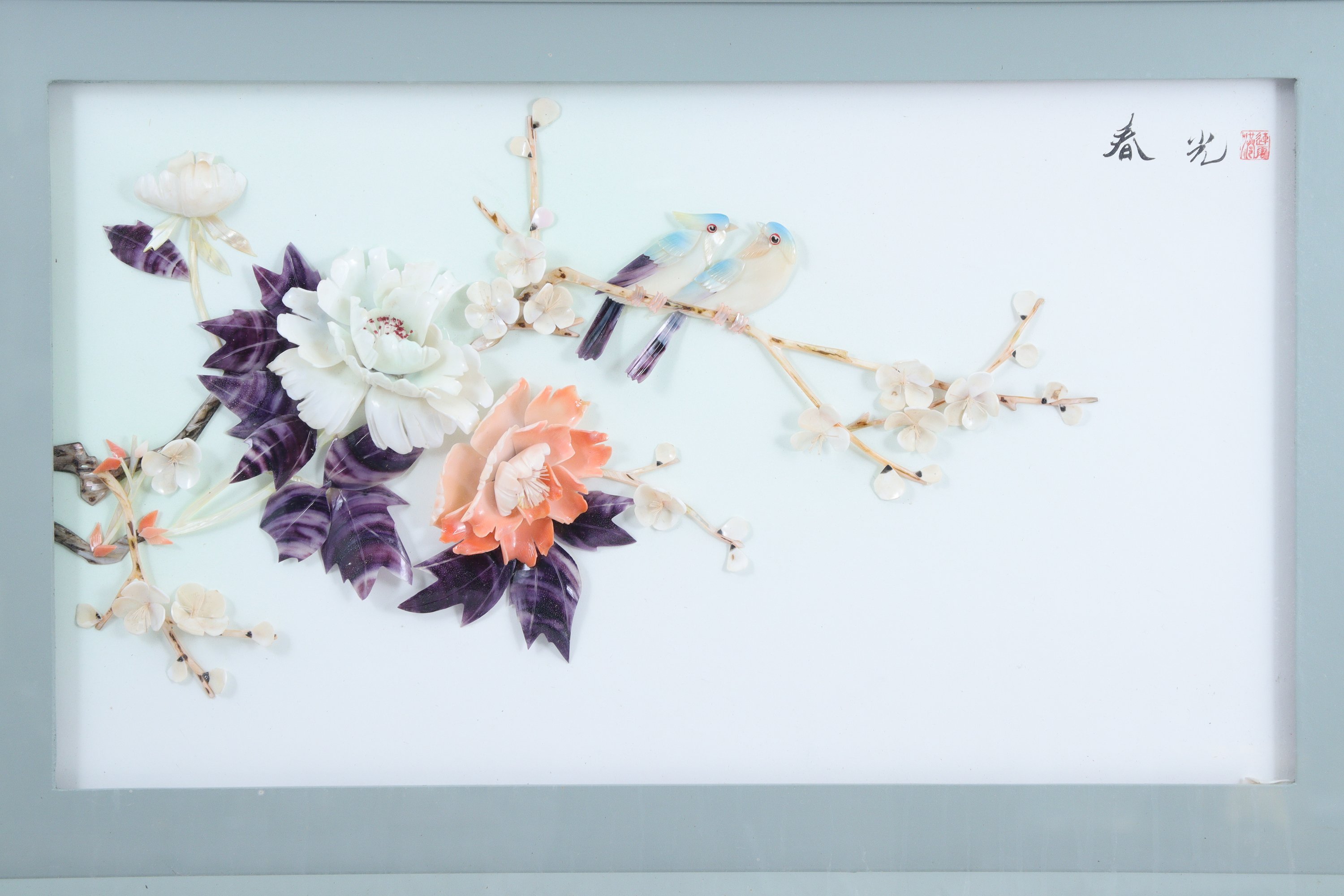 - Composition aux oiseaux branchés, dans un encadrement sous verre 35,7 x 60,5 cm (Accidents).