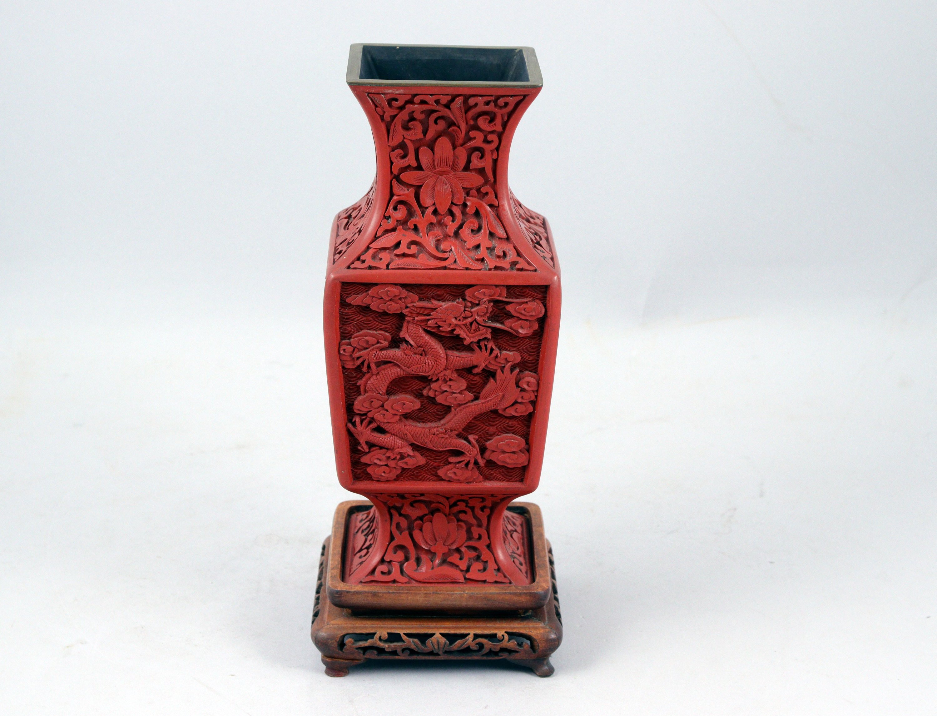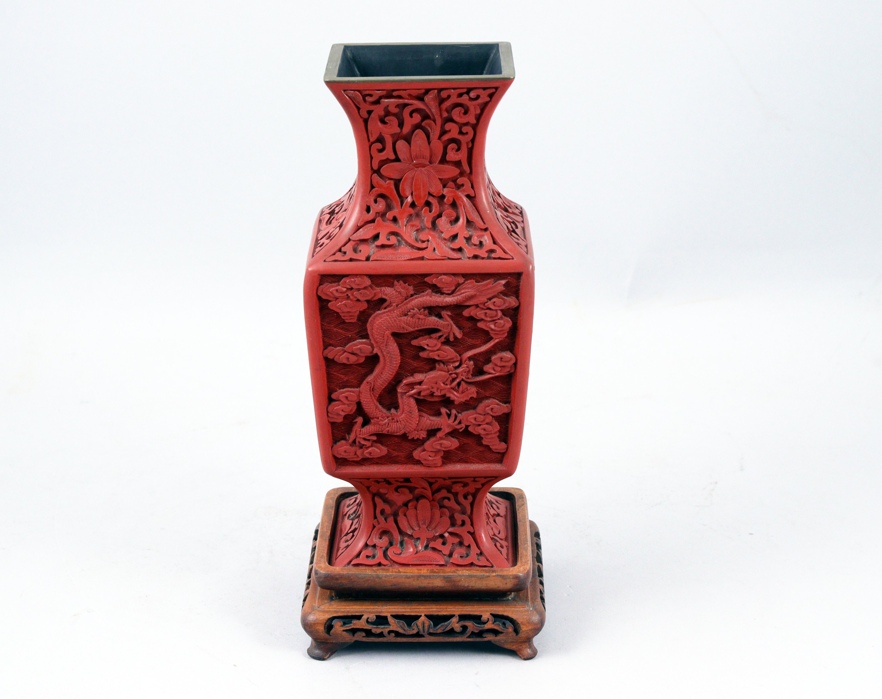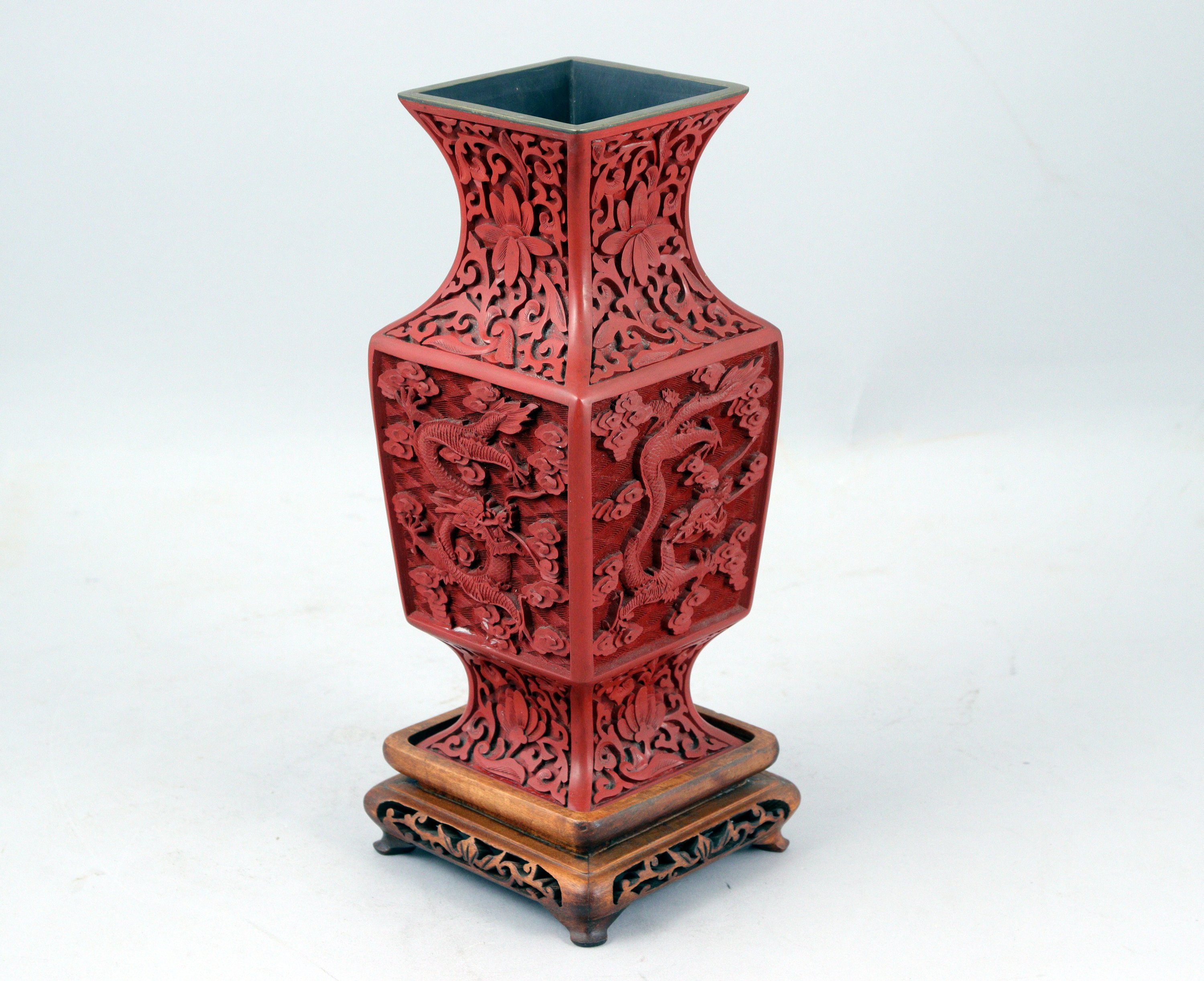 Chine, XXe siècle.Vase quadrangulaire en laque, à décor de dragons....