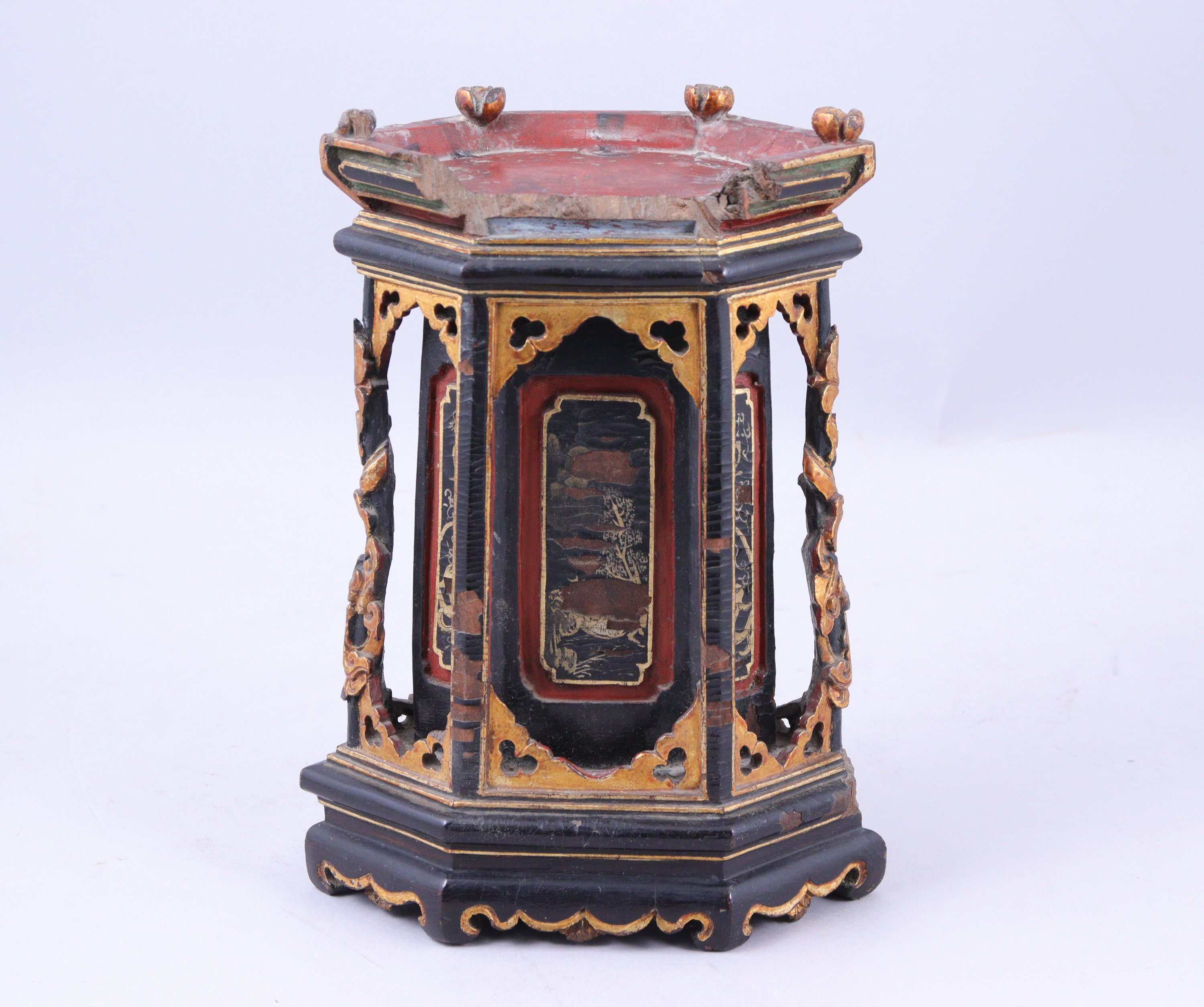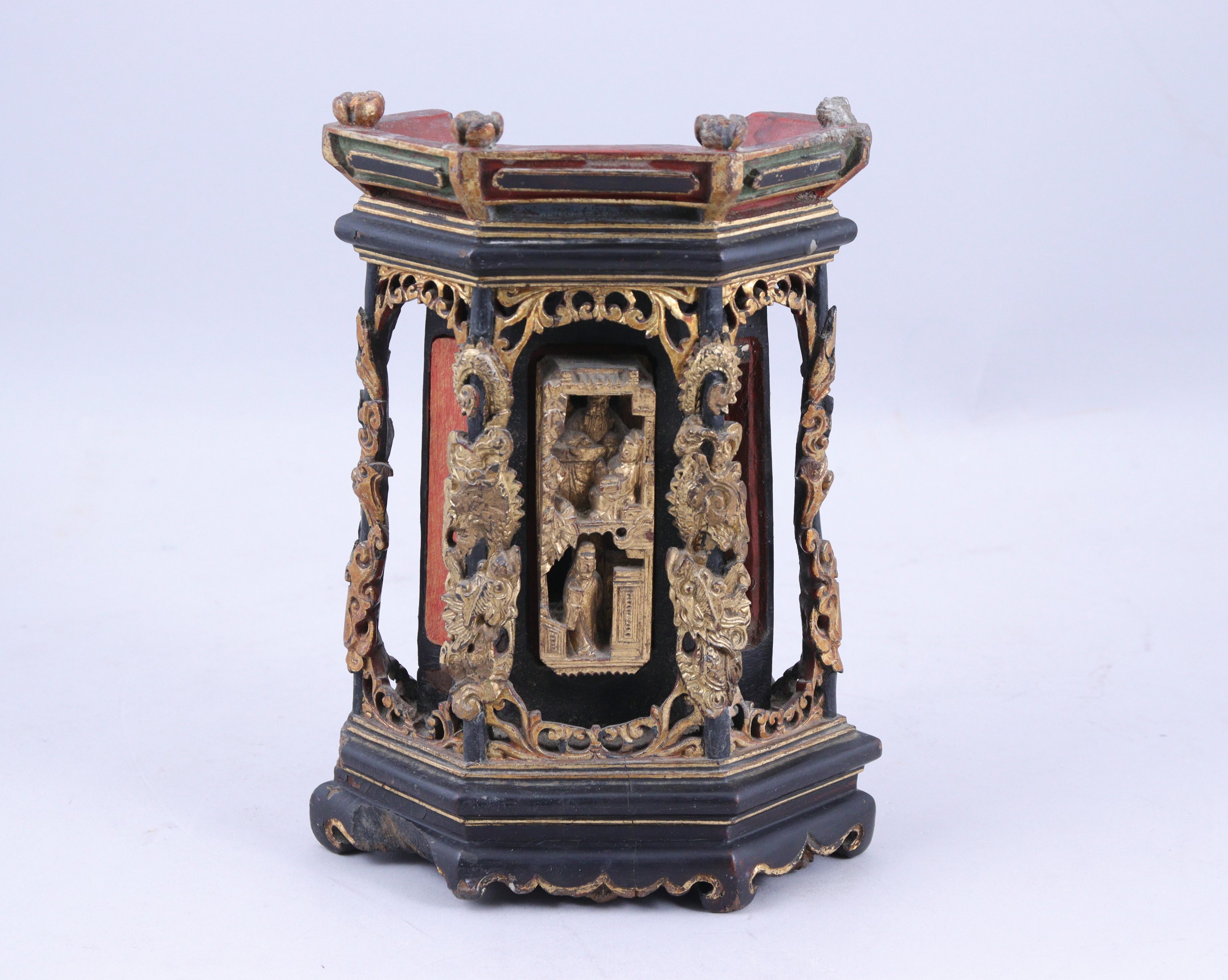 En bois sculpté doré et laqué. Une niche en partie centrale figurant en hauts reliefs des lettrés.