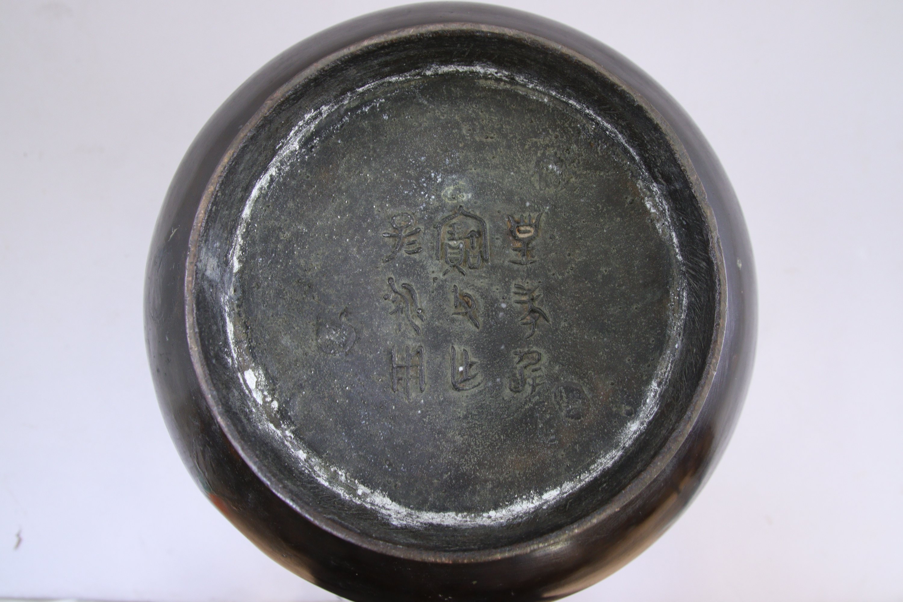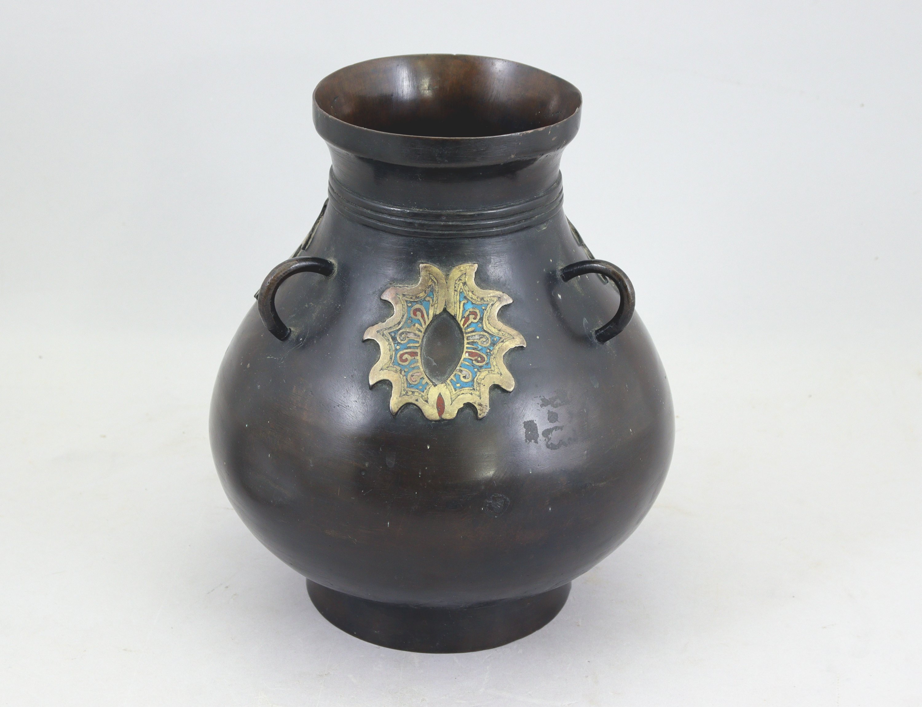 en bronze à trois anses au décor de médaillon en émail champlevé. Marque à neuf caractères.