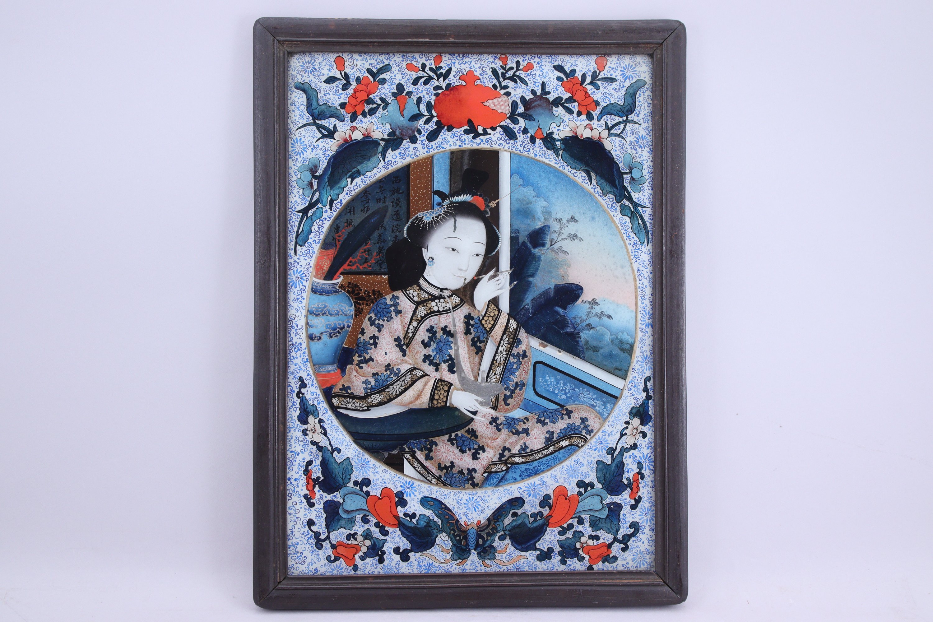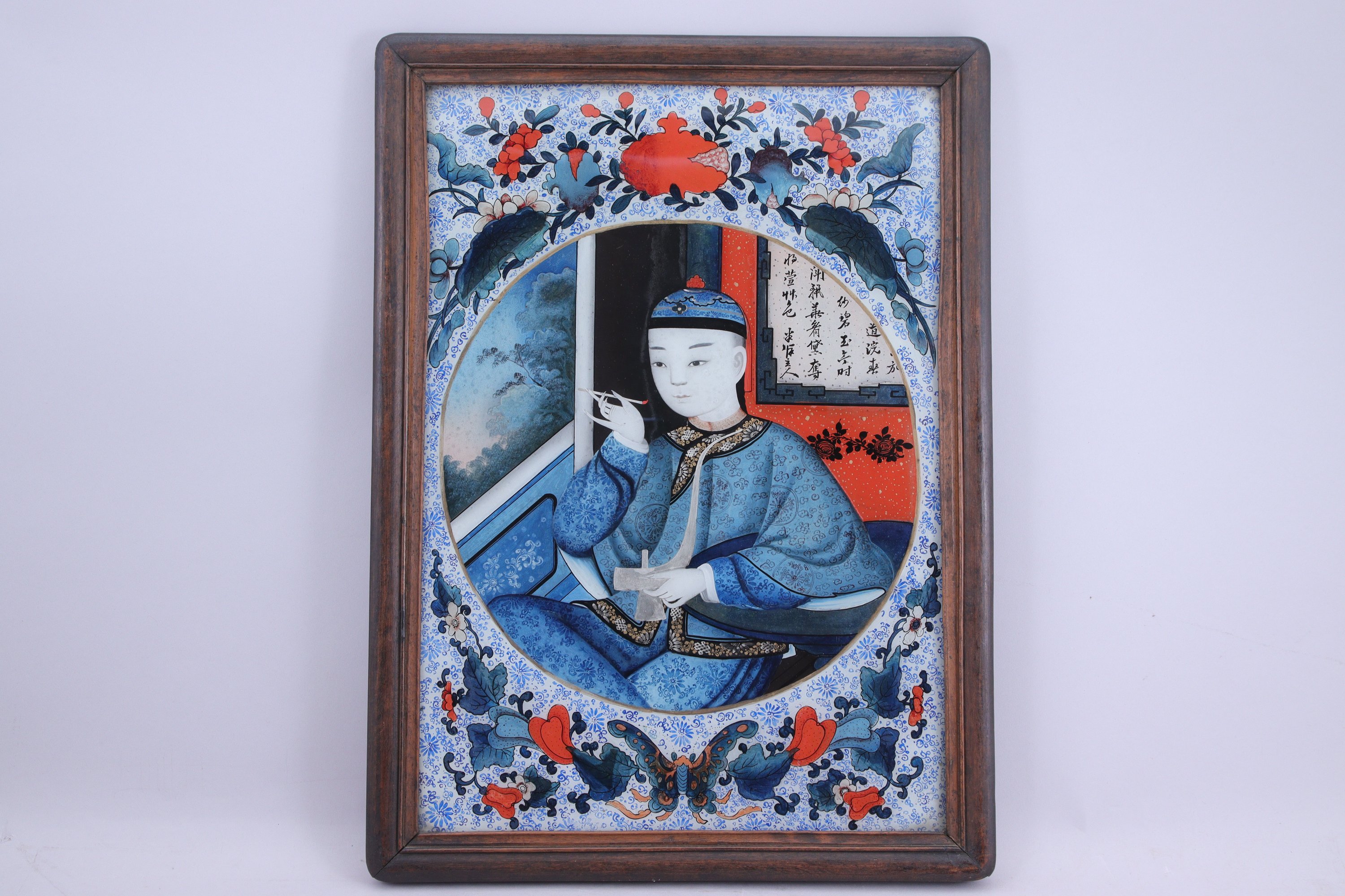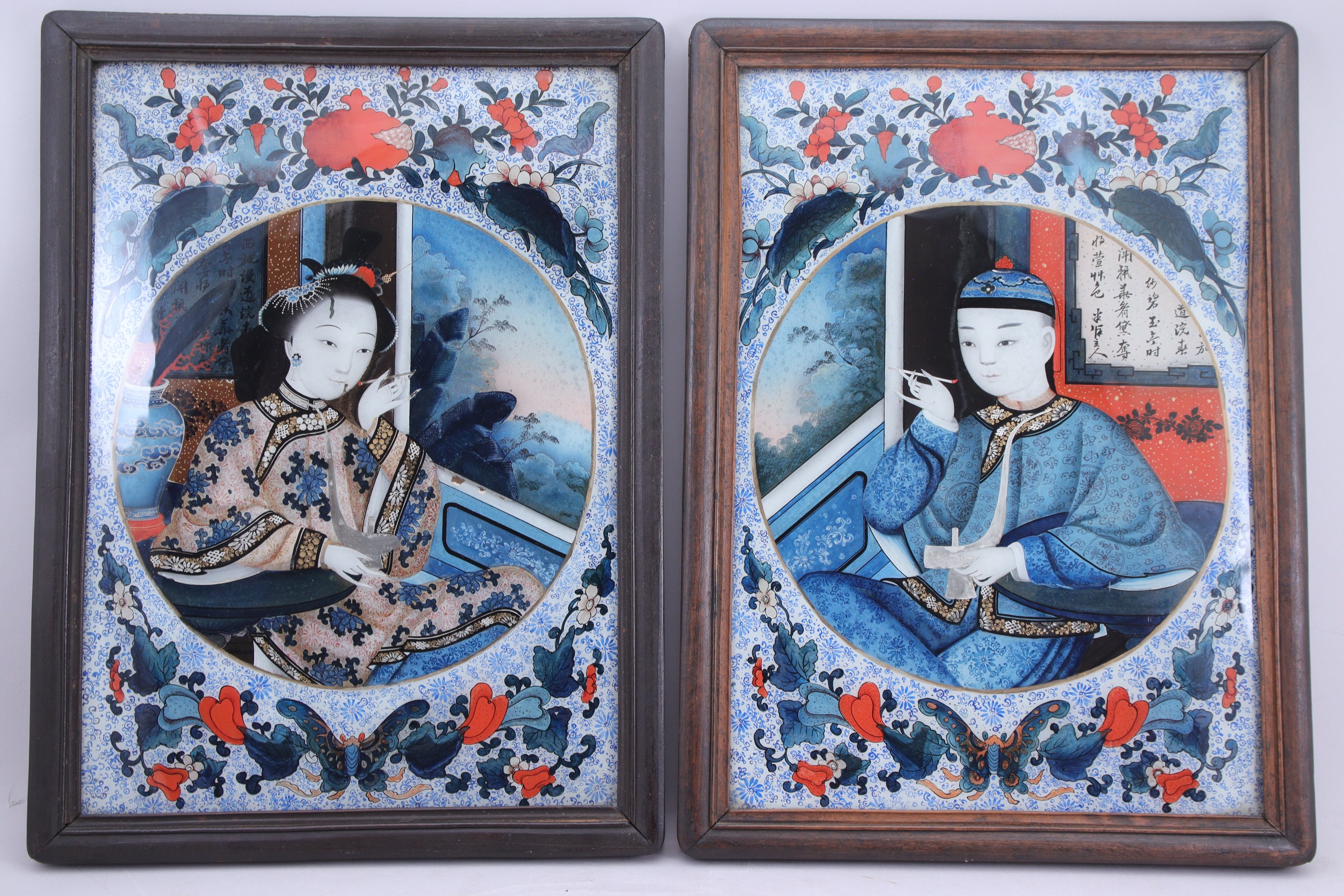deux peintures fixées sous verre, représentant les deux fumant, dans un médaillon rond entouré de grenades et papillons.