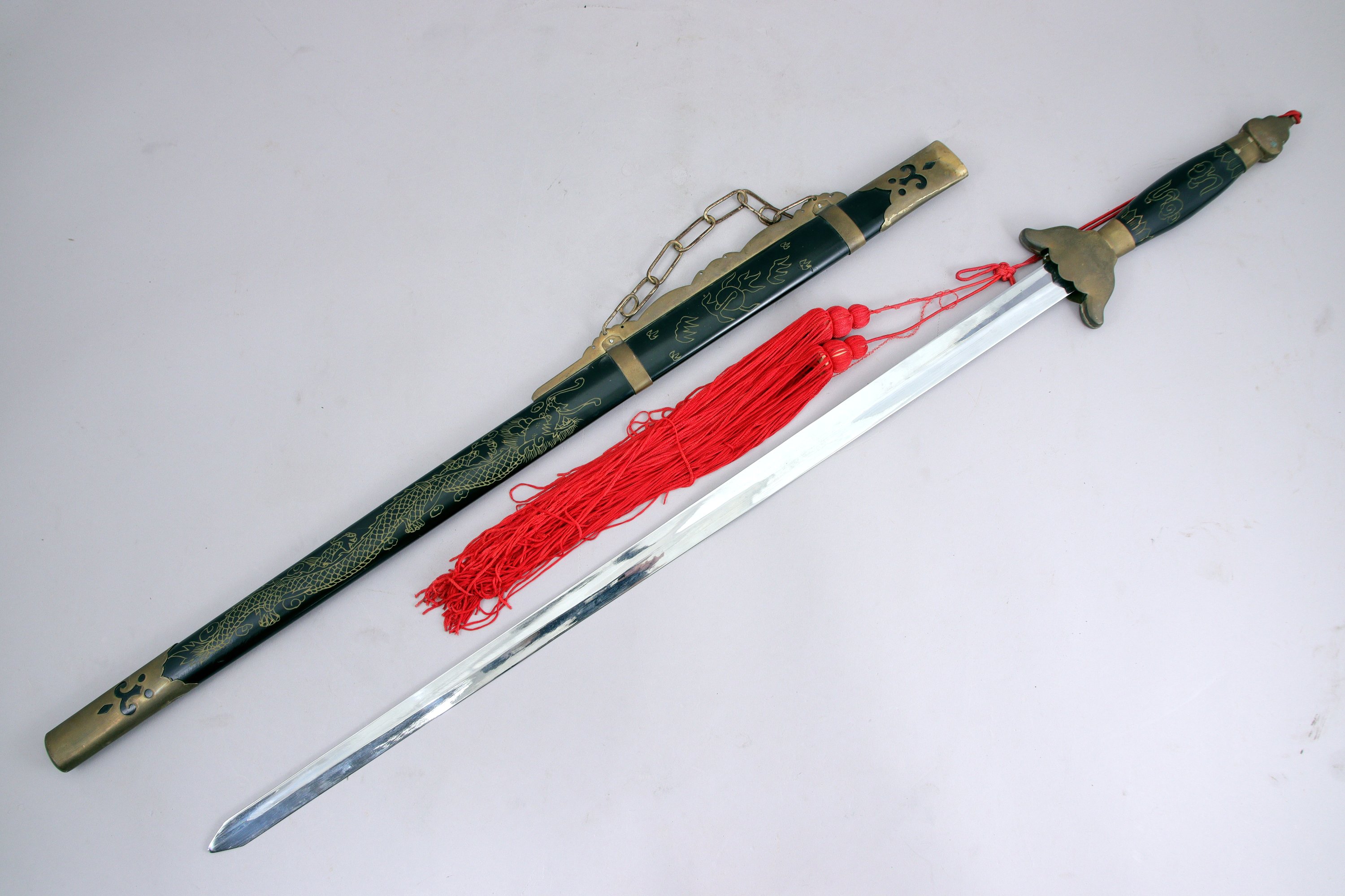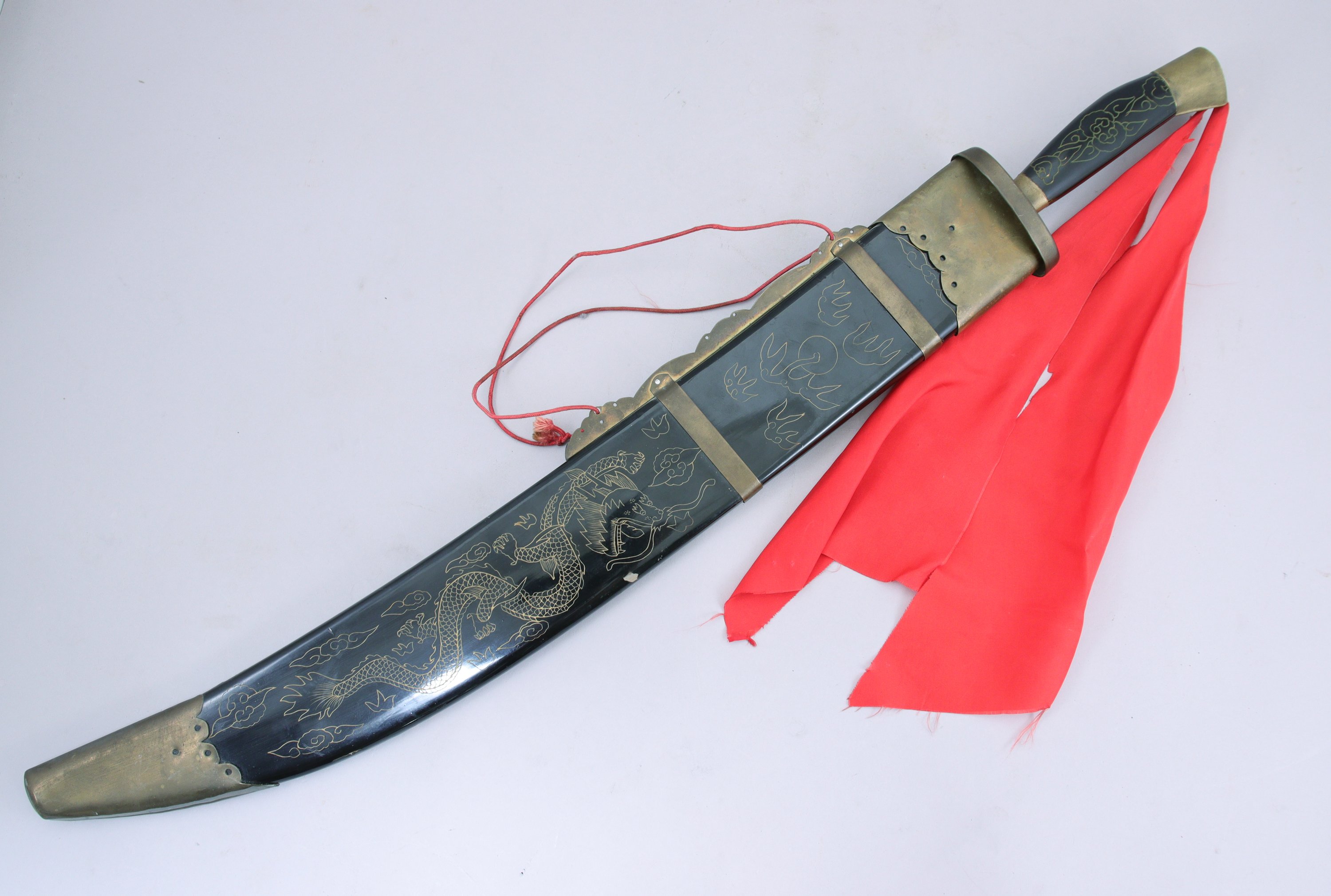 - Sabre Dao de Kung Fu à lame courbe, poignée et fourreau en bois peint en noir, décorés de dragons et de motifs gravés.