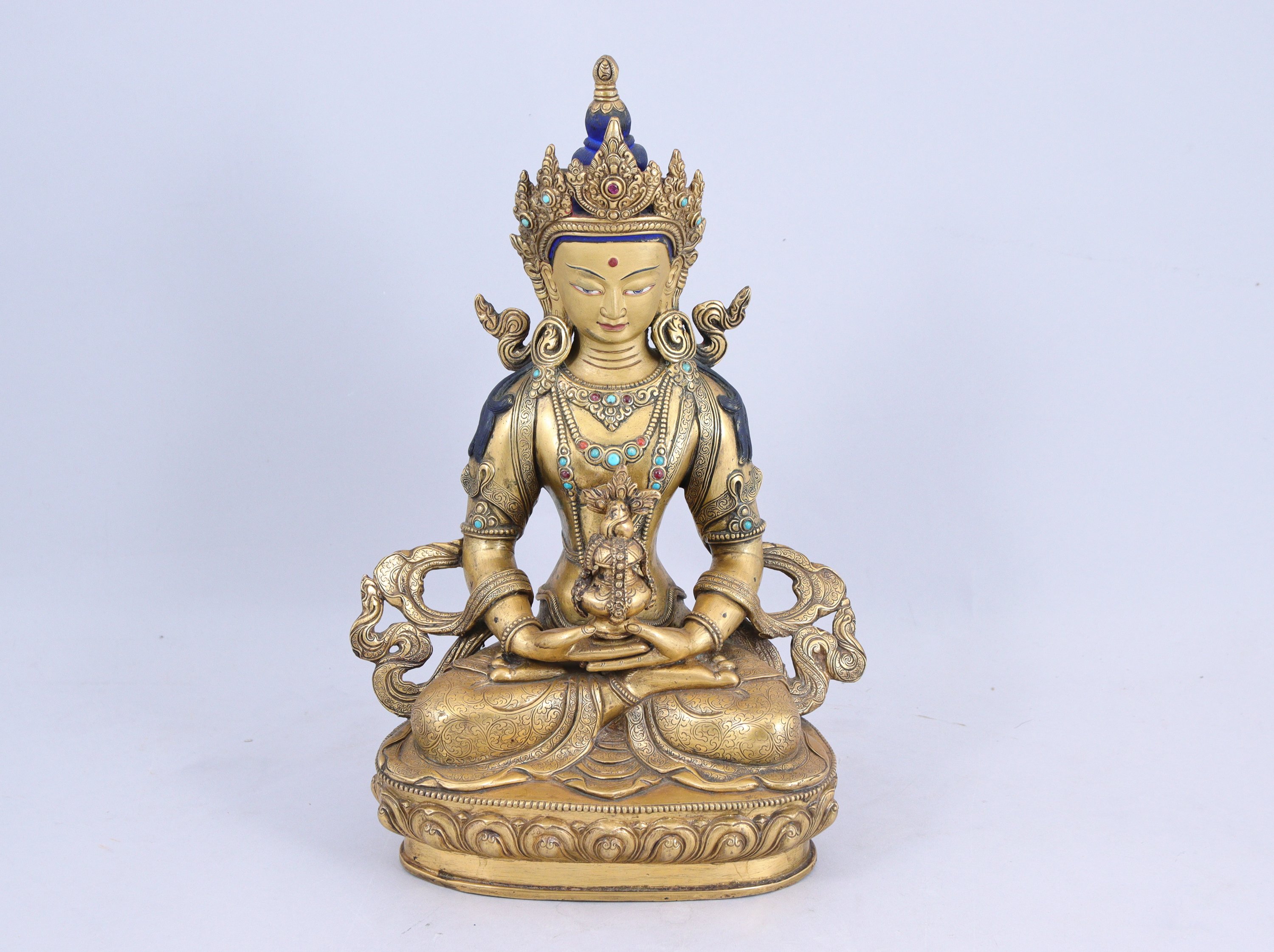 Tibet, moderne.Statuette de Bouddha couronné en bronze doré rehaussé de...