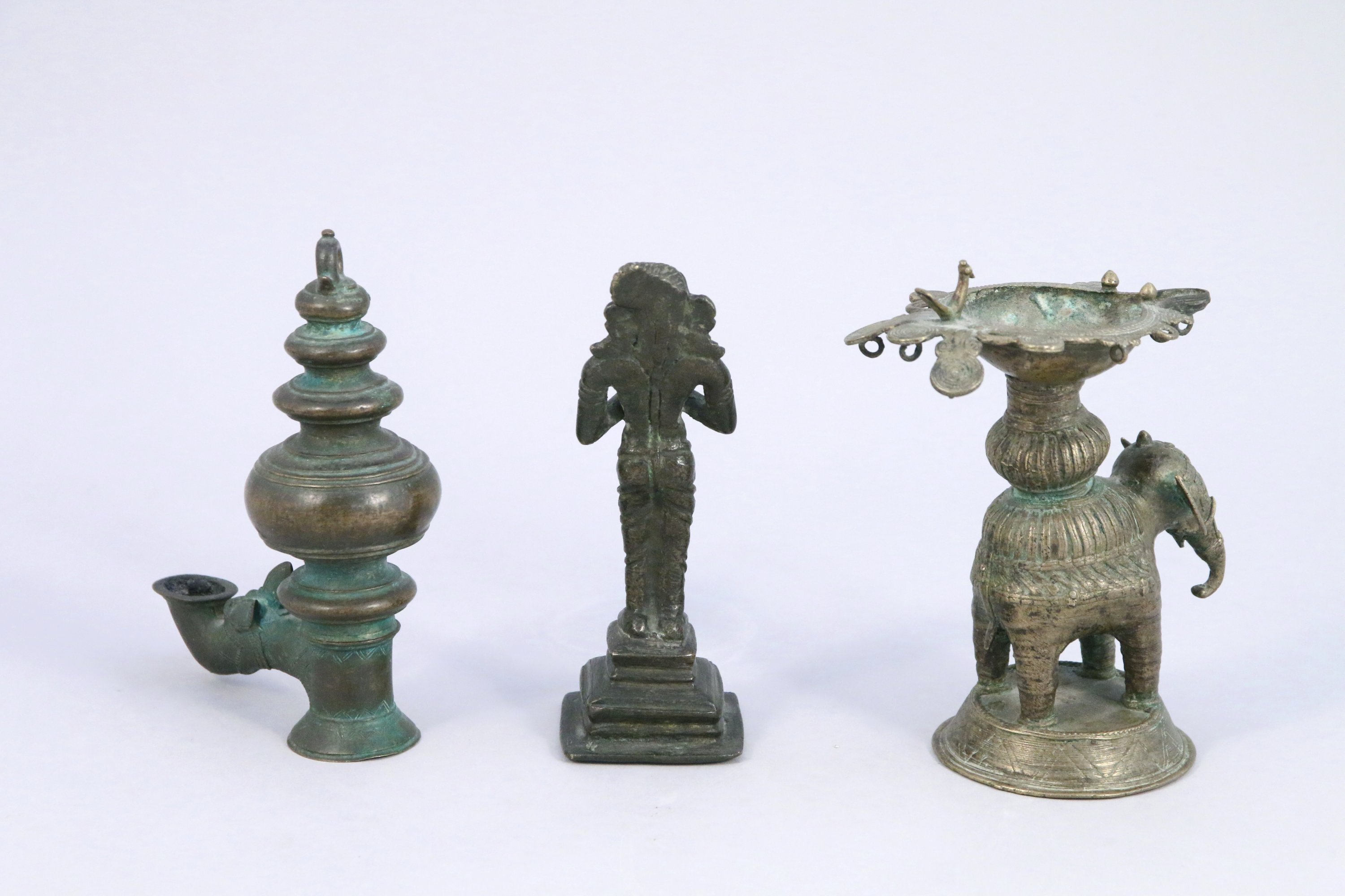 en bronze, la première lampe, au corps bulbeux et réceptacle à huile coudé et sortant de la gueule d’un makara, la seconde en forme d’éléphant portant sur son dos un réceptacle semi-sphérique agrémenté d’un oiseau. La statuette représentant une divinité féminine à la poitrine dénudée et les mains en prière (manque).