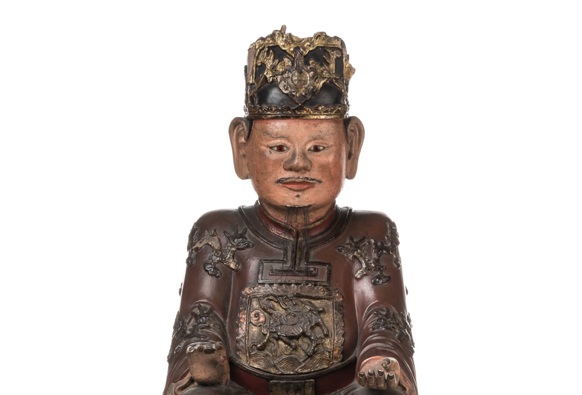 Statuette de dignitaire en bois sculpté laqué or et polychrome, assis sur un trône, le dos de la main gauche posé sur le genou gauche, le poignet droit appuyé sur le genou droit.