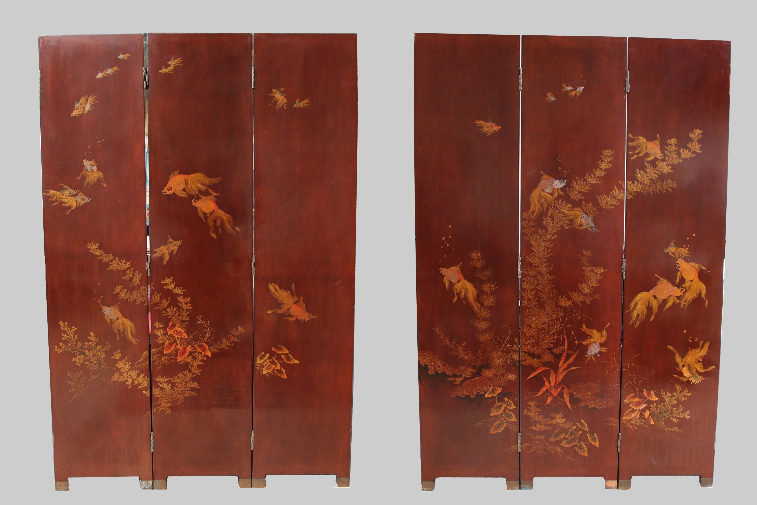en laque brun rouge à décor en laque or de poissons nageant parmi les algues.