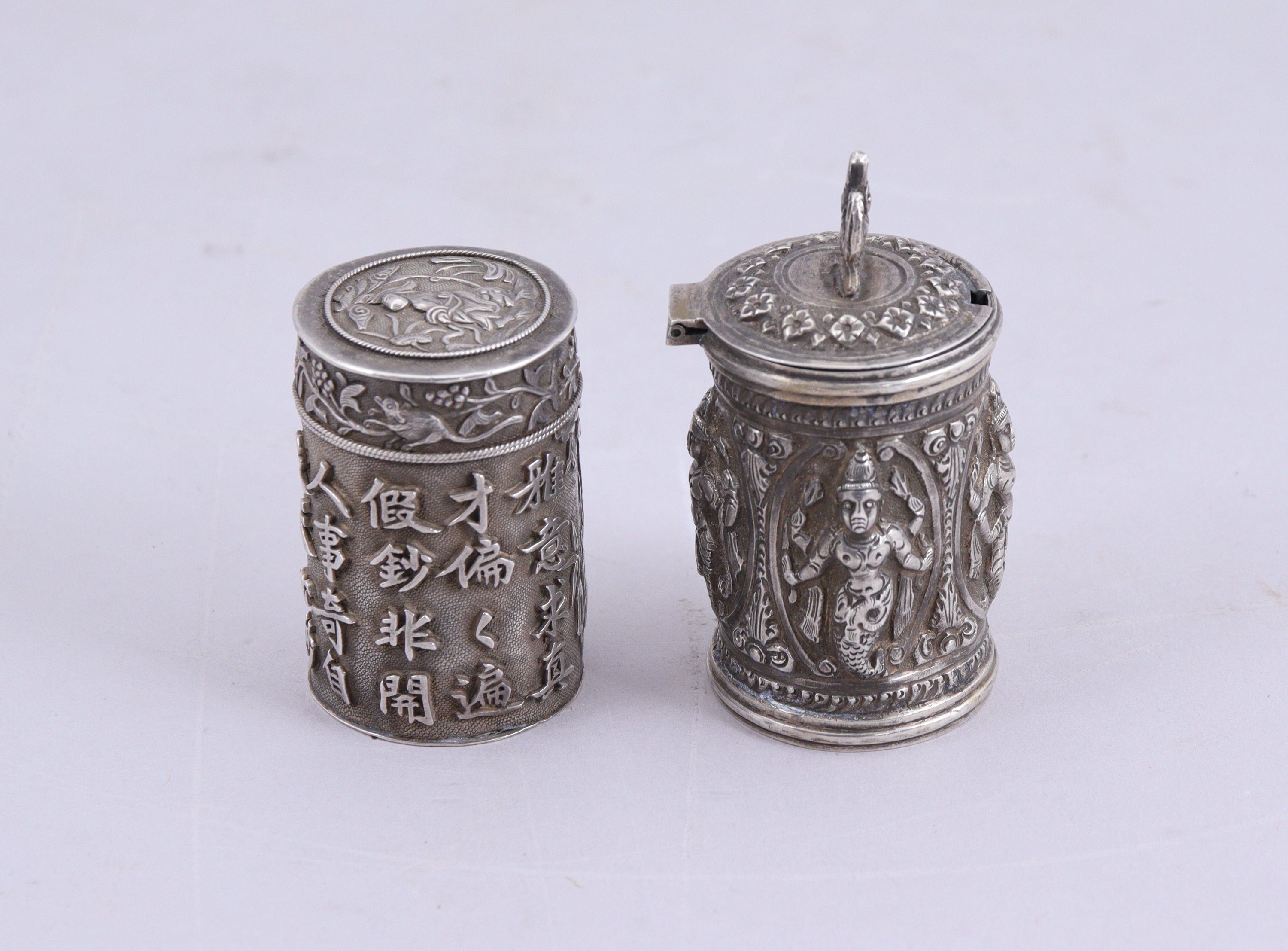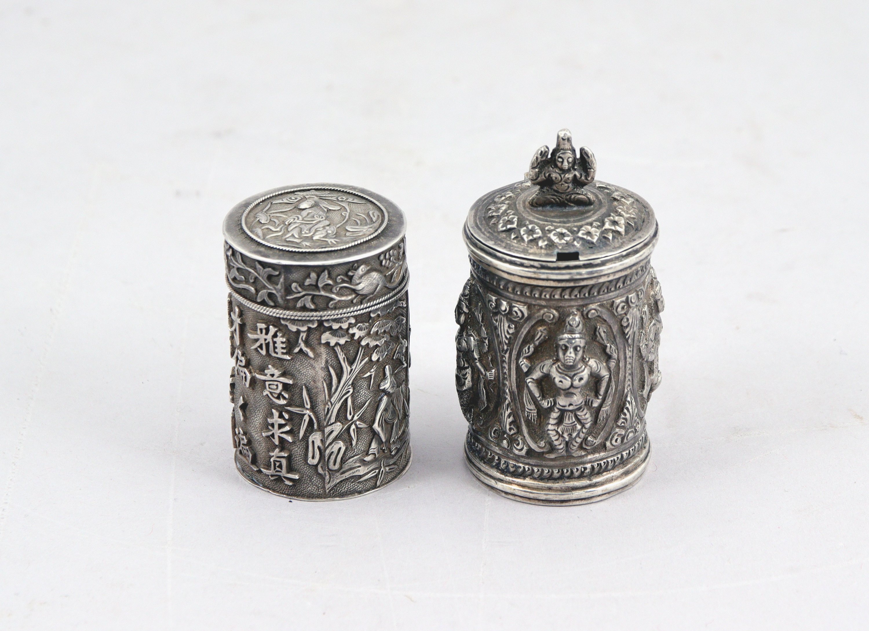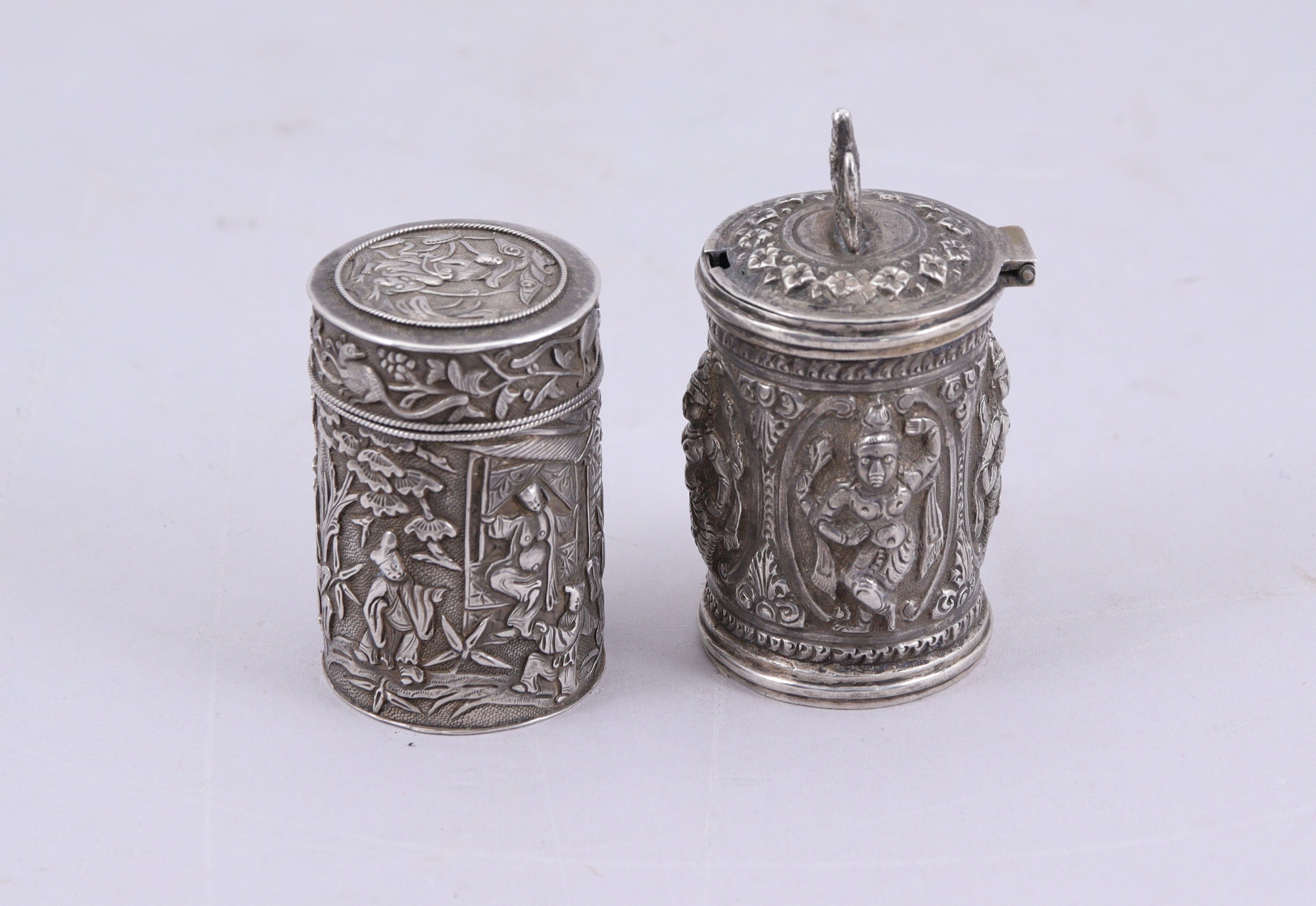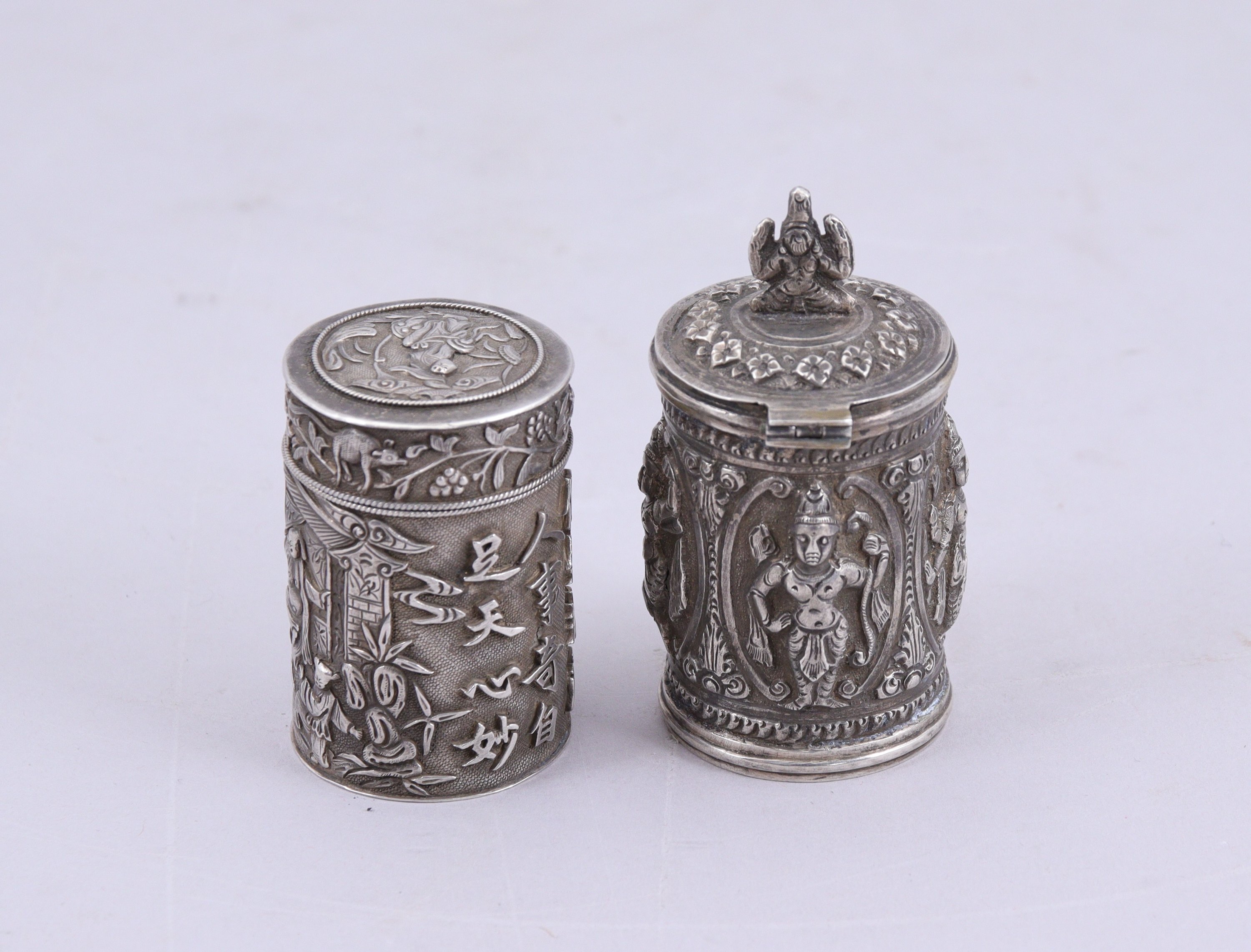 Deux boîtes à ongueant de forme cylindriques en argent. L'une finement rehaussée d'un scène de jardin avec un poème et une frise de rats, l'autre avec des danseuses khmères.