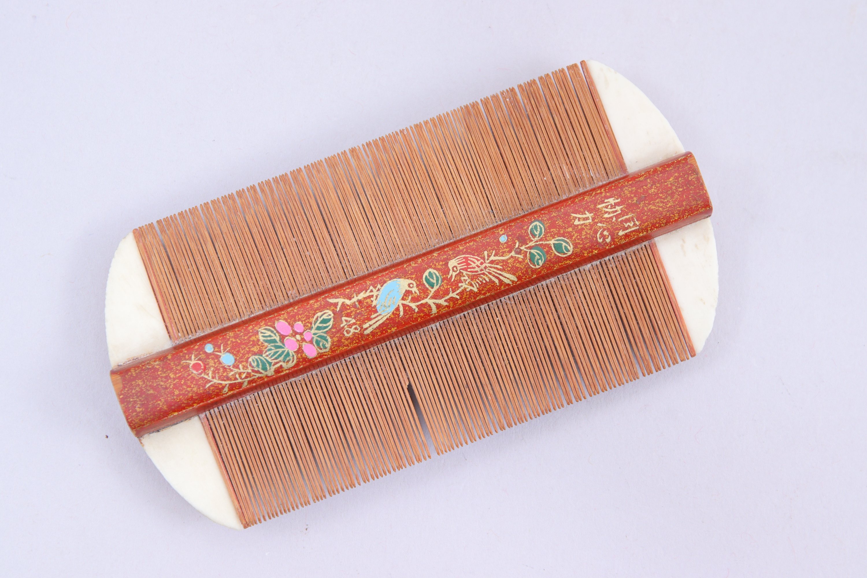 JOINT : Peigne en bambou peint et en os. Long. 410,5 cm (une dent cassée).