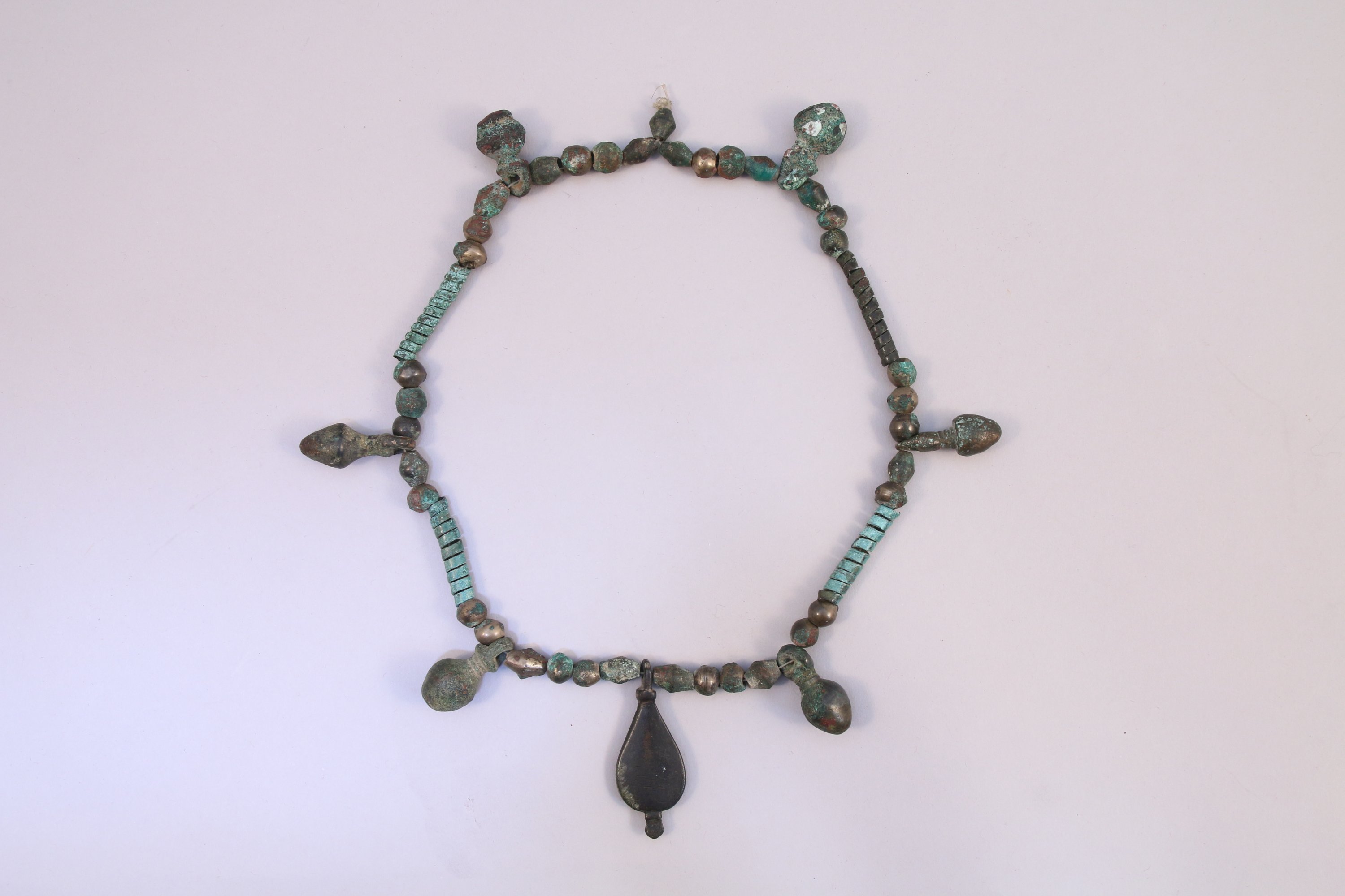 Collier de pendeloques et de perles en forme de sphères et de spirales, en bronze et alliages cuivreux.