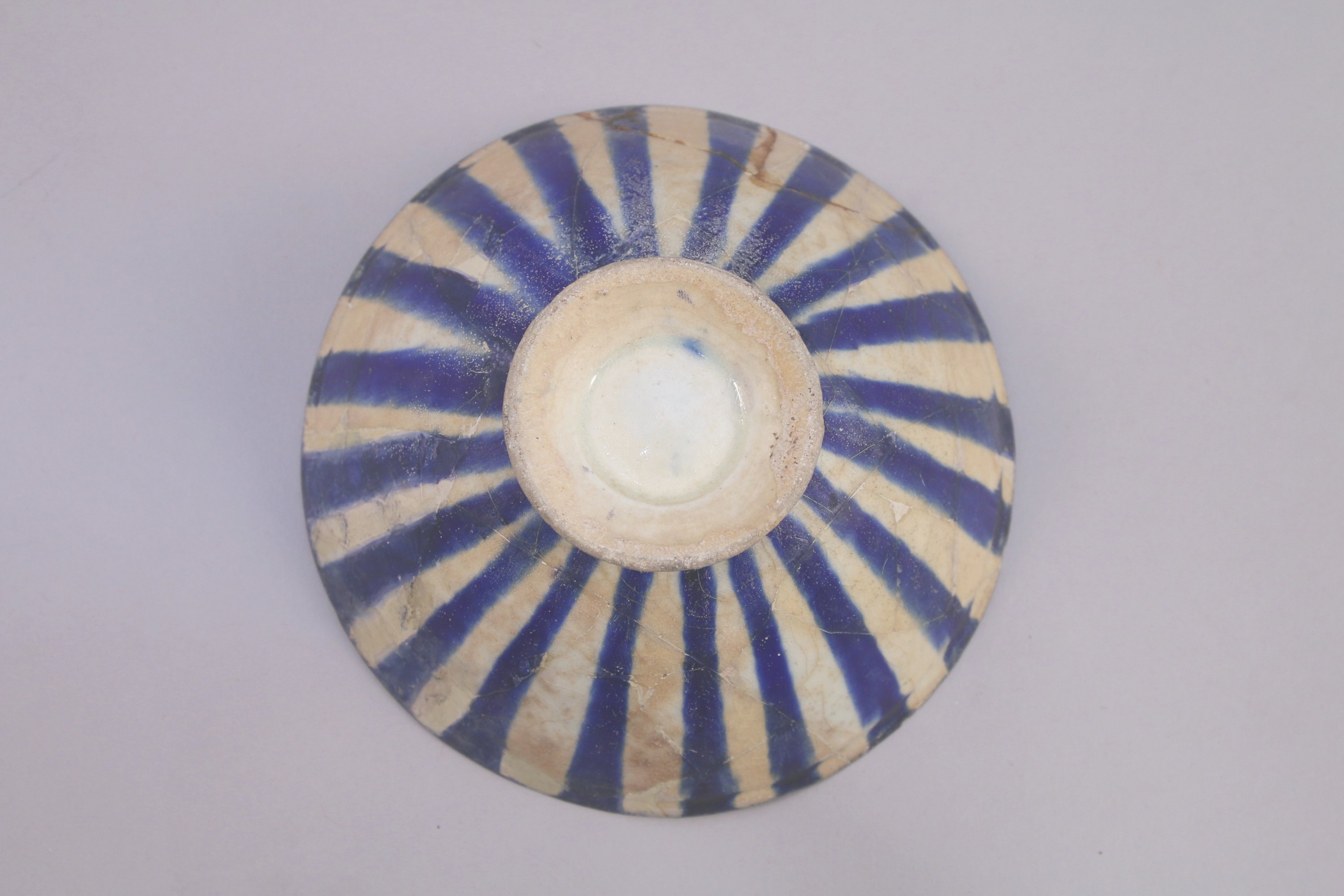 Coupe à décor rayonnant, céramique siliceuse à décor de rayons peints en bleu cobalt sous glaçure.