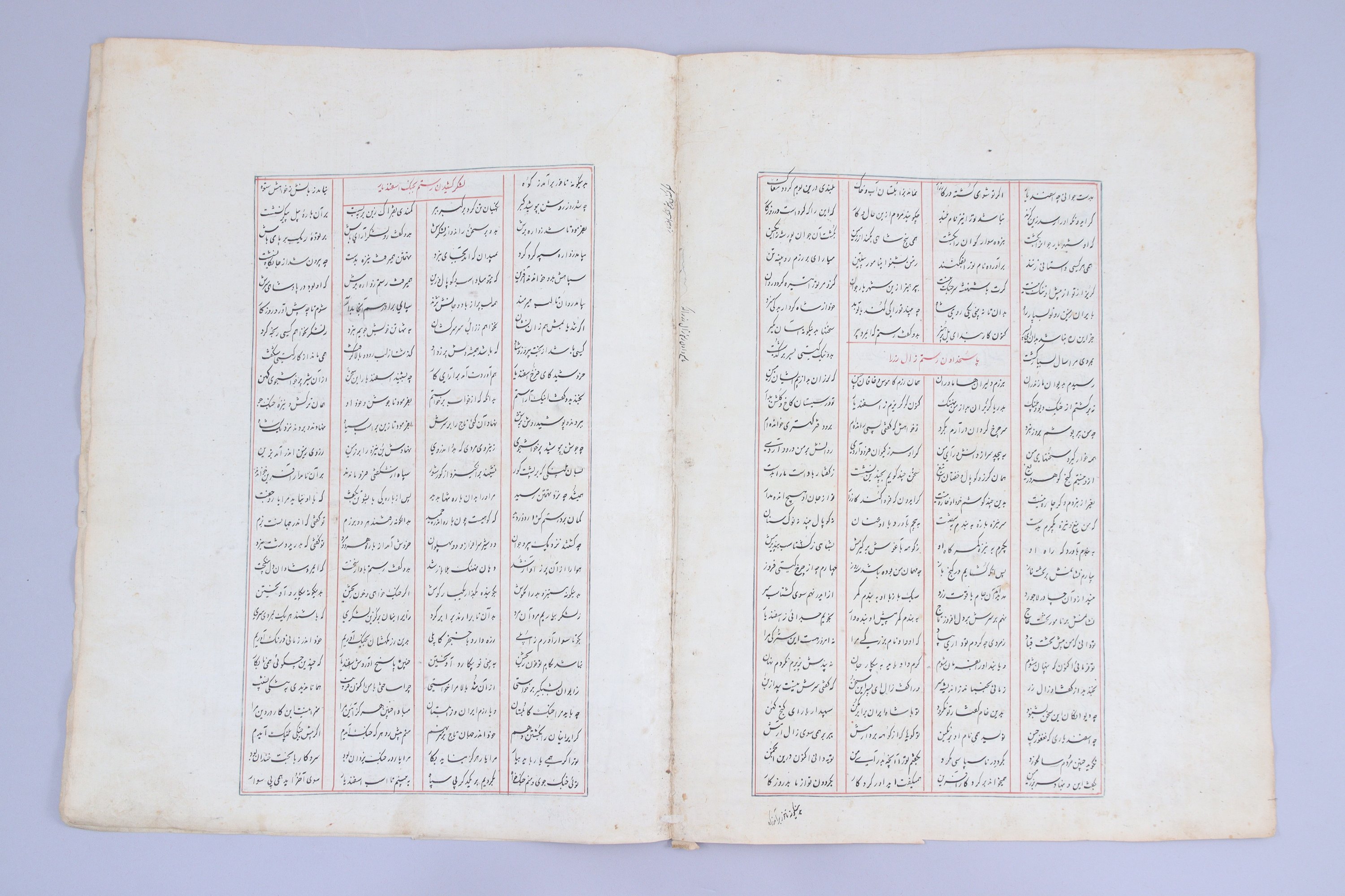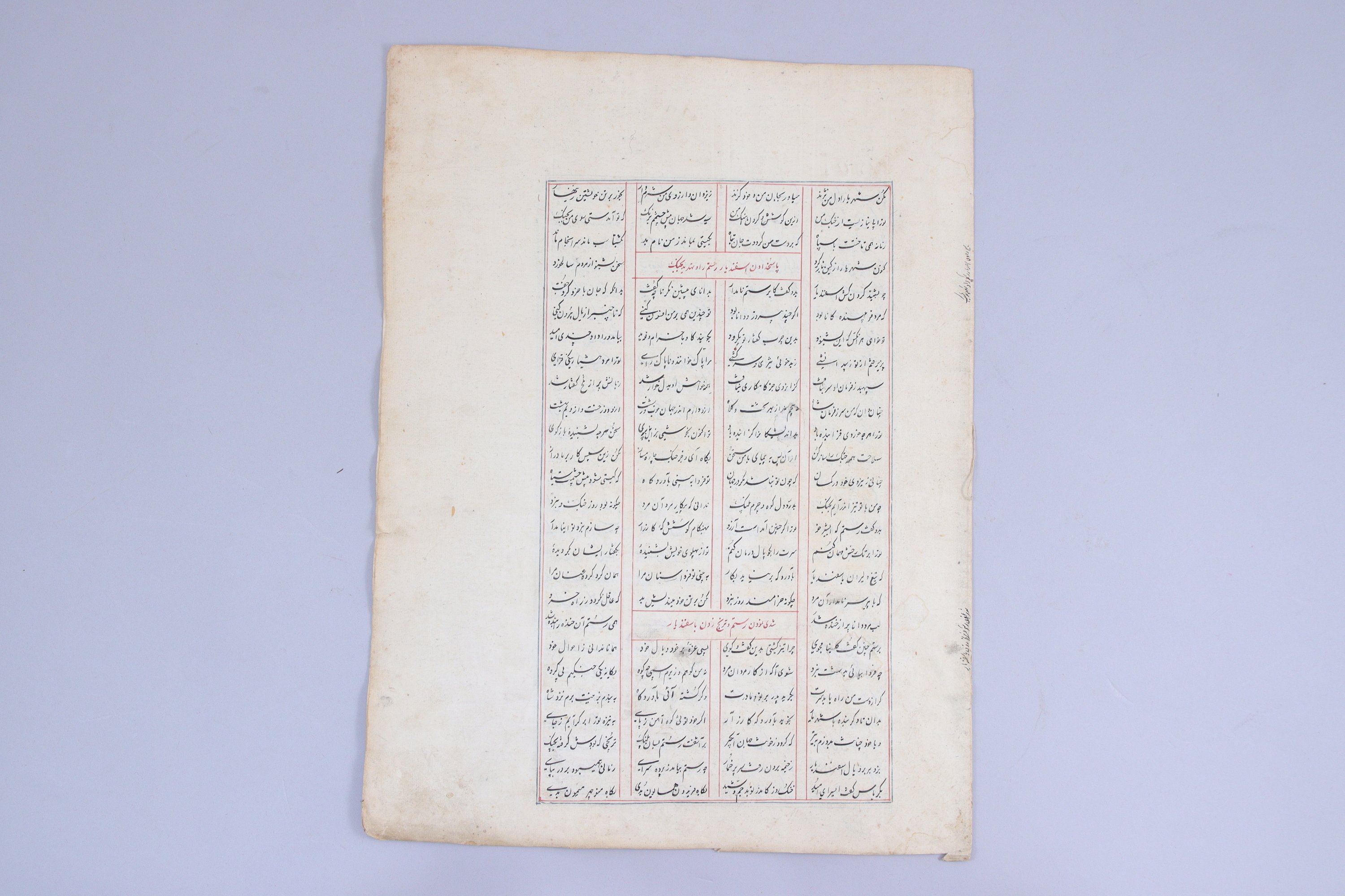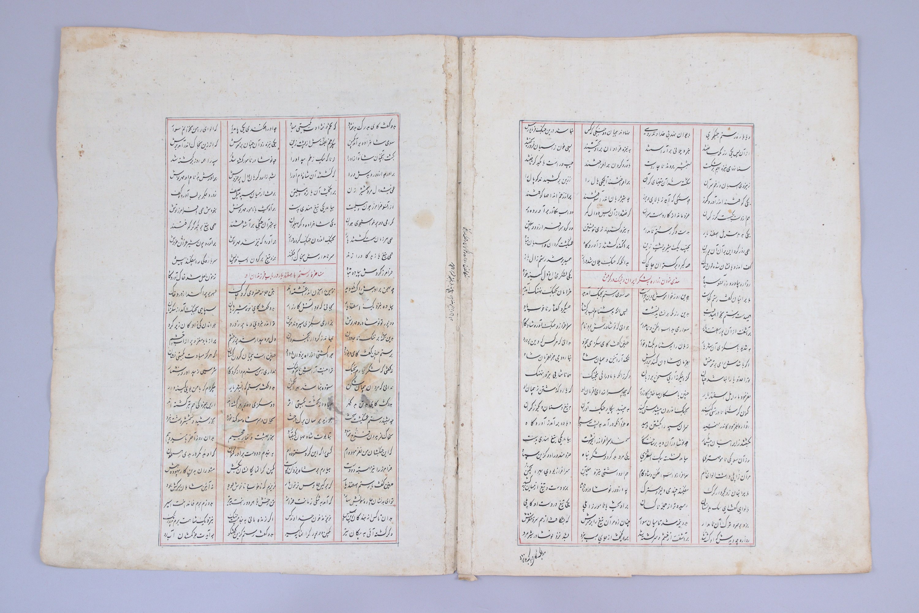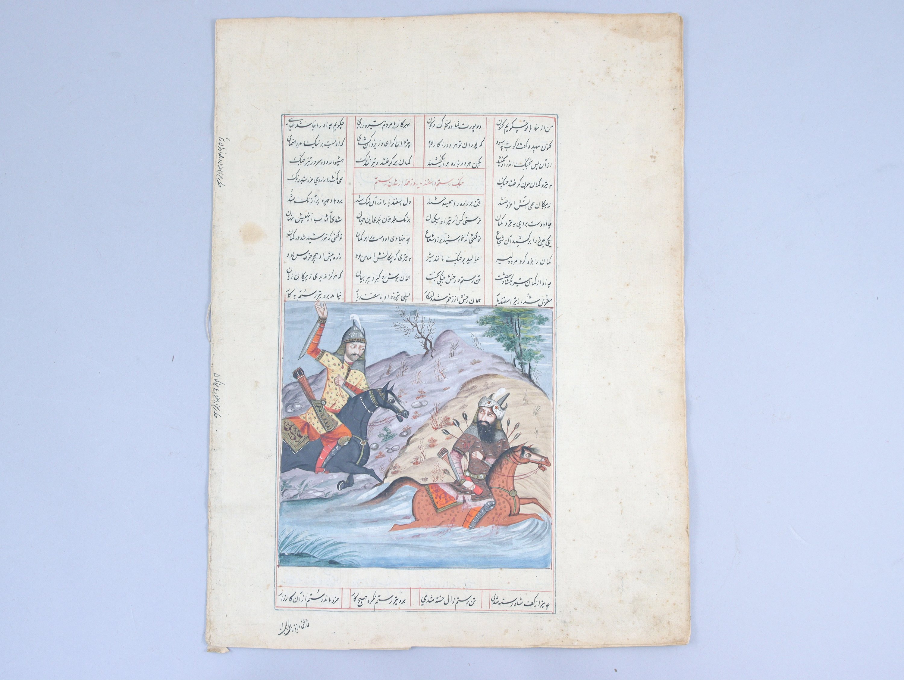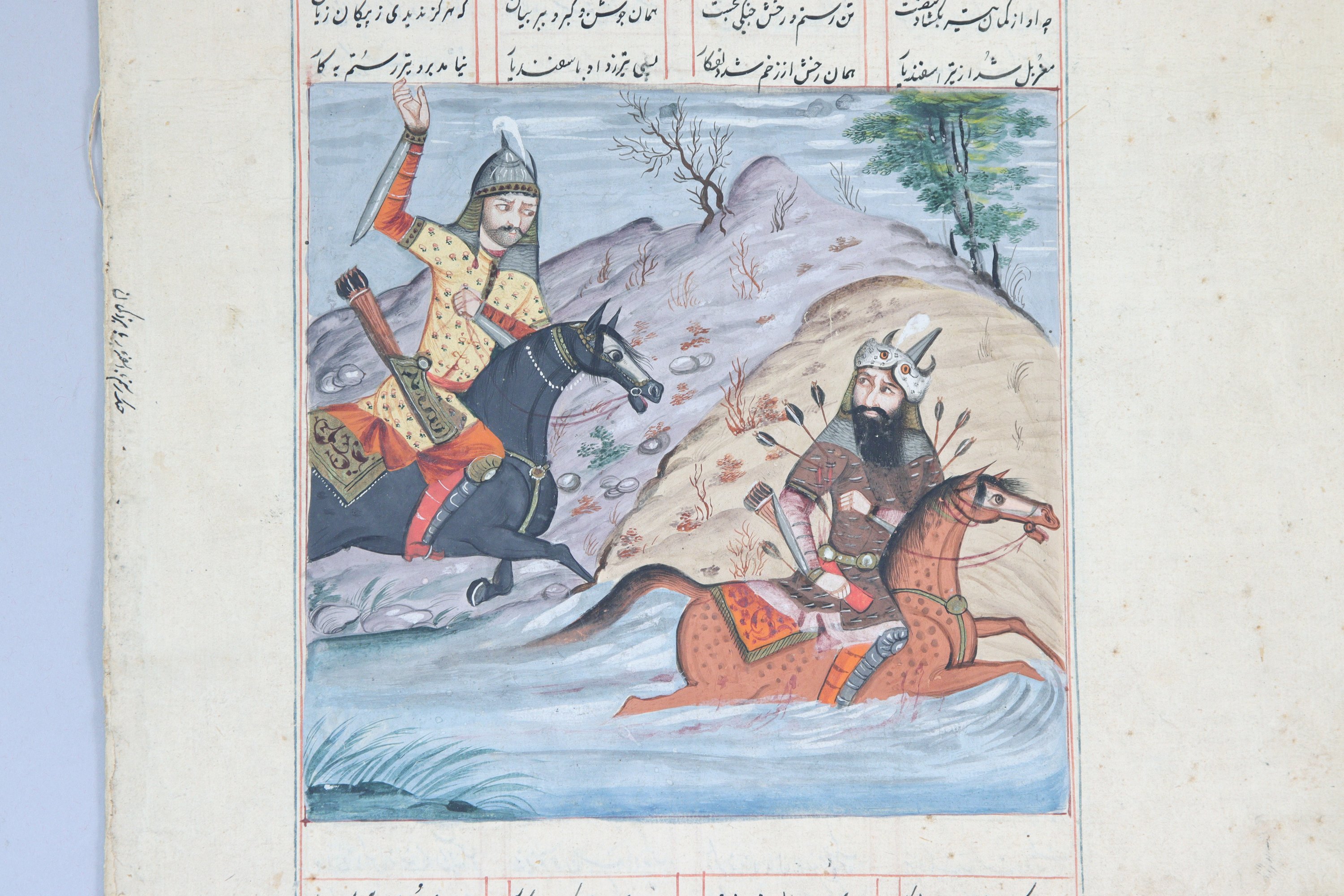 Quatre folios de manuscrit dont l’un orné d’une peinture. Texte sur 4 colonnes, 26 lignes par page en nasta’liq dans un encadrement de filets rouges. Gouache et or sur page de manuscrit représentant Rustam et Isfandiyar combattant.