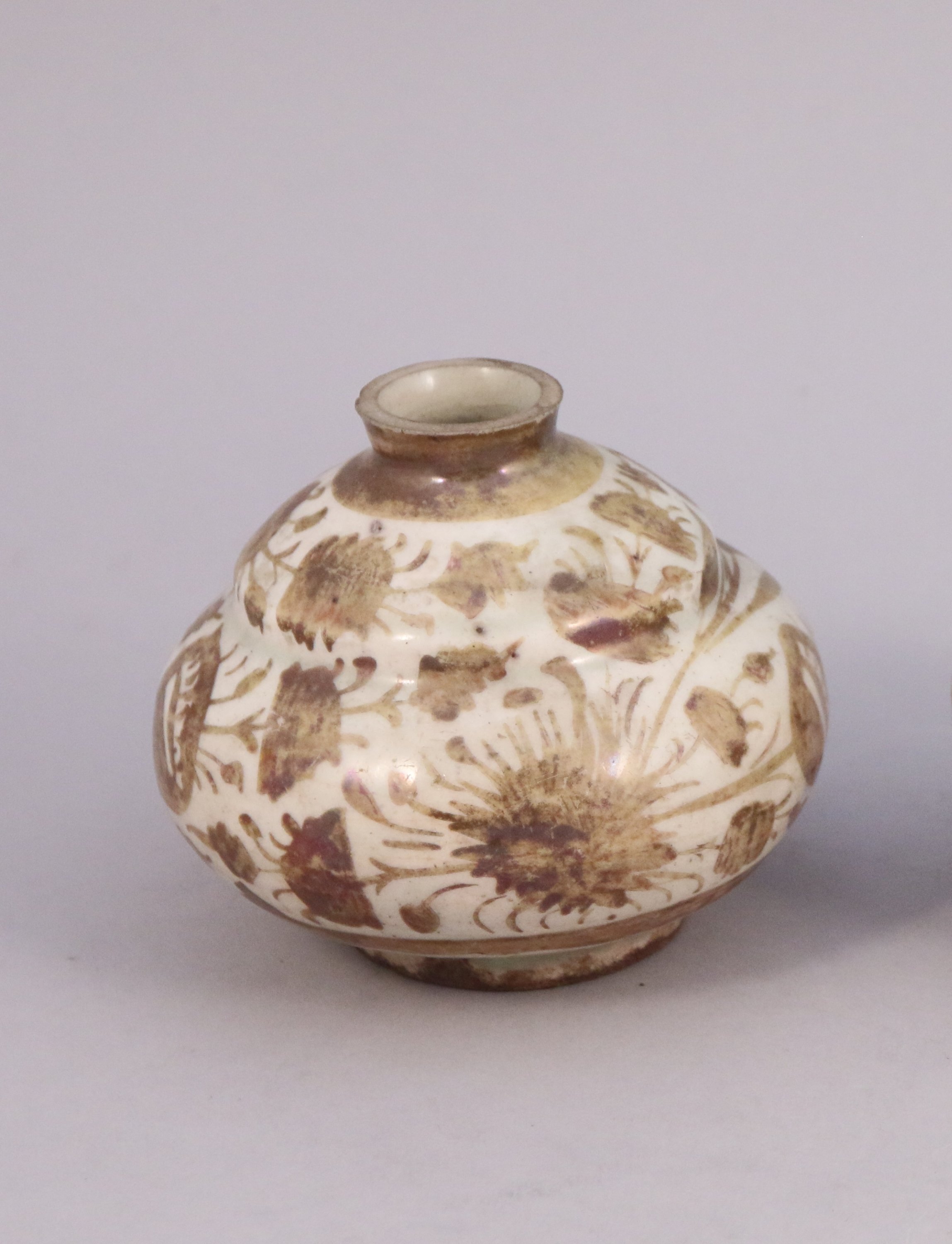 Vase globulaire en céramique siliceuse à décor de lustre métallique, à petit col cylindrique et panse globulaire à ressaut ornée d’un décor floral.