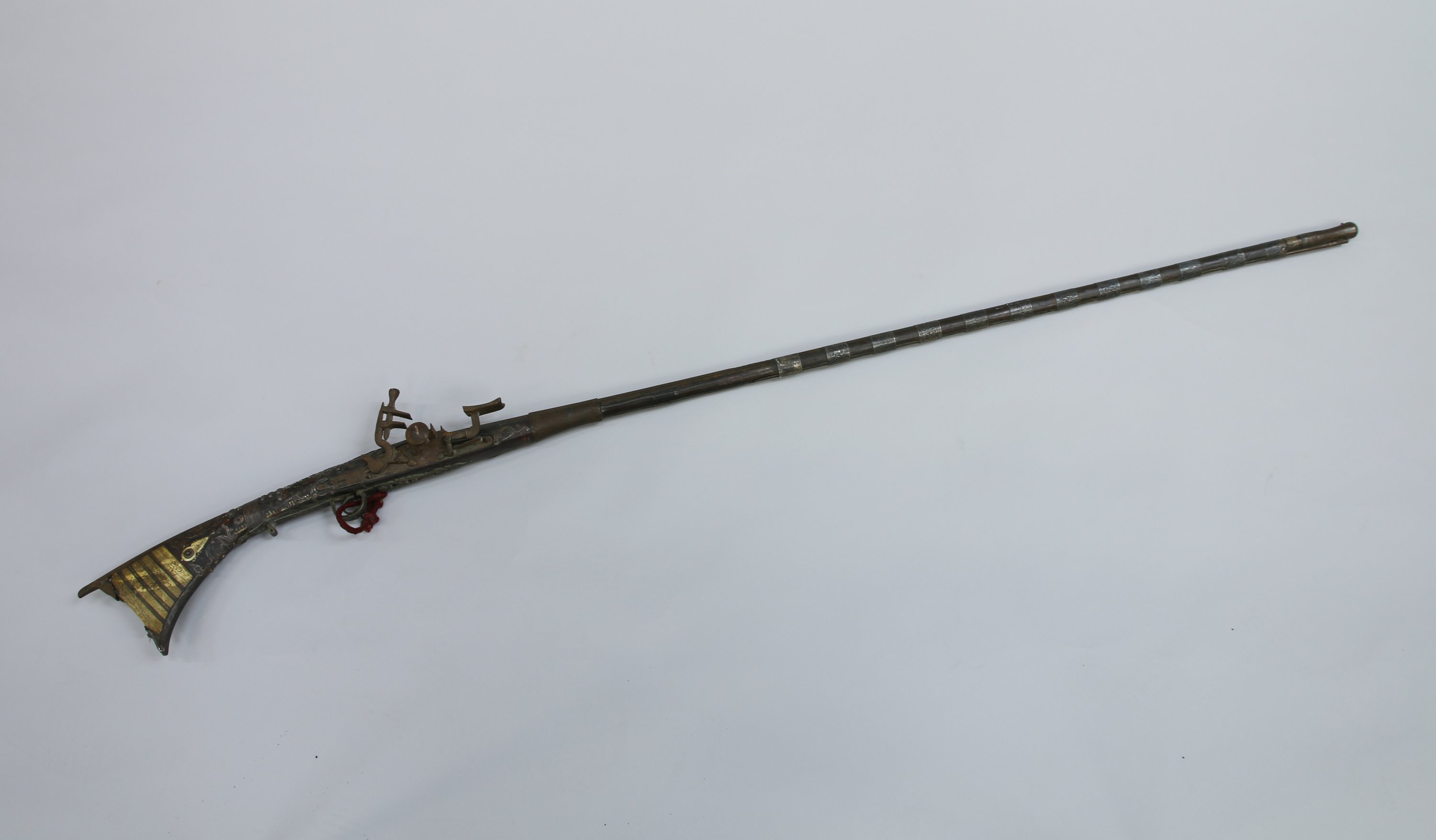 - Fusil dit Mukhala, à silex. Crosse en bois, à talon en plaquettes d'os, richement appliquée de garnitures de fer ajourées de rinceaux, incrustée de pastilles d'os, gravée et peinte de filets et enroulements rouges. Canon fixé au fût par 14 bagues. Long. 166 cm.