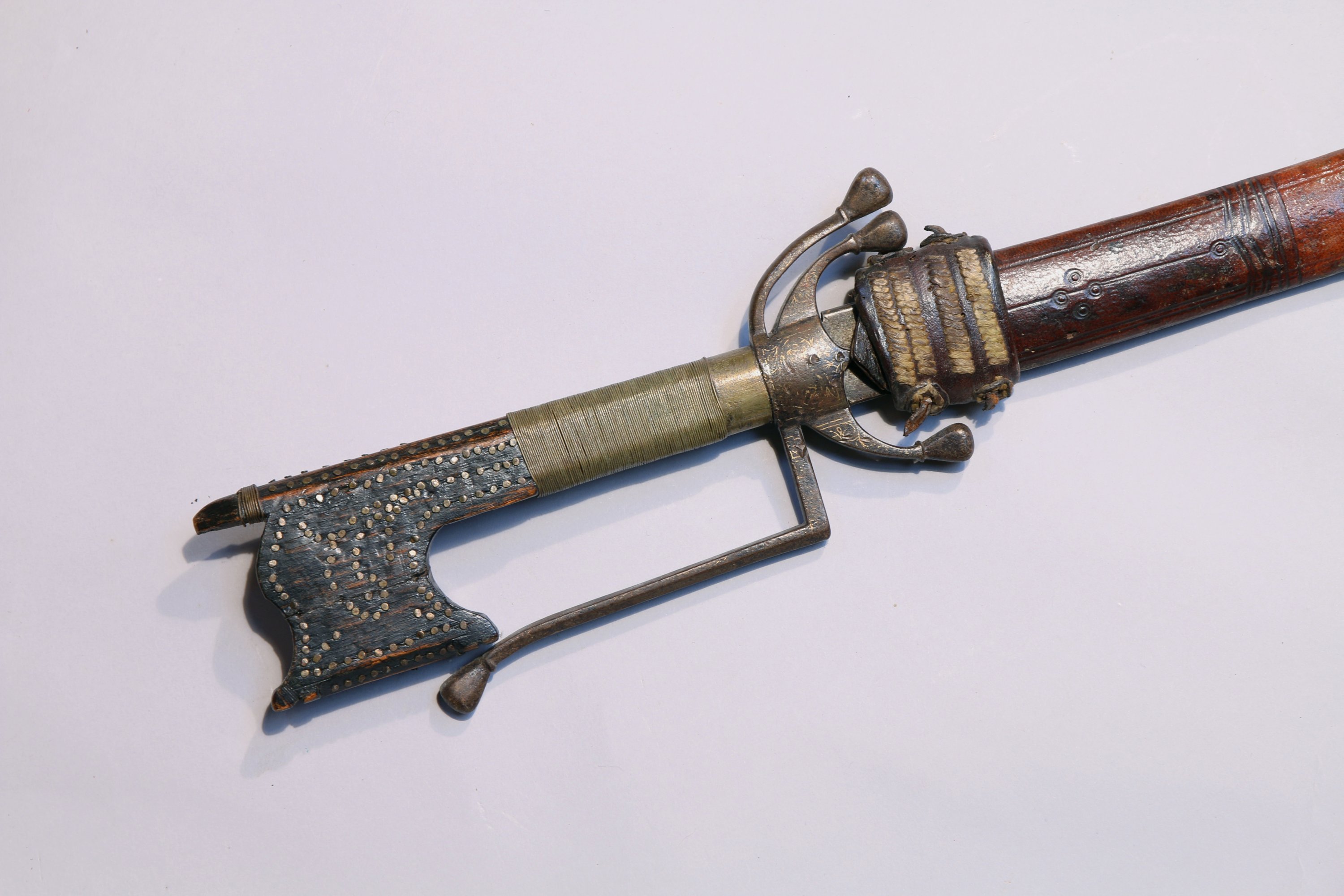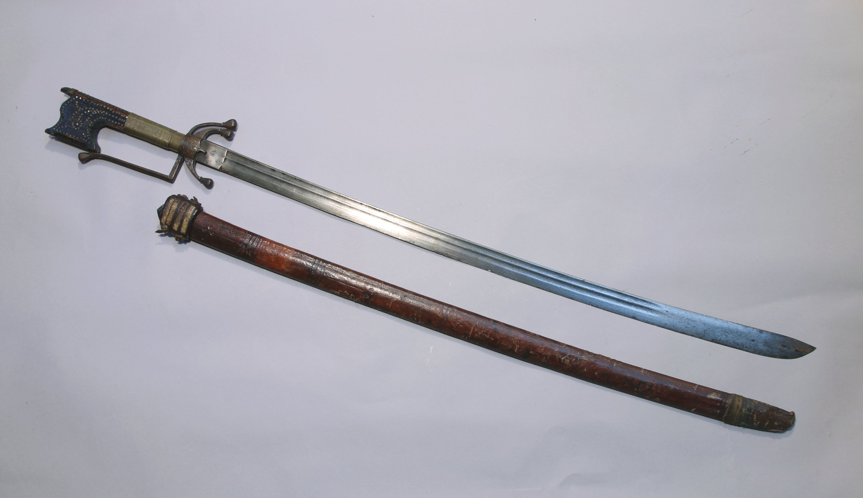 - Nimcha, poignée en bois laquée noir cloutée et filigranée de laiton. Garde en fer incrustée de rinceaux or (usures) à triple quillon et une branche. Lame légèrement courbe à double gouttière et contre-tranchant poinçonnée au talon. Fourreau en cuir.
