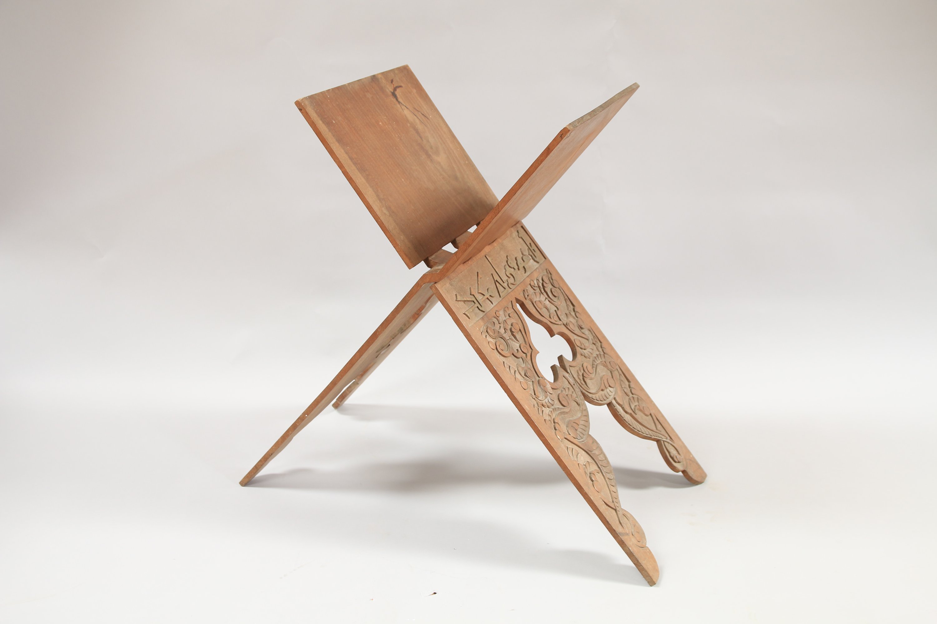 Porte-Coran kursi à décor de palmettes et d’inscription en bois sculpté d’un décor de palmettes autour d’une arcature fleuronnée et surmonté d’une inscription en arabe coufique fleuri rehaussée de dorure.