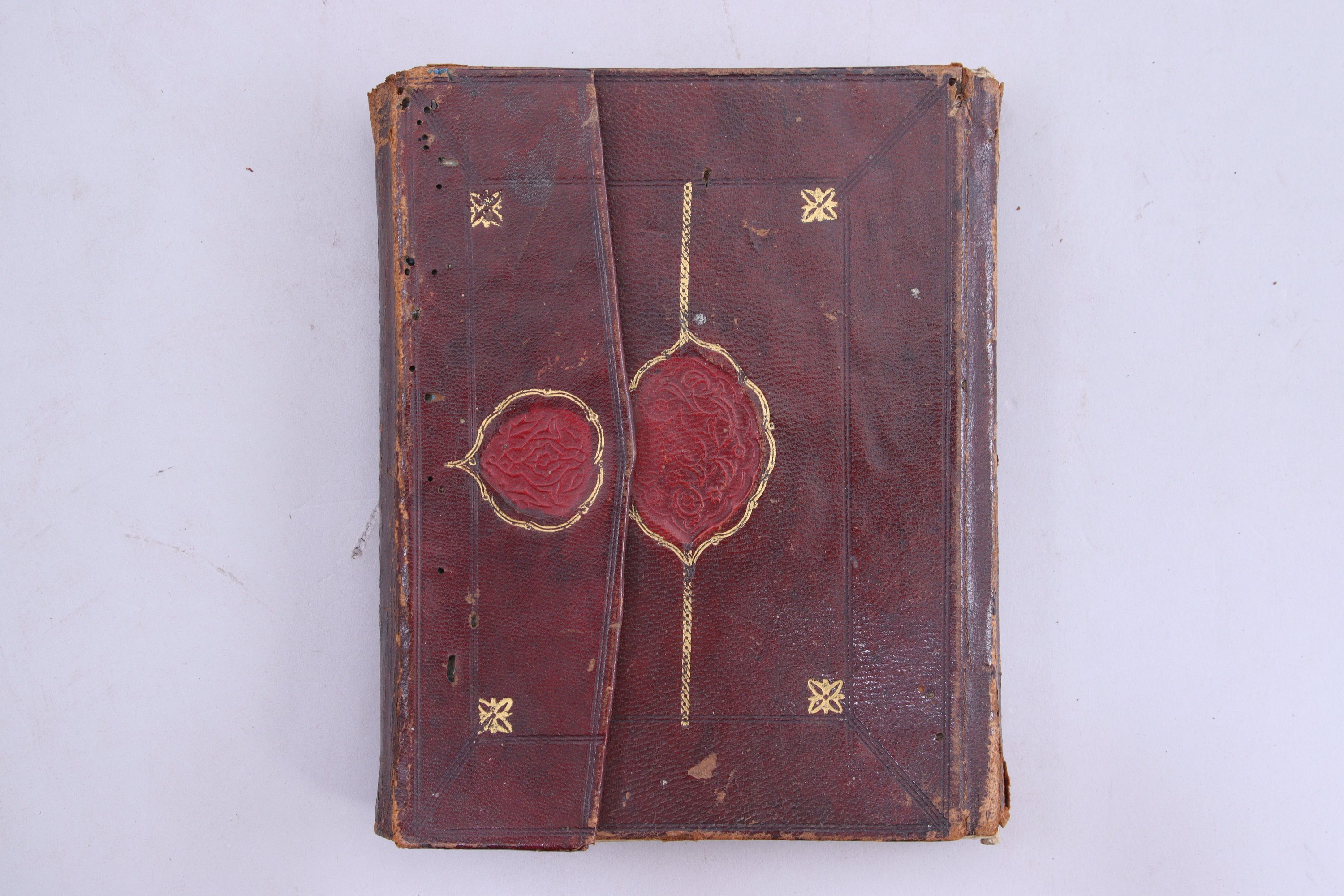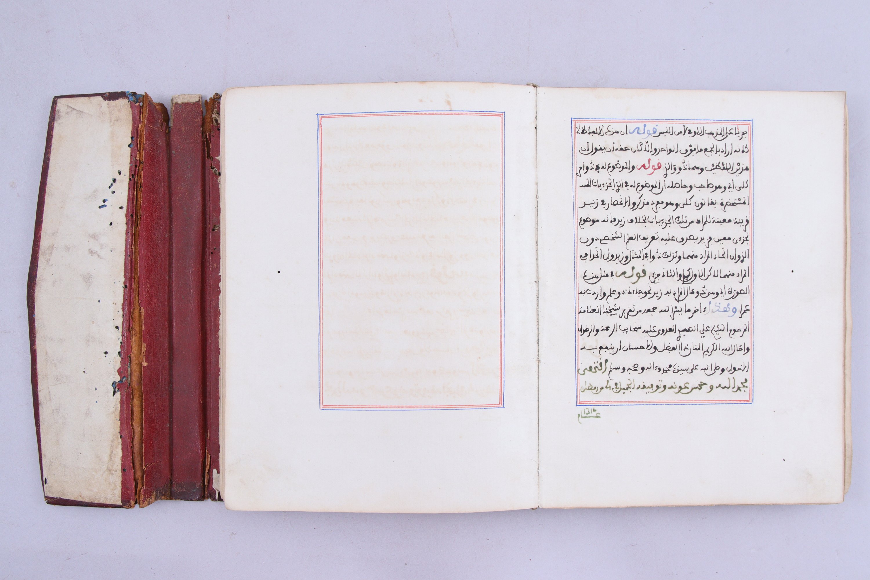 Manuscrit composite sur papier de 15 lignes de texte par page en arabe maghribi à lencre noire, quelques mots aux encres bleue, rouge ou verte. Plusieurs sections de plusieurs mains différentes. Le texte principal daté du 4 Ramadan 1314 H / 6 février 1897. En fin douvrage, feuillets dun autre manuscrit portant un nom de copiste Muhammad ibn Abd al-Qader ibn Ali ibn Yusuf al-Fasi ainsi que les dates de 25 Shaban 1071 / 25 avril 1661 et de Dhou al-Qaada 1281 H / 1864. Une note manuscrite ajoutée postérieurement en tête douvrage indique quil sagit dun commentaire de la Risalat al-Wada. Reliure à rabat en maroquin grenat à décor estampé dun médaillon polylobé garni de rinceaux floraux et aux contours et écoinçons rehaussés de dorure.