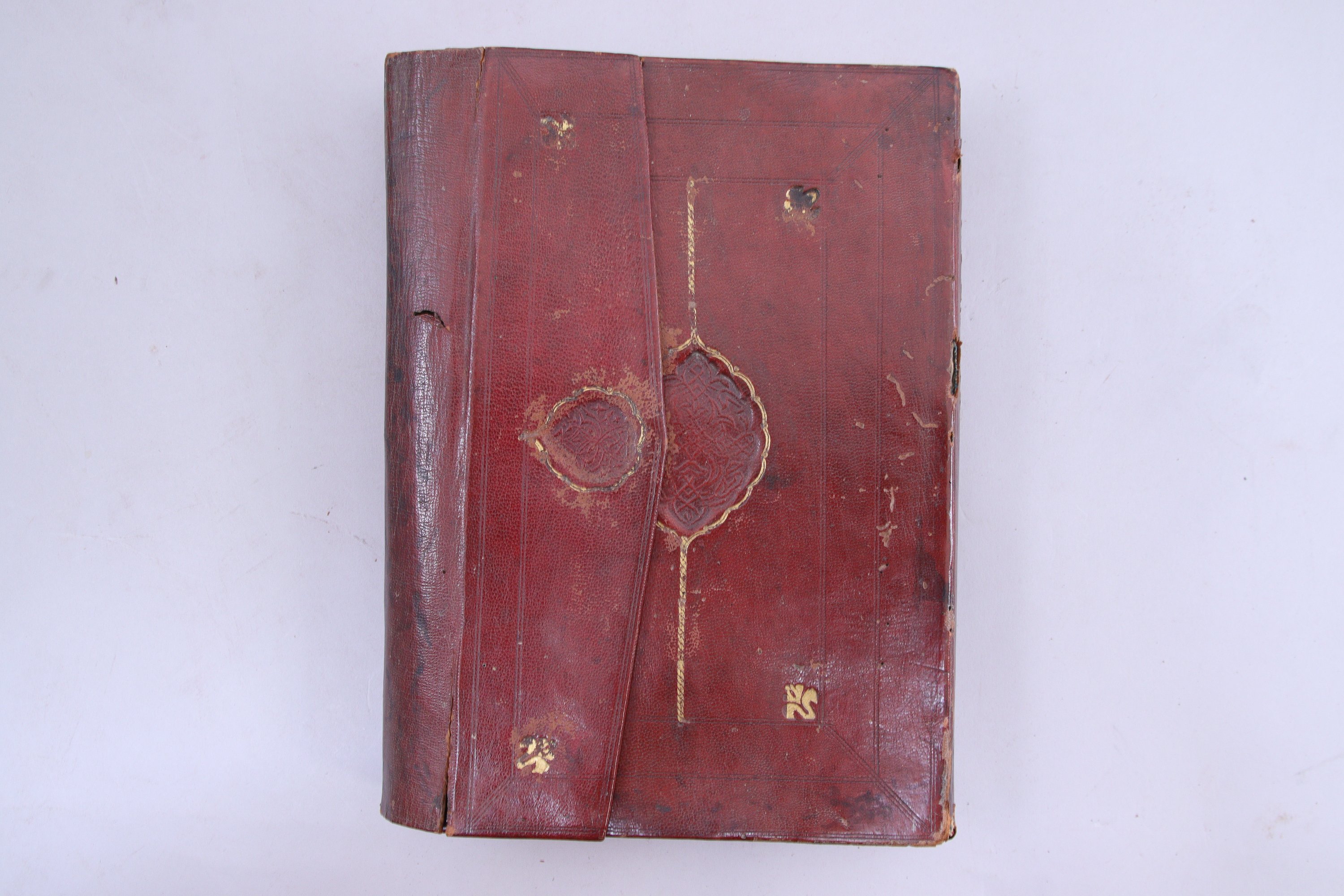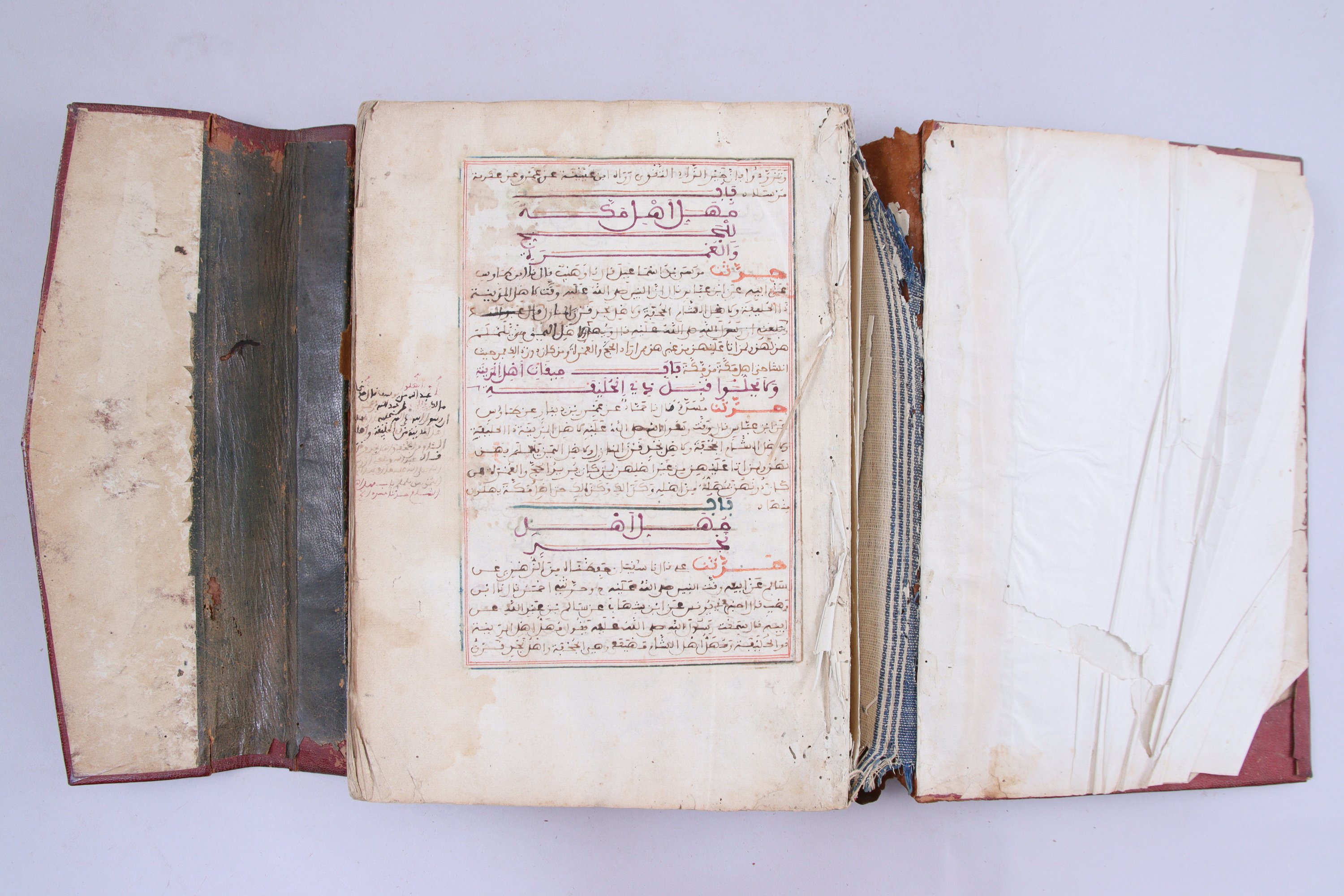 Manuscrit incomplet sur papier de 25 lignes par page en arabe, en écriture maghribi, à lencre brune, quelques termes aux encres rouge, bleue, mauve. Titre inscrit à lencre sur la tranche. Reliure à rabat en maroquin grenat à décor estampé puis rehaussé dor dun médaillon garni de rinceaux et de fleurons dans les écoinçons et sur le dos du rabat.