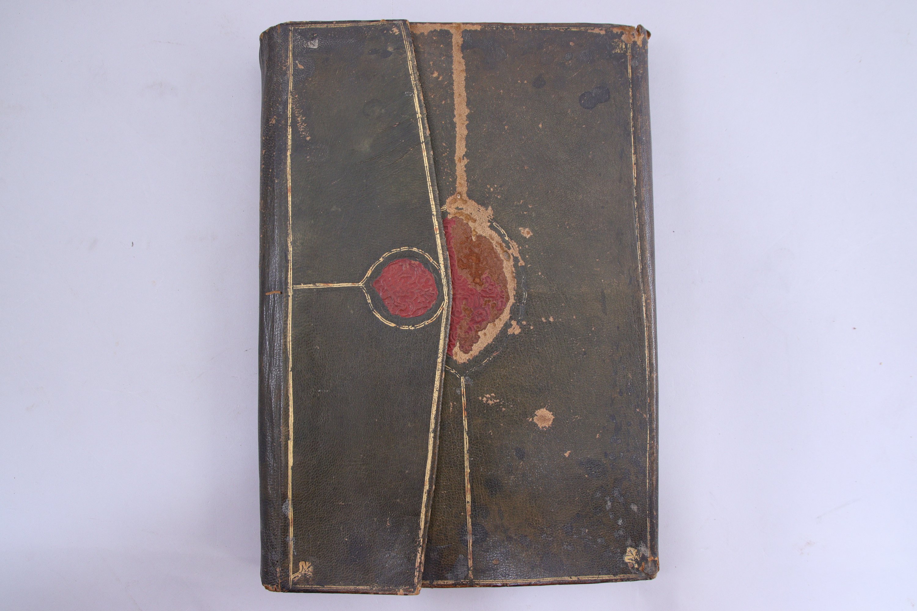 (En létat, folios détachés de la reliure, trous de vers, papier se décomposant en bordure, folios dun autre manuscrit à lintérieur, reliure usée).