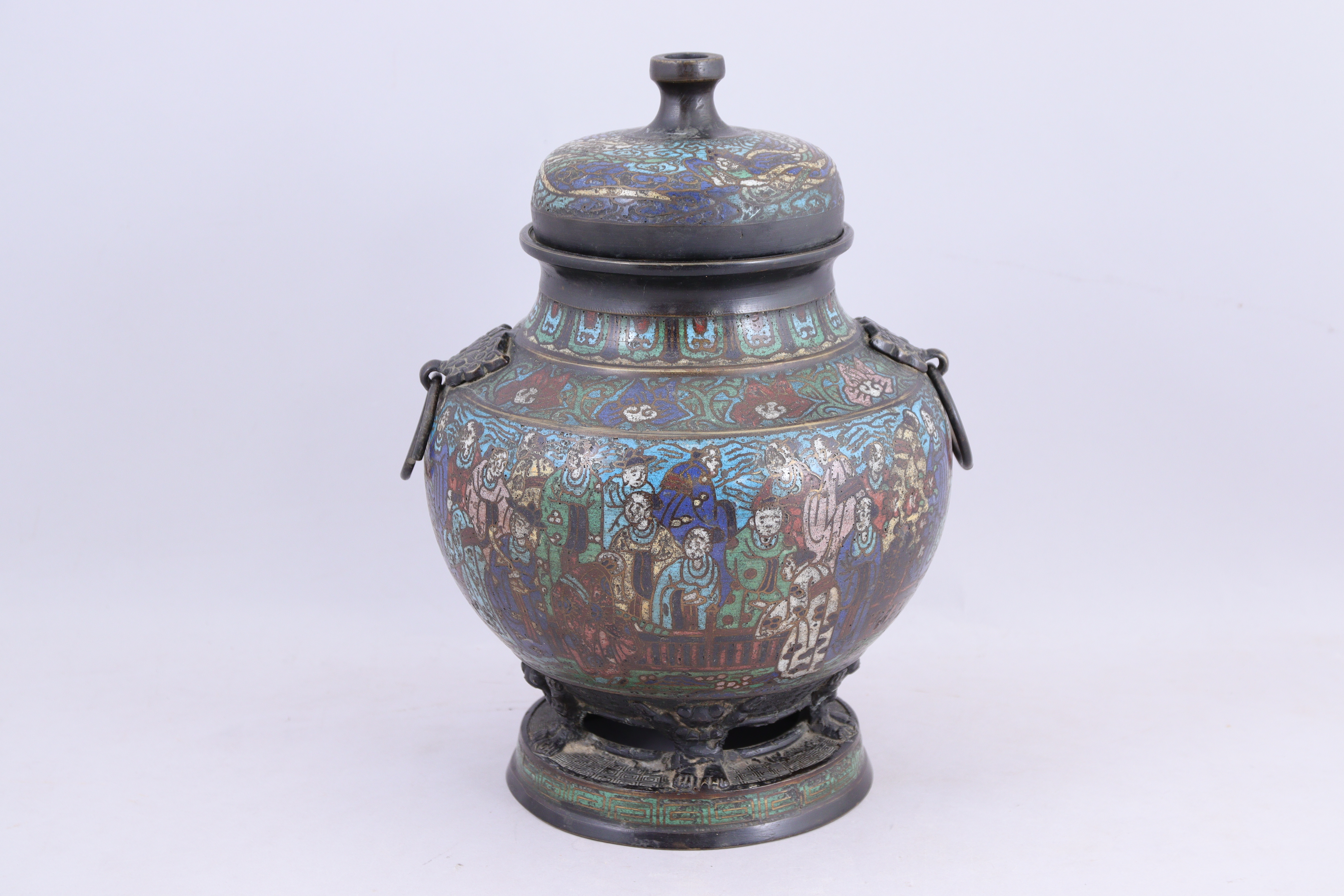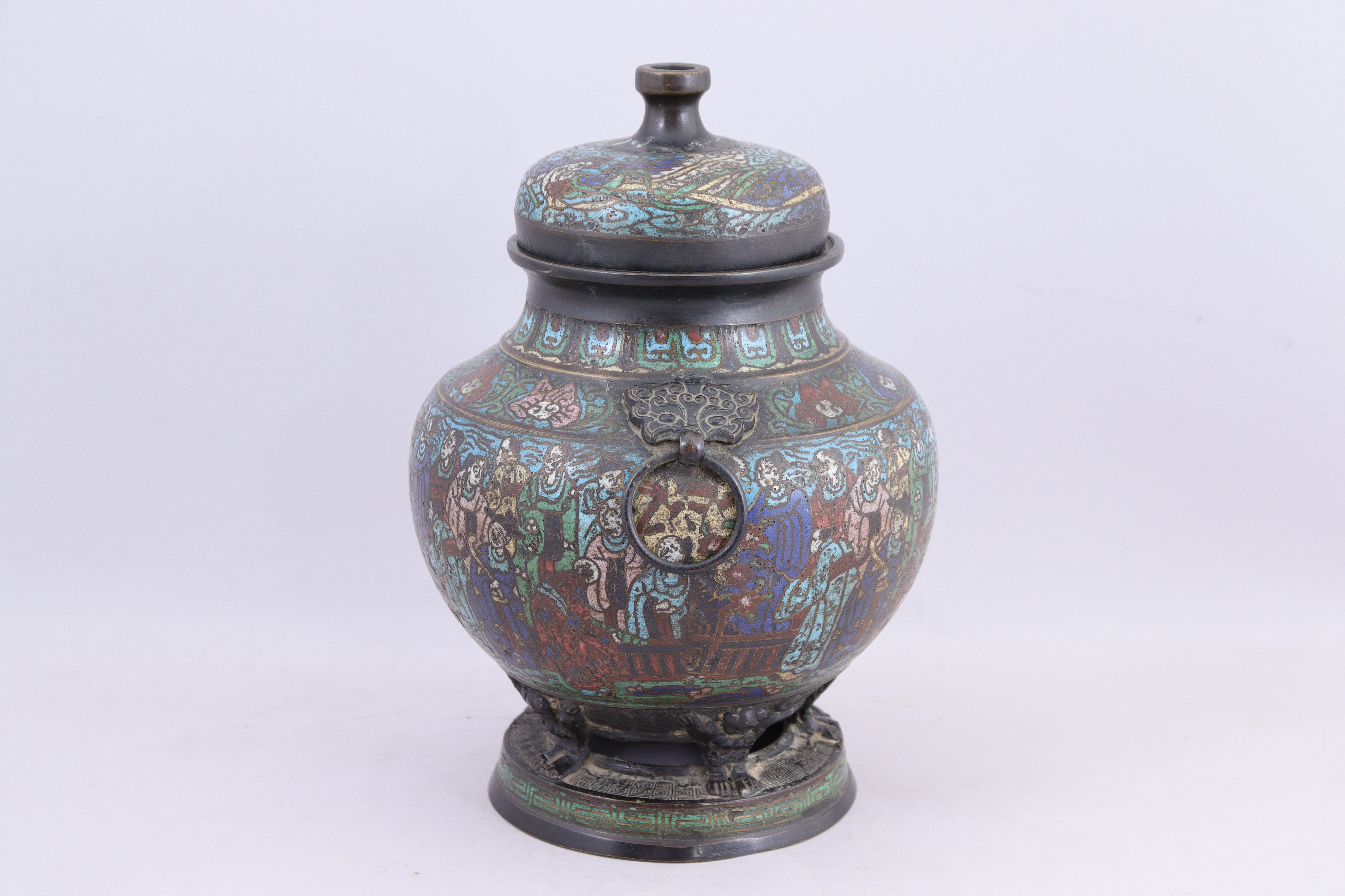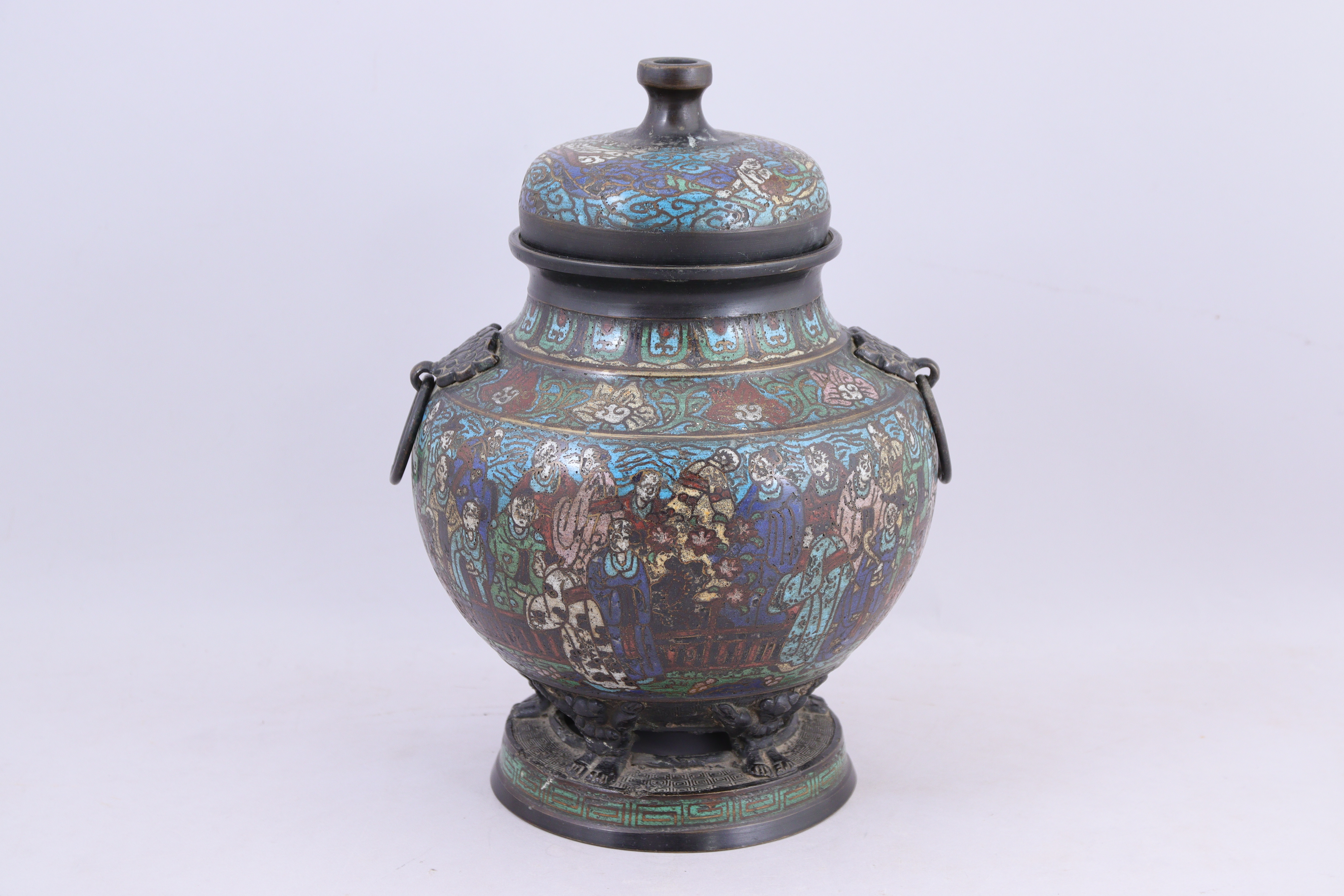 en émaux cloisonnés polychromes à décor de personnages, frises et fleurs, sur cinq pieds et anses en forme de têtes d'animaux.